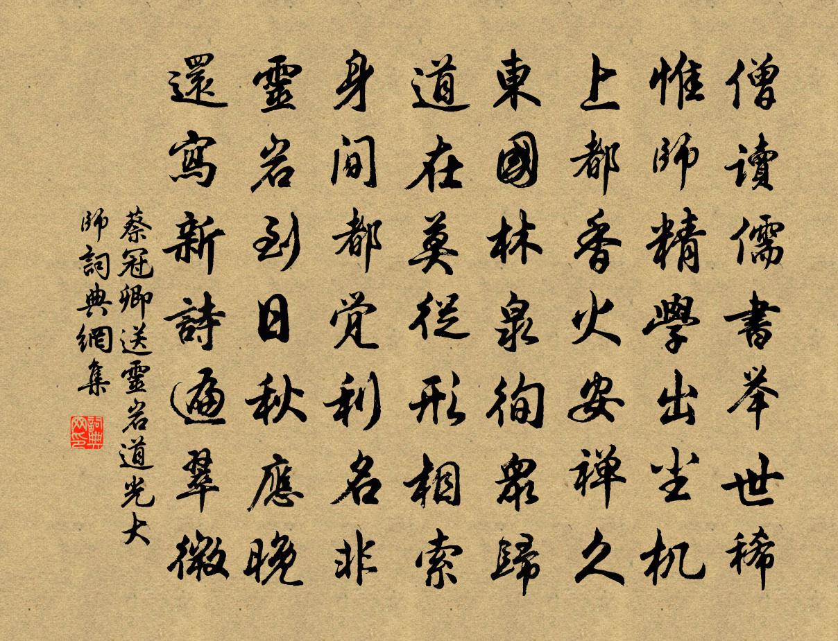 詩詞名句歷史字典書法欣賞書法字典國語詞典說文解字康熙字典古漢語字典標 題 作 者 詩 句 送靈岩道光大師作者:蔡冠卿 朝代:宋代送靈岩道光大師原文僧讀儒書舉世稀,惟師精學出塵機。上都香火安禪久,東國林泉徇眾歸。道在莫從形相索,身間都覺利名非。靈岩到日秋應晚,還寫新詩遍翠微。詩詞問答問:送靈岩道光大師的作者是誰?答:蔡冠卿問:送靈岩道光大師寫於哪個朝代?答:宋代問:送靈岩道光大師是什麼體裁?答:七古蔡冠卿送靈岩道光大師書法欣賞送靈岩道光大師書法作品詩詞推薦曝書袁說友〔宋代〕紅日庭初熭,青編手自摩。烏踆浮竹簡,魚蠹眩陽和。眼恨頻催老,書慚未觸多。相看不相棄,同老故山阿。粉蝶兒姬翼〔元代〕薄利浮名,抵死向前忙乾。更光陰、暗中催斷。傀儡棚,詳*弄,般成公案。下場時,盡盧都、不堪重看。風遞晨題王敬仲野亭戴表元〔宋代〕王家野亭蒼翠邊,秋山萬疊相鉤連。披衣曉霽伴雲坐,散發夜涼須月眠。主人清豪亦好客,常有車蓋來翩翩。門間自湘源至潭州衡山縣宋之問〔唐代〕浮湘沿迅湍,逗浦凝遠盼。漸見江勢闊,行嗟水流漫。赤岸雜雲霞,綠竹緣溪澗。向背群山轉,應接良景晏。沓障送薛宗孺通理并州蘇頌〔宋代〕河東望族衣冠盛,漢署潛郎閥閱優。久擅才名宜治劇,又分朝寄去監州。民風近古藩房肅,邊候無塵戍役休。元帥送單少府赴扶風李端〔唐代〕少年趨盛府,顏色比花枝。范匄非童子,楊修豈小兒。叨陪丈人行,常恐阿戎欺。此去雲霄近,看君逸足馳。過湖口縣上下石鍾山,即東坡所記者,是夕宿楊萬里〔宋代〕上鍾山,下鍾山,兩鍾甬大何處懸。滄波作杵天作虡,懸在江湖都會間。蜀江西來一萬里,章江南來會於此。更著謝吳秘丞作石屏集後序戴復古〔宋代〕說破當年舊石屏,自慚無德又無能。鄉來江海疏狂客,今作山林老病僧。高臥一樓成宇宙,冷看獨影當賓朋。惡詩句李壁〔宋代〕莫令歸往地,翻作殺胡林。代梁總挽鄭舜舉侍郎四首劉宰〔宋代〕慷慨論交酒一鍾,別來木末幾西風。歸歟擬趁雞豚社,太息無因見此公。絕句一首蘇軾〔宋代〕蒙蒙春雨濕邗溝,篷底安眠晝擁裘。知有故人家在此,速將詩卷洗閒愁。問春邵雍〔宋代〕三月春歸留不住,春歸春意難分付。凡言歸者必歸家,為問春家在何處。題漁溪驛蔡襄〔宋代〕昔年同向臘中回。曾繞欄乾折早梅。今日獨來攀舊樹,風翻黃葉下蒼苔。擢第後入蜀經羅村,路見海棠盛開偶有題詠鄭谷〔唐代〕上國休夸紅杏艷,深溪自照綠苔磯。一枝低帶流鶯睡,數片狂和舞蝶飛。堪恨路長移不得,可無人與畫將歸。手中北高峰徐集孫〔宋代〕閒處春光淡,逢僧共采蒿。曲盤山磴險,直上塔峰高。風露侵衣冷,江湖送眼豪。近年無隱者,空負數株桃。重懷和靖林逋宋祁〔宋代〕高士非求死,天教隕少微。雲疑隱居在,猶傍嶺頭歸。柳姜特立〔宋代〕長條攀折嘆離披,底事人間管別離。何惟龍津能御氣,建章宮裡斗腰支。夏日宋伯仁〔宋代〕數點沙鷗掠野塘,雨聲初歇水微茫。橋邊十里荷花盪,輸與漁人臥晚涼。績和李參政湖上雜詠魏了翁〔宋代〕人心不可欺,好好而惡惡。利慾怵迫之,本心月以落。所以古之人,憂在晉其角。宮詞四首劉克莊〔宋代〕涼殿吹笙露滿天,木犀花發月初圓。君王少御珊瑚枕,多就宮人玉臂眠。名句推薦明月出天山,蒼茫雲海間。李白《關山月》 相知無遠近,萬里尚為鄰。張九齡《送韋城李少府》 年年今夜,月華如練,長是人千里。范仲淹《御街行·秋日懷舊》 白毛浮綠水,紅掌撥清波駱賓王《詠鵝》 抽刀斷水水更流,舉杯消愁愁更愁。李白《宣州謝朓樓餞別校書叔雲》 一聲梧葉一聲秋,一點芭蕉一點愁,三更歸夢三更後。徐再思《水仙子·夜雨》 唯有相思似春色,江南江北送君歸。王維《送沈子歸江東 / 送沈子福之江東》 遠樹帶行客,孤城當落暉。王維《送綦毋潛落第還鄉 / 送別》 莫之大禍,起於須臾之不忍,不可不謹。王永彬《圍爐夜話·第一六六則》 飛鳥盡,良弓藏;狡兔死,走狗烹。司馬遷《史記·越王勾踐世家》