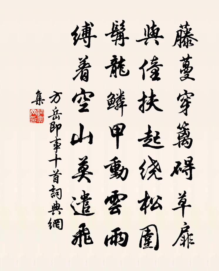 詩詞名句歷史字典書法欣賞書法字典國語詞典說文解字康熙字典古漢語字典標 題 作 者 詩 句 即事十首作者:方岳 朝代:宋代即事十首原文藤蔓穿籬礙草扉,與僮扶起繞松圍。髯龍鱗甲動雲雨,縛著空山莫遣飛。詩詞問答問:即事十首的作者是誰?答:方岳問:即事十首寫於哪個朝代?答:宋代方岳即事十首書法欣賞即事十首書法作品詩詞推薦有感十首吳芾〔宋代〕漠漠黃雲塞草低,南人空說翠輿歸。孤臣淚盡仍嘗膽,白首江湖雁北飛。浣溪沙吳潛〔宋代〕春岸春風荻已芽。推排春事到蘆花。只應推上鬢邊華。投老未歸真左計,久陰得霽且舒懷。紅紅白白有殘葩。絕句歐陽鈇〔宋代〕桑麻得雨更青蔥,芍藥留春結晚紅。怪得鳥聲如許好,此身還在亂山中。和人回文五首蘇軾〔宋代〕蛾翠斂時聞燕語,淚珠彈處見鴻歸。多情妾似風花亂,薄倖郎如露草曦。禪人並化主寫真求贊釋正覺〔宋代〕木石形骸,冰雪肝膽。一點妙難名,十方機未感。寒林搖落兮誰捋老虎之須,滄海潮乾兮誰探老驪之頷。句元絳〔宋代〕小雨疏疏向晚晴。題壺山翁承贊〔唐代〕井邑斜連北,蓬瀛直倚東。秋高岩溜白,日上海波紅。暑酌趙汝鐩〔宋代〕天高殊未雨,暑盛絕無風。將酒渠心浸,有泉林下通。擘蓮房拍寒,雪藕孔玲瓏。量淺難禁醉,扶歸兩小童。沁園春汪莘〔宋代〕流水小橋,茅屋竹窗,紙帳 * 。把坎宮閉了,虎龍吟嘯,離宮鎖定,日月迴環。萬點星飛,兩輪電轉,五色圓光漁父辭毛直方〔宋代〕本無租賦本無田,不知曆日不知年。誰信漁家小船上,猶是無懷並葛天。詠貧士 其五陶淵明〔魏晉〕袁安困積雪,邈然不可乾。阮公見錢入,即日棄其官。芻槁有常溫,采莒足朝餐。豈不實辛苦,所懼非饑寒。貧富和闕乾雪中韻李曾伯〔宋代〕青女欺寒未肯霜,先將銀鑠散祥光。芙蓉曉院不禁老,檐蔔滿林惟欠香。冷入寶環銷翠羽,聲隨石鼎煮羊腸。兔園端明殿學士張公輓詞樓鑰〔宋代〕昔幸參朝列,於公更有連。規橅包世界,風義薄雲天。送別詩猶在,貽書墨尚鮮。偉人無復見,惟務寶青氈。挽閩漕章吏部二首劉克莊〔宋代〕昔我如冰冷,惟公獨歲寒。杯難洗馬鬣,篋尚寶龍團。吟筆兄誰和,調琴予忍彈。蟆陵百餘里,欲往愧衰殘。晚至村家文同〔宋代〕高原磽确石徑微,籬巷明滅余殘暉。舊裾飄風采桑去,白袷卷水秧稻歸。深葭繞澗牛散臥,積麥滿場雞亂飛。前溪醉落魄(賦石榴花)程垓〔宋代〕夏圍初結。綠深深處紅千疊。杜鵑過盡芳菲歇。只道無春,滿意春猶愜。折來一點如猩血。透明冠子輕盈貼。芳心江樓二首韓偓〔唐代〕夢啼嗚咽覺無語,杳杳微微望煙浦。樓空客散燕交飛,江靜帆飛日亭午。魚是魚苦筍香味新,楊柳酒旗三月春。風闕題李白〔唐代〕朝披夢澤雲,笠釣青茫茫。暮跨紫鱗去,海氣侵肌涼。 游山遇雨陸游〔宋代〕千秋觀前雨濕衣,石帆山下叩漁扉。鷓鴣苦道行不得,杜鵑更勸不如歸。泛永嘉江日暮回舟張子容〔唐代〕無雲天欲暮,輕鷁大江清。歸路煙中遠,回舟月上行。傍潭窺竹暗,出嶼見沙明。更值微風起,乘流絲管聲。名句推薦東風且伴薔薇住,到薔薇、春已堪憐。張炎《高陽台·西湖春感》 謙謙君子,卑以自牧佚名《易傳·象傳上·謙》 是非成敗轉頭空。楊慎《臨江仙·滾滾長江東逝水》 虢國夫人承主恩,平明騎馬入宮門。張祜《集靈台·其二》 誰家玉笛暗飛聲,散入春風滿洛城。李白《春夜洛城聞笛 / 春夜洛陽城聞笛》 為有雲屏無限嬌,鳳城寒盡怕春宵。李商隱《為有》 東風惡,歡情薄。陸游《釵頭鳳·紅酥手》 惠子曰:子非魚,安知魚之樂?佚名《莊子與惠子游於濠梁》 又是重陽近也,幾處處,砧杵聲催。秦觀《滿庭芳·碧水驚秋》 吾以為古之善者則述之,今之善者則作之,欲善之益多也。墨子《墨子·46章 耕柱》