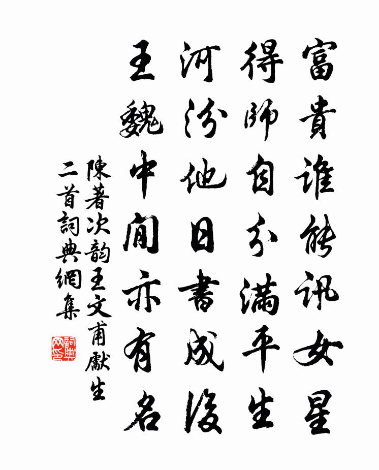 詩詞名句歷史字典書法欣賞書法字典國語詞典說文解字康熙字典古漢語字典標 題 作 者 詩 句 次韻王文甫先生二首作者:陳著 朝代:宋代次韻王文甫先生二首原文富貴誰能訊女星,得師自分滿平生。河汾他日書成後,王魏中閒亦有名。詩詞問答問:次韻王文甫先生二首的作者是誰?答:陳著問:次韻王文甫先生二首寫於哪個朝代?答:宋代陳著次韻王文甫先生二首書法欣賞次韻王文甫先生二首書法作品詩詞推薦餞唐州高使君赴任韋元旦〔唐代〕桐柏膺新命,芝蘭惜舊遊。鳴皋夜鶴在,遷木早鶯求。傳擁淮源路,尊空灞水流。落花紛送遠,春色引離憂。阮郎歸 舟中賦所見陸文圭〔元代〕風吹一捻柳腰輕。春柔力未勝。眉兒喜學遠山青。終朝畫不成。嬌滴滴,笑盈盈。雛鶯葉底聲。花梢雨過夕陽明。湯評事衡水亭會覺禪師皎然〔唐代〕山侶相逢少,清晨會水亭。雪晴松葉翠,煙暖藥苗青。靜對滄洲鶴,閒看古寺經。應憐叩關子,了義共心冥。除夜有懷杜審言〔唐代〕故節當歌守,新年把燭迎。冬氛戀虬箭,春色候雞鳴。興盡聞壺覆,宵闌見斗橫。還將萬億壽,更謁九重城。偈頌一百四十一首釋師範〔宋代〕無味乃真味,真味真無味。若知真味者,更不說真味。曾聞一飽忘百飢,今日山僧身便走。紹興以後祀五方帝六十首佚名〔宋代〕[黃鐘角]蓀無不在,日興我居。孰不可來,肸鄉斯須。象服龍駕,淵淵鼓浮。蓀不汝多,多汝意孚。贈涇州王侍御李頻〔唐代〕一旦天書下紫微,三年旌旆隴雲飛。塞門無事春空到,邊草青青戰馬肥。偈頌一百四十一首釋師範〔宋代〕上元正月半,無油不點燈。誰人知此意,有月上危層。贈鄭吏部王洋〔宋代〕春草牽吟費夢思,一杯相屬重熙怡。誰知道路沫新曆,只覺精劉勝舊時。鳳子即今車接翼,議曹他日政無私。春風浴蠶沙溪水一首為上饒陳烈婦作戴表元〔宋代〕浴蠶沙溪水,採桑玉山巔。絲成白稜稜,膠作烈婦弦。烈婦何所言,弦中意 * 。一說鸞影孤,二訴雛巢穿。巢穿滿戌有日置酒還宮為諸友贈別程公許〔宋代〕左綿山川見寬,周遭四境皆奇觀。廣文官曹冰雪寒,摧風肅雨無時安。巧手無麪良獨難,慚汗如瀋時一歡。浪浪春袷享八首真宗〔宋代〕[大呂角]於穆孝思,嘉主維時。誠通茲格,鹹來燕娭。神之聽之,申錫蕃釐。於萬斯年,永保丕基。蹋莎行(鄭開府出示諸公所賦琵琶詞,即席次韻)史浩〔宋代〕歌舌鶯嬌,舞腰蜂細。華堂是處皆頤指。四弦獨擅席中春,移船出塞聲能繼。慢拈幽情,輕攏柔思。其中有口傳心航海朱繼芳〔宋代〕地角與開倪,茫茫何處期。星回析木次,日掛扶桑枝。沉石尋孤嶼,浮針辨四維。飄然一桴意,持此欲安之。次韻高似之秘書謝薛書記七月二十七日早桂蘇泂〔宋代〕翠蕤低映鬱金裳,昨夜千門萬戶涼。蟾小未禁仙掌露,犀寒先透玉墀霜。喚回臨水登山意,惱亂薰天撲地香。歲歲瑞鶴仙佚名〔宋代〕薰風送炎暑。正萬品亨嘉,恢台當序。祥煙淡天宇。漸銀蟾滿魄,金莖凝露。奎躔壁度。見寒光、凌亂輝吐。記當西江月 托箕仙降筆(原無調名據律補)吳氏女〔元代〕今日瑤池大會,群仙不肯來臨。真筆傳語鄭郎君,記得相嘲妒行。好個木蘭花慢,休題相契分明。君還要問那香魂七月十一日見落葉陸游〔宋代〕葉雕非一日,盛夏則已然,一葉復一葉,及此搖落天。晨起坐堂上,散若飛鳥翩,昔時可藏鴉,今欲不庇蟬。顧視吊老松艾性夫〔宋代〕合梁清廟棟明堂,棄擲終身古道傍。大節不容秦點污,孤根能與宋存亡。山空百丈龍蛇影,泉沁千年琥珀香。韋偃呈子肅三首趙蕃〔宋代〕坊靜行人晝經絕,柳吹黃葉落毿毿。知君不作官居看,陋巷舊諳人不堪。名句推薦門外垂楊岸側,畫橋誰系蘭舟。万俟詠《木蘭花慢·恨鶯花漸老》 風遞幽香出,禽窺素艷來。齊己《早梅》 魏都接燕趙,美女夸芙蓉。李白《魏郡別蘇明府因北游》 春日游,杏花吹滿頭。韋莊《思帝鄉·春日游》 元嘉草草,封狼居胥,贏得倉皇北顧。辛棄疾《永遇樂·京口北固亭懷古》 昨夜醉眠西浦月。今宵獨釣南溪雪。洪适《漁家傲引·子月水寒風又烈》 楓林凋翠,寒雁聲悲。趙長卿《柳梢青·過何郎石見早梅》 春夢隨雲散,飛花逐水流,寄言眾兒女,何必覓閒愁。曹雪芹《紅樓夢·第五回》 君王遊樂萬機輕,一曲霓裳四海兵。李約《過華清宮》 新樣靚妝,艷溢香融,羞殺蕊珠宮女。趙佶《燕山亭·北行見杏花》