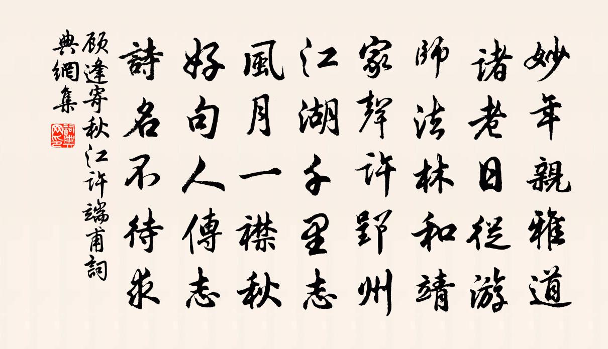 詩詞名句歷史字典書法欣賞書法字典國語詞典說文解字康熙字典古漢語字典標 題 作 者 詩 句 寄秋江許端甫作者:顧逢 朝代:宋代寄秋江許端甫原文妙年親雅道,諸老日從游。師法林和靖,家聲許郢州。江湖千里志,風月一襟秋。好句人傳志,詩名不待求。詩詞問答問:寄秋江許端甫的作者是誰?答:顧逢問:寄秋江許端甫寫於哪個朝代?答:宋代顧逢寄秋江許端甫書法欣賞寄秋江許端甫書法作品詩詞推薦東山丁逢〔宋代〕水繞山圍夏木蒼,舊時賢相讀書堂。窗間遠岫供吟遍,來倚闌乾半月涼。正月十四日小園偶坐舒岳祥〔宋代〕天地元從雪後新,開簾閒坐看回春。謝公夢覺池生草,杜老羹成澗有芹。正是泰和嘉氣象,好調寒暖養精神。花前掛金索佚名〔宋代〕一更里,澄心下手端然坐。趕退群魔,隊隊牡羊過。剔起心燈,照見元初我。方寸玲瓏,寶珠懸一顆。和曾吉父酬鄭顧道韻王洋〔宋代〕古澗久無軒冕夢,茶山參遍古今詩。江湖風月閒天地,不愛牙旗愛酒旗。北亭白居易〔唐代〕廬床山下床州,湓浦沙邊宅。宅北倚高崗,迢迢數千尺。上有青青竹,竹間多白石。茅亭居上頭,豁達門四辟。前和沖公上人韓維〔宋代〕遠色分諸島,清光湛一陂。鳥行排夕照,竹影亂風漪。道體煩摩撮,禪心絕占窺。由來輸范老,佛法不曾知。郡齋移杉韋應物〔唐代〕擢乾方數尺,幽姿已蒼然。結根西山寺,來植郡齋前。新含野露氣,稍靜高窗眠。雖為賞心遇,豈有岩中緣。詰旦思之世豈有不押之韻輒和北山十首劉克莊〔宋代〕姑婦晨妝廢,其他務未遑。愁逢桑葉貴,貧共織燈光。戰士支衣眾,宮嬪剪彩忙。可憐功最大,不待華清湯。與徐溫話別方乾〔唐代〕去去何時卻見君,悠悠煙水似天津。明年今夜有明月,不是今年看月人。汴上送客(一作汴上同楊升秀才送客歸)張祜〔唐代〕河流西下雁南飛,楚客相逢淚濕衣。張翰思歸何太切,扁舟不住又東歸。董逃歌佚名〔魏晉〕承樂世,董逃;游四郭,董逃。蒙天恩,董逃;帶金紫,董逃。行謝恩,董逃;整車騎,董逃。垂欲發,董逃;與題徽宗宸翰康與之〔宋代〕玉輦宸游事已空,尚余奎藻繪春風。年年花鳥無窮恨,盡在蒼梧夕照中。二月十日夜雨起書曾移忠禾譜後趙蕃〔宋代〕去年秋旱冬尤劇,一雪不能濡土瘠。立春日雨雖應時,到今闕然又幾日。遊人但欣春物榮,農夫痛心田未耕。我因水調歌頭(壽陳菊坡樞密卓)陳著〔宋代〕身到紫樞府,一蹴鳳池間。何妨到頭富貴,卻自戀家山。多少名韁利鎖,塵滿霜髯雪鬢,役役不知還。桃李競春事送洛陽張員外姚合〔唐代〕餞客未歸城,東來騶騎迎。千山嵩岳峭,百縣洛陽清。朔雁和雲度,川風吹雨晴。蘚庭公事暇,應只獨吟行。鷓鴣天辛棄疾〔宋代〕桃李漫山過眼空。也宜惱損杜陵翁。若將玉骨冰姿比,李蔡為人在下中。尋驛使,寄芳容。壠頭休放馬蹄松。吾家偈六十三首釋道寧〔宋代〕大家東咬西咬,忽然咬著一個。始知是處綠楊堪系馬,家家門庭透長安。坐斷千聖舌頭,露出平生光彩。莫嫌冷淡月集呼聲妓不至野渡於觴末俾賦詩以紀初集衛宗武〔宋代〕真率盟齊喜有初,崇觴載俎志交孚。共披白帢俱沾醉,獨惜紅裙不愛呼。擬洛耆英宜有詠,班原九老可成圖。從今挽外舅二首許月卿〔宋代〕人間三十二,名字幾千春。慷慨漢遊俠,孝慈周吉人。視物猶視已,顧親寧顧身。山中當出相,嗣子世其仁。枕上鄭剛中〔宋代〕三面屏圍屈曲山,篆爐灰冷柏無煙。霜鐘不管春陽薄,聲到寒窗各夢邊。名句推薦凡斗者,必自以為是而以人為非也。荀子《荀子·榮辱》 江帆幾片疾如箭,山泉千尺飛如電周德清《塞鴻秋·潯陽即景》 蓮朝開而暮合,至不能合,則將落矣王永彬《圍爐夜話·第六九則》 憑高遠望,見家鄉、只在白雲深處。王瀾《念奴嬌·避地溢江書於新亭》 丈夫志,當景盛,恥疏閒。蘇舜欽《水調歌頭·滄浪亭》 爭奈醒來,愁恨又依然朱淑真《江城子·賞春》 為上者疑,為下者懼。上下背德,禍必興焉。來俊臣《羅織經·事上卷第二》 高築牆,廣積糧張廷玉《明史·列傳·卷二十四》 疏籬下、試覓重陽,醉擘青露菊。吳文英《一寸金·秋感》 西風吹老洞庭波,一夜湘君白髮多。唐珙《題龍陽縣青草湖》