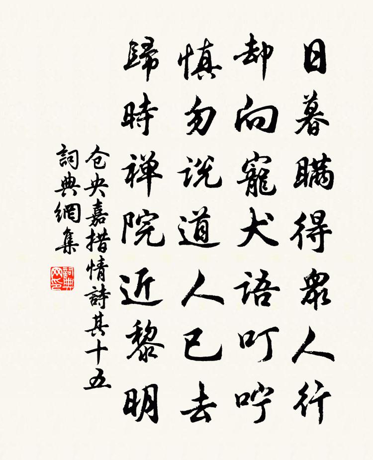 詩詞名句歷史字典書法欣賞書法字典國語詞典說文解字康熙字典古漢語字典標 題 作 者 詩 句 情詩其十五作者:倉央嘉措 朝代:清代情詩其十五原文日暮瞞得眾人行,卻向寵犬語叮嚀。慎勿說道人已去,歸時禪院近黎明。詩詞問答問:情詩其十五的作者是誰?答:倉央嘉措問:情詩其十五寫於哪個朝代?答:清代問:情詩其十五是什麼體裁?答:七絕倉央嘉措情詩其十五書法欣賞情詩其十五書法作品詩詞推薦春日宿信安張明府廳趙湘〔唐代〕夕景含鍾露欲零,幽人醉宿長官廳。床頭蘚色雖連月,池底花陰更雜星。梧葉乍題無物汙,蜀琴微響有風經。陶公總講師涅磐台黃庚〔宋代〕莫將生死視如來,要看蓮花火裹開。勘到灰飛煙滅處,涅磐不是涅磐台。西過渭州,見渭水思秦川岑參〔唐代〕渭水東流去,何時到雍州。憑添兩行淚,寄向故園流。頌古六首釋崇岳〔宋代〕地獄天堂,八字打開,誰知無去亦無來。若言已得三禪樂,未免將身自活埋。悼室人詩江淹〔南北朝〕適見葉蕭條。已復花庵郁。帳里春風盪。檐前還燕拂。垂涕視去景。摧心向徂物。今悲輒流涕。昔歡常飄忽。幽情因何吟邵雍〔宋代〕梅因何而酸,鹽因何而鹹。茶因何而苦,薺因何而甘。過南墅懷寒岩二首釋善珍〔宋代〕年年散粟出朱門,狗盜雞鳴總受恩。空有玉棺歸碧落,更無紅粉哭黃昏。遍行苔蘚尋陳跡,擬倩梅花招醉魂。常恐奉和御製讀陳書夏竦〔宋代〕靈洗雖驍勇,忠規詎可輕。石城嘗力戰,黟歙本連盟。京口殊動茂,臨川叛寇驚。既能明號令,何惜霧寬玉。和正仲君子泉舒岳祥〔宋代〕脈來層嶂遠,影到片天清。洗硯雲根起,歸瓢乳味盈。岩花蒙潤澤,水草見分明。已遂投簪志,何須起濯纓。奉送真歇禪師往住阿育山兼簡黃檗雲峰諸老張元乾〔宋代〕時流罕識真,特立取眾忌。不有明眼人,誰止萬口沸。古今冠蓋場,毀譽固一致。胡為空門中,生滅亦滋熾。更憐偈頌一百四十一首釋師範〔宋代〕貍奴白牯,相共證明,大難大難。碧眼黃頭,亦須莽鹵。黃連甜,甘草苦,發機須千鈞弩。出典宣城三首李含章〔宋代〕戛雲秋翼健磨天,九萬修程孰可肩。五馬幸歸鄉國路,百城初認釣魚船。餘霞綺閣方池上,宿靄人家疊嶂前。多感駒支不屈於晉左丘明〔先秦〕會於向,將執戎子駒支。范宣子親數諸朝。曰:“來,姜戎氏。昔秦人迫逐乃祖吾離於瓜州,乃祖吾離被苫蓋,蒙次韻何吉老游金鑾寺楊時〔宋代〕榮名嗟何為,病木自生癭。彭殤一夢覺,烏用論久頃。寄身淵明廬,翛然在人境。衛生鄙樊雉,放浪任流梗。相忘閻先後朝議園牡丹一本四月始開予與李成季同李復〔宋代〕淺蕊丹葩不自持,紛紛競鬥早春時。高情獨負無人識,落盡群花晚始知。無夢令侯善淵〔元代〕故友全無一信。獨坐古岩誰問。回首返江鄉,散瑞漂萍相近。愁恨。愁恨。一葉風帆輕送。【仙呂】三番玉樓人佚名〔元代〕風擺檐間馬,雨打響碧窗紗。枕剩衾寒沒亂煞,不著我題名兒罵,暗想他,暗想他,忒情雜。等來家,好生的歹鬥冬至日作蘇轍〔宋代〕羲和飛轡留不住,小兒逢節喜欲舞。人言老翁似小兒,烝豚釀酒多為具。潁川本自非吾鄉,鄰里十年成舊故。誰令北都春日漫書強至〔宋代〕蓬鬢雙侵京國塵,花枝五別故園春。曉鶯莫漫驚遊宦,夜鶴多應怨主人。日月名遲愁攬鏡,江湖興在憶垂綸。天邊放歌行陸游〔宋代〕少年不知老境惡,意謂長如少年樂,朝歌夜舞狂不休,逢人慾覓長生藥。三二十年底難過,屈指朋儕余幾個?就令名句推薦欲吊沉累無所,但有漁兒樵子,哀此寫離憂。張孝祥《水調歌頭·過岳陽樓作》 懷君屬秋夜,散步詠涼天。韋應物《秋夜寄邱員外 / 秋夜寄丘二十二員外》 芙蓉金菊斗馨香。天氣欲重陽。晏殊《訴衷情·芙蓉金菊斗馨香》 若似月輪終皎潔,不辭冰雪為卿熱。納蘭性德《蝶戀花·辛苦最憐天上月》 五更鼓角聲悲壯,三峽星河影動搖。杜甫《閣夜》 量入以為出戴聖《禮記·王制》 雁柱十三弦,一一春鶯語。歐陽修《生查子·含羞整翠鬟》 行得春風,指望夏雨馮夢龍《警世通言·卷二十五》 經傳之文,賢聖之語,古今言殊,四方談異也。王充《論衡·卷三十·自紀篇》 凍雲宵遍嶺,素雪曉凝華。李世民《望雪》
