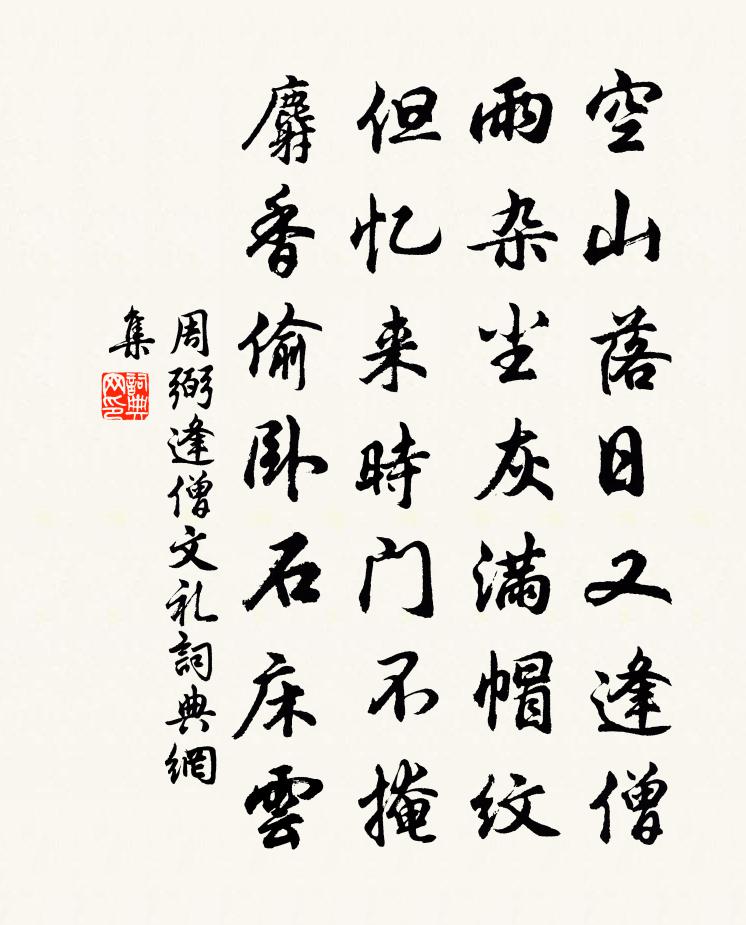 詩詞名句歷史字典書法欣賞書法字典國語詞典說文解字康熙字典古漢語字典標 題 作 者 詩 句 逢僧文禮作者:周弼 朝代:宋代逢僧文禮原文空山落日又逢僧,雨雜塵灰滿帽紋。但憶來時門不掩,麝香偷臥石床雲。詩詞問答問:逢僧文禮的作者是誰?答:周弼問:逢僧文禮寫於哪個朝代?答:宋代周弼逢僧文禮書法欣賞逢僧文禮書法作品詩詞推薦游頭陀寺上方項斯〔唐代〕高步陟崔嵬,吟閒路惜回。寺知何代有,僧見梵天來。暮靄連沙積,餘霞遍檻開。更期招靜者,長嘯上南台。天上謠李賀〔唐代〕天河夜轉漂回星,銀浦流雲學水聲。玉宮桂樹花未落,仙妾采香垂佩纓。秦妃捲簾北窗曉,窗前植桐青鳳小。王子賦得寒蛩耿湋〔唐代〕爾誰造,鳴何早,趯趯連聲遍階草。復與夜雨和,遊人聽堪老。滕王閣蔡戡〔宋代〕傑閣崢嶸枕古城,公餘扶病一登臨。西山拄笏增詩興,南浦飛帆動客心。白鳥去邊迎落日,青林斷處認遙岑。摩挲送史同叔司直造朝孫應時〔宋代〕天壤王郎子,芝蘭謝傅家。班行想風采,詩禮倍光華。萬里鞭先著,連城玉未瑕。中朝呂范氏,端的有餘師。游洞霄宮余愚〔宋代〕琳宮勝處絕塵囂,千古佳名號洞霄。地鎖九峰形屈曲,擎天一柱勢岧嶢。鳳鳴怪石仙岩邃,蛟舞流泉澗壑遙。幸有再次韻白誑簡賓王二首陳造〔宋代〕庾郎胸次枉堆愁,馮衍才名迄不投。歸去來兮歲華晚,末如何矣鬢毛秋。令威心事千年鶴,張翰生涯一葉舟。回首超化雲山沈說〔宋代〕入門松作徑,步步接秋陰。山帶孤城起,雲歸古殿深。隔池聞鶴唳,倚樹看僧吟。笑指煎茶處,青煙出竹林。赤谷杜甫〔唐代〕天寒霜雪繁,遊子有所之。豈但歲月暮,重來未有期。晨發赤谷亭,險艱方自茲。亂石無改轍,我車已載脂。山深送白雲宣長老釋重顯〔宋代〕鄞江秋晚忽成春,況有台星作主人。去去高攜古刀尺,二千年運續芳塵。寄石隱蒲壽宬〔宋代〕閉門十日雨,破屋砌生苔。此意何人會,抱琴來不來。約友人賞春曾極〔宋代〕人生何事最為親,不看春容不識春。岸柳細搖多意思,野花初綻足精神。精神訓得施為別,意思到時言語新。為報直石頭詩蕭衍〔南北朝〕率土皆王士。安知全高尚。東壟棄黍稷。西遊入卿相。屬逢利建始。投分參末將。尺寸功未施。河山賞已諒。攝官句釋惠崇〔宋代〕中食下林狖,夜禪移塚狐。夜景韋莊〔唐代〕滿庭松桂雨余天,宋玉秋聲韻蜀弦。烏兔不知多事世,星辰長似太平年。誰家一笛吹殘暑,何處雙砧搗暮煙。欲把勿去草王安石〔宋代〕勿去草,草無惡。若比世俗俗浮薄。君不見長安卿家,公卿盛時客如麻。公卿去後門無車,惟有芳草年年佳。又不中渡晚眺韋莊〔唐代〕魏王堤畔草如煙,有客傷時獨扣舷。妖氣欲昏唐社稷,夕陽空照漢山川。千重碧樹籠春苑,萬縷紅霞襯碧天。家寄長安書情許棠〔唐代〕疏散過閒人,同人不在秦。近來驚白髮,方解惜青春。僻寺居將遍,權門到絕因。行藏如此輩,何以謂謀身?水調歌頭(題蒲圻景星亭上慕容宰)盧炳〔宋代〕華亭新偉觀,勝地得高雄。憑欄徒倚要眇,萬里景無窮。好是江流縈繞,那更雲天舒闊,疊嶂倚晴空。眼界無盡藏清風台司馬光〔宋代〕太守金閨客,天朝應對才。非因板輿戀,寧駕使車來。水鑒鍬毫盡,霜鋒錯節開。清風遍千里,不獨此高台。名句推薦今朝有酒今朝醉,明日愁來明日愁。羅隱《自遣》 酒意詩情誰與共?淚融殘粉花鈿重。李清照《蝶戀花·暖雨晴風初破凍》 天南地北雙飛客,老翅幾回寒暑。元好問《摸魚兒·雁丘詞 / 邁陂塘》 平蕪盡處是春山,行人更在春山外。歐陽修《踏莎行·候館梅殘》 黃華自與西風約,白髮先從遠客生。元好問《秋懷》 畫閣朱樓盡相望,紅桃綠柳垂檐向。王維《洛陽女兒行》 命將征西極,橫行陰山側。李白《塞上曲》 愛敬盡於事親,而德教加於百姓,刑於四海孔子及其弟子《孝經·天子》 鄉夢不曾休,惹甚閒愁?忠州過了又涪州。左輔《浪淘沙·曹溪驛折桃花一枝數日零落裹花片投之涪江歌此送之》 莫嫌白髮不思量,也須有、思量去里。辛棄疾《鵲橋仙·送粉卿行》