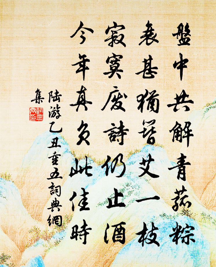 詩詞名句歷史字典書法欣賞書法字典國語詞典說文解字康熙字典古漢語字典標 題 作 者 詩 句 乙丑重五作者:陸游 朝代:宋代乙丑重五原文盤中共解青菰粽,衰甚猶簪艾一枝。寂寞廢詩仍止酒,今年真負此佳時。詩詞問答問:乙丑重五的作者是誰?答:陸游問:乙丑重五寫於哪個朝代?答:宋代問:陸游的名句有哪些?答:陸游名句大全陸游乙丑重五書法欣賞乙丑重五書法作品詩詞推薦題史髯詞卷二首陳造〔宋代〕南風未蟄浙江波,倦客閒愁似許多。安得雙鬟如阿素,紅檀聲里釂金荷。陪杜充張恕鴻慶宮避暑蘇轍〔宋代〕至後雨如瀉,晴來熱更多。簿書沾汗垢,岩石思藤蘿。賴有祠宮靜,時容俗客過。老郎無不可,公子亦能和。道勝元夕方岳〔宋代〕老去歡悰久已無,病來瘦骨不勝扶。山居幸自依青士,身事何曾問紫姑。范以善雲林清遠館張雨〔元代〕華陽范監居幽眇,不到元窗未易逢。山氣半為湖外雨,松聲遙答嶺頭鍾。常聞神女騎龍過,亦有仙人控鶴從。安用次韻題琴譜三首汪炎昶〔宋代〕鐫瓊鏤玉綴為編,積雪涵秋調總全。聽處孰忘身有耳,彈時自以意為弦。大音不泄琴何預,至妙無形操豈傅。忽觸青玉案(和劉長翁右司韻)吳潛〔宋代〕人生南北如歧路。惆悵方回斷腸句。四野碧雲秋日暮。葦汀蘆岸,落霞殘照,時有鷗來去。一杯渺渺懷今古。萬事酬贈李鍊師見招白居易〔唐代〕幾年司諫直承明,今日求真禮上清。曾犯龍鱗容不死,欲騎鶴背覓長生。劉綱有婦仙同得,伯道無兒累更輕。若許和周明瞻秋香五首吳芾〔宋代〕山腰水際有餘青,造物多應特稟靈。桃李無言甘避舍,可憐 * 強儀刑。七十見梅有感陳著〔宋代〕萬木都由冬折磨,孤根卻做老生涯。寒心欲喹知誰主,瘦骨相依有自家。只許江南鴻雁見,肯交春後蝶蜂嘩。風吹和余汝霖雪七絕胡寅〔宋代〕日日東園探早梅,那知一夕萬林開。君詩還似揚州句,掃盡因風柳絮才。自詠白居易〔唐代〕細故隨緣盡,衰形具體微。斗閒僧尚鬧,較瘦鶴猶肥。老遣寬裁襪,寒教厚絮衣。馬從銜草展,雞任啄籠飛。只要丁謂洪咨夔〔宋代〕鶴相專朝巧萬般,中書位子太山安。沂公冷眼旁邊看,機會來時只腳翻。陳平胡宏〔宋代〕陳平相業定何知,應對知君智有餘。不佐漢興三代業,區區心事六奇書。題墨梅袁說友〔宋代〕輕楳拂拂余清,筆下翻成月下橫。昨夜小屏幽夢斷,恍如煙雨瘴江城。懷香爐峰道人貫休〔唐代〕常思峰頂叟,石窟土為床。日日先見日,煙霞多異香。冥心同槁木,掃雪帶微陽。終必相尋去,斯人不可忘。秋賽陸游〔宋代〕柳姑廟前煙出浦,冉冉縈空青一縷;須臾散作四山雲,明日來為社公雨。小巫屢舞大巫歌,士女拜祝肩相摩,芳茶羊叔子畫像王柏〔宋代〕天下三分事未終,已施德惠過江東。誰知叔子深長計,但道中興是茂弘。菩薩蠻(政和壬辰東都作)張元乾〔宋代〕黃鶯啼破紗窗曉。蘭缸一點窺人小。春淺錦屏寒。麝煤金博山。夢回無處覓。細雨梨花濕。正是踏青時。眼前偏少紹熙壬子勸耕妙勝四首陳造〔宋代〕縣曹文墨厭拘纏,野飯山行舊所便。只道窮途難措足,朝來風日為誰妍。借韻書懷戴復古〔宋代〕虛氣撐枯腹,長身到老貧。高吟常駭俗,爛醉若驕人。京洛繁華夢,江湖浩蕩春。布衣如雪白,不受庾公塵。名句推薦羌管悠悠霜滿地,人不寐,將軍白髮征夫淚。范仲淹《漁家傲·秋思》 弱則保命,不可作強;強則斂翼,休求盡善。來俊臣《羅織經·保身卷第七》 刷羽同搖漾,一舉還故鄉。沈約《詠湖中雁》 三冬暫就儒生學,千耦還從父老耕。陸游《觀村童戲溪上》 橫笛驚征雁,嬌歌落塞雲。岑參《奉陪封大夫九日登高》 牆頭馬上遙相顧,一見知君即斷腸。白居易《井底引銀瓶·止淫奔也》 嗟余聽鼓應官去,走馬蘭台類轉蓬。李商隱《無題·昨夜星辰昨夜風》 鮑魚蘭芷,不同篋而藏劉向《說苑·指武》 長太息以掩涕兮,哀民生之多艱。屈原《離騷》 柳岸風來影漸疏,使君家似野人居。杜牧《齊安郡晚秋》