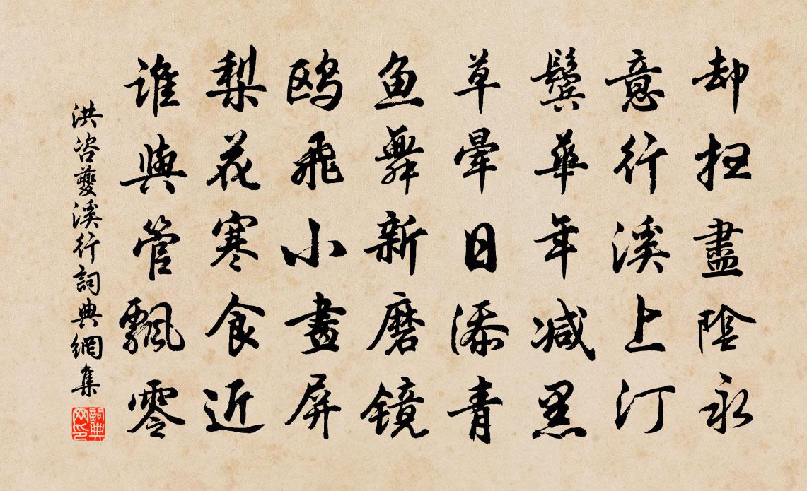 詩詞名句歷史字典書法欣賞書法字典國語詞典說文解字康熙字典古漢語字典標 題 作 者 詩 句 溪行作者:洪咨夔 朝代:宋代溪行原文卻掃盡陰永,意行溪上汀。鬢華年減黑,草暈日添青。魚舞新磨鏡,鷗飛小畫屏,梨花寒食近,誰與管飄零。詩詞問答問:溪行的作者是誰?答:洪咨夔問:溪行寫於哪個朝代?答:宋代洪咨夔溪行書法欣賞溪行書法作品詩詞推薦又於韋處乞大邑瓷碗杜甫〔唐代〕大邑燒瓷輕且堅,扣如哀玉錦城傳。君家白碗勝霜雪,急送茅齋也可憐。喜雨陸游〔宋代〕雨聲蕭蕭集庭樹,雨氣森森入窗戶。玉川茆屋久不葺,破漏無復施床處。我於萬事本悠悠,危坐讀書忘百憂。明朝點絳唇(葛守坐上出此詞,道思歸之意,走筆次其韻)周必大〔宋代〕報答風光,滿傾瓊液休思睡。亂鶯聲碎。來往甘棠底。聞道中和,深簡君王意。歸舟起。到時應是。玉殿槐交翠。如夢令楊韶父〔宋代〕涼月薄陰猶殢。紅豆一枝秋思。門外幾重山,山外行人千里。歸未。歸未。又是菊花天氣。次韻徐贊府蜚英八首方回〔宋代〕懸崖復嶺間岡坡,如此天邊遠碧何。誰道此中曾得句,道傍老樹閱人多。寄題張令陽翟希隱堂梅堯臣〔宋代〕每讀陶潛詩,令人忘世慮。潛本太尉孫,心遠跡亦去。不希五斗粟,自種五株樹。曠然箕山情,復起濠上趣。今時招隱寄李元中黃庭堅〔宋代〕吾聞李元中,學為古人青出藍。眉目之閒如太華,一段翠氣連終南。我欲從之路阻長,朱顏日夜驚波往。蒼梧玉琯菩薩蠻馮延巳〔唐代〕西風裊裊凌歌扇,秋期正與行人遠。花葉脫霜紅,流鶯殘月中。蘭閨人在否,千里重樓暮。翠被已消香,夢隨寒漏句王鎬〔宋代〕催租更擾潘邠老,付麥誰憐石蔓卿。郊廟歌辭。武后大享拜洛樂章。德和佚名〔唐代〕夕惕司龍契,晨兢當鳳扆。崇儒習舊規,偃伯循先旨。絕壤飛冠蓋,遐區麗山水。幸承三聖餘,忻屬千年始。侍宴安樂公主新宅應制沈佺期〔唐代〕皇家貴主好神仙,別業初開雲漢邊。山出盡如鳴鳳嶺,池成不讓飲龍川。妝樓翠幌教春住,舞閣金鋪借日懸。敬從泊上虞驛來日行四首陳造〔宋代〕秋雨歇復下,西風微自涼。不妨舟系柳,已貸汗反漿。句楊介如〔宋代〕酒量吞海,詩肩夜聳山。朝中措(梅月圓)韓淲〔宋代〕為茲春酒壽時翁。我輩一尊同。香動梅梢圓月,年年先得東風。冰溪清淺流環玉,蓮幕漫從容。但願人生長久,揮行香子沈瀛〔宋代〕野叟長年。一室蕭然。都齊收、萬軸牙籤。只留三件,三教都全。時看周易,讀莊子,誦楞嚴。闋會得,萬語千留題常熟頂山僧居范仲淹〔宋代〕平湖數百里,隱然一山起。中有白龍泉,可洗人間耳。吾師仁智心,愛茲山水音。結茅三十年,不道日月深。笑我為鄧子煇賦拙齋釋道璨〔宋代〕歷盡風波覺得獃,全無伎倆口慵開。門前不厭頻來客,要學聰明莫入來。巫山一段雲馬鈺〔元代〕性燭生青焰。心香裊紫煙。命燈結正玉花鮮。慧目看金蓮。此個山侗雅趣。出自風仙師父。一朝九轉大丹成。玉帝衰晚文同〔宋代〕衰晚得洋川,勞生只自憐。文移供盡日,心力付流年。咄咄空書字,便便聲晝眠。其如昏嫁在,了即賦歸田。擊鼓佚名〔先秦〕擊鼓其鏜,踴躍用兵。土國城漕,我獨南行。從孫子仲,平陳與宋。不我以歸,憂心有忡。爰居爰處?爰喪其馬?名句推薦白髮書生神州淚,盡淒涼、不向牛山滴劉克莊《賀新郎·九日》 仙人琪樹白無色,王母桃花小不香。白居易《牡丹芳》 不似當時,小橋沖雨,幽恨兩人知。周邦彥《少年游·朝雲漠漠散輕絲》 長江巨浪征人淚,一夜西風共白頭。宋琬《江上阻風》 來掃千山雪,歸留萬國花。袁枚《春風》 改章難於造篇,易字艱於代句劉勰《文心雕龍·附會》 君子安禮樂利,謹慎而無斗怒,是以百舉而不過也。荀子《荀子·臣道》 淮南秋雨夜,高齋聞雁來。韋應物《聞雁》 山桃紅花滿上頭,蜀江春水拍山流。劉禹錫《竹枝詞·山桃紅花滿上頭》 復值接輿醉,狂歌五柳前。王維《輞川閒居贈裴秀才迪》