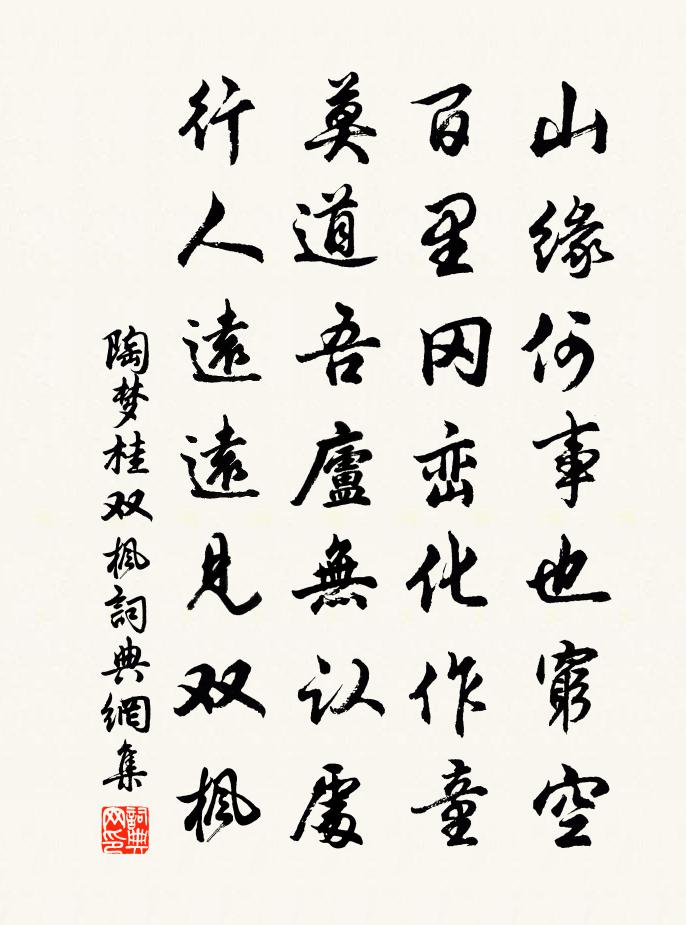 詩詞名句歷史字典書法欣賞書法字典國語詞典說文解字康熙字典古漢語字典標 題 作 者 詩 句 雙楓作者:陶夢桂 朝代:宋代雙楓原文山緣何事也窮空,百里岡巒化作童。莫道吾廬無認處,行人遠遠見雙楓。詩詞問答問:雙楓的作者是誰?答:陶夢桂問:雙楓寫於哪個朝代?答:宋代陶夢桂雙楓書法欣賞雙楓書法作品詩詞推薦池蓮四詠分韻藕劉子翬〔宋代〕密蘊羅文細,明含玉色清。冰盤時薦美,刀惹斷絲輕。頌古一百首釋智愚〔宋代〕鐵壁迸開雲片片,黑出輥出月團團。就中明暗相陵處,天外出頭誰解看。頌古二十九首釋師體〔宋代〕動口生荊棘,移身墮野狐。趙州來鬭富,東壁掛葫蘆。送韋侍御湖南幕府李嘉祐〔唐代〕執憲隨征虜,逢秋出故關。雨多愁郢路,葉下識衡山。地遠從軍樂,兵強分野閒。皇家不易將,此去未應還。逢賈老鄭獬〔宋代〕買得虛名東路歸,自憐鷗鳥本忘機。吾師不用苦迎送,亦是當時一布衣。六州佚名〔宋代〕承天統,聖主應昌辰。寶籙降,飈游至,瑞命慶惟新。崇大號,仰奉高真。獻歲當初吉,天下皆春。謁秘宇、藻衛醉紅妝(中呂調)張先〔宋代〕瓊枝玉樹不相饒。薄雲衣、細柳腰。一般妝樣百般嬌。眉眼細、好如描。東風搖草百花飄。恨無計、上青條。更起登柳州峨山柳宗元〔唐代〕荒山秋日午,獨上意悠悠。如何望鄉處,西北是融州。奚左藏輓詩二首洪咨夔〔宋代〕諸老定交早,群兒驚見稀。功名身韞櫝,翰墨世傳衣。龜壽前占夢,鷗盟晚息機。吳頭耆舊盡,搔首送斜暉。館娃宮殷堯藩〔唐代〕宮女三千去不回,真珠翠羽是塵埃。夫差舊國久破碎,紅燕自歸花自開。頌十玄談玄機釋印肅〔宋代〕迥出三乘不假修,別傳一句普天收。揚眉早是相輕忽,妙得無心了便休。途中遇晴孟浩然〔唐代〕已失巴陵雨,猶逢蜀坂泥。天開斜景遍,山出晚雲低。餘濕猶沾草,殘流尚入溪。今宵有明月,鄉思遠淒淒。滿江紅·倦客新豐辛棄疾〔宋代〕倦客新豐,貂裘敝、征塵滿目。彈短鋏、青蛇三尺,浩歌誰續。不念英雄江左老,用之可以尊中國。嘆詩書、萬卷以採菊東籬下悠然見南山為韻賦十首方回〔宋代〕九日已過一,嘉菊無人采。晴軒醉余芳,賴有我輩在。胸著酒斗許,意闊浩如海。誰能起九原,共與推千載。兒女俞公岩陳摶〔宋代〕萬事若在手,百年聊稱情。他時南嶽去,記得此岩名。去郡三思方岳〔宋代〕我思渤海龔,一語鋤獷俗。竟令隴畝間,刀劍化牛犢。樵民亦人耳,乃不受約束。時時弄梃刃,誰肯繼往躅。歸來了齋自警六首陳瓘〔宋代〕文書難寫伏羲書,字外成篇始見渠。賜也能分可不可,一瓢居士只如愚。酬鄭進士九江新居見寄李鹹用〔唐代〕躡屐扣柴關,因成盡日閒。獨聽黃鳥語,深似白雲間。萍沼寬於井,莎城綠當山。前期招我作,此景得吟還。江樓會飲對月趙汝鐩〔宋代〕層樓畫棟凌霄漢,檻外江流百頃清。無一片雲但秋色,放千里月到天明。喚舟撒網鮮鱗美,擊鼓喧汀宿鷺驚。坐上文宣王及其弟子贊宋高宗〔宋代〕至聖立教,子祺安雅。擅譽魯邦,啟祚鉅野。煒矣風猷,時哉用舍。出倫離類,後學是假。名句推薦自在飛花輕似夢,無邊絲雨細如愁。秦觀《浣溪沙·漠漠輕寒上小樓》 群雞正亂叫,客至雞鬥爭。杜甫《羌村三首·其三》 歲暮遠為客,邊隅還用兵。杜甫《歲暮》 明月幾時有?把酒問青天。蘇軾《水調歌頭·丙辰中秋》 漠漠梨花爛漫,紛紛柳絮飛殘。陳允平《紅林擒近·壽詞·滿路花》 歸雲一去無蹤跡,何處是前期?柳永《少年游·長安古道馬遲遲》 日月忽其不淹兮,春與秋其代序。屈原《離騷》 半竿落日,兩行新雁,一葉扁舟。賀鑄《眼兒媚·蕭蕭江上荻花秋》 不聞不若聞之,聞之不若見之,見之不若知之,知之不若行之。荀子《荀子·儒效》 秦樓月,年年柳色,灞陵傷別。李白《憶秦娥·簫聲咽》
