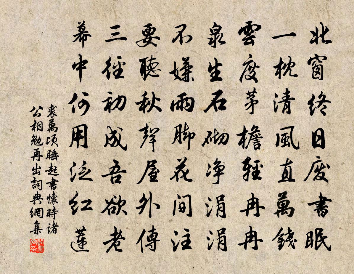 詩詞名句歷史字典書法欣賞書法字典國語詞典說文解字康熙字典古漢語字典標 題 作 者 詩 句 睡起書懷時諸公相勉再出作者:裘萬頃 朝代:宋代睡起書懷時諸公相勉再出原文北窗終日廢書眠,一枕清風直萬錢。雲度茅檐輕冉冉,泉生石砌淨涓涓。不嫌雨腳花間注,要聽秋聲屋外傳。三徑初成吾欲老,幕中何用泛紅蓮。詩詞問答問:睡起書懷時諸公相勉再出的作者是誰?答:裘萬頃問:睡起書懷時諸公相勉再出寫於哪個朝代?答:宋代裘萬頃睡起書懷時諸公相勉再出書法欣賞睡起書懷時諸公相勉再出書法作品詩詞推薦紀事二十四首梁啓超〔清代〕人天去住兩無期,啼鴃年芳每自疑。多少壯懷償未了,又添遺憾到蛾眉。隋王鼓吹曲 出藩曲謝朓〔南北朝〕雲枝紫微內。分組承明阿。飛艎遡極浦。旌節去關河。眇眇蒼山色。沉沉寒水波。鐃音巴渝曲。簫鼓盛唐歌。夫君大駕西幸秋日聞雷貫休〔唐代〕軍書日日催,處處起塵埃。黎庶何由泰,鑾輿早晚回。夏租方減食,秋日更聞雷。莫道蒼蒼意,蒼蒼眼甚開。七月二十七日宋祁〔宋代〕客雁歸何處,寒螿鳴不休。兼之清夜永,副以長年愁。家令有移帶,中郎餘白頭。此懷誠自感,何賴怨高秋。游吳門同樂園疥池光亭壁呈使君張都承武衍〔宋代〕一城和氣萬家春,金碧樓台處處新。太守不孤同樂意,木蘭堂上看遊人。西江月(漁父詞)辛棄疾〔宋代〕千丈懸崖削翠,一川落日鎔金。白鷗來往本無心。選甚風波一任。別浦魚肥堪膾,前村酒美重斟。千年往事已沈沈四怨三愁五情詩十二首並序曹鄴〔唐代〕郁於內者怨也,阻於外者愁也,犯於性者情也。三者有一賊於前,必為顛、為沴、為早死人。鄴專仁誼久矣,有舉上宋使君貫休〔唐代〕折桂文如錦,分憂力若春。位高空倚命,詩妙古無人。有感禾爭熟,無私吏盡貧。野人如有幸,應得見陶鈞。石櫃閣杜甫〔唐代〕季冬日已長,山晚半天赤。蜀道多早花,江間饒奇石。石櫃曾波上,臨虛盪高壁。清暉回群鷗,暝色帶遠客。羈棲雲邊阻雨劉宰〔宋代〕輾轉無眠到夜闌,鵲聲送喜近檐間。好風吹斷夜來雨,晴日放開雲外山。蝶戀花李之儀〔宋代〕萬事都歸一夢了。曾向邯鄲,枕上教知道。百歲年光誰得到。其間憂患知多少。無事且頻開口笑。縱酒狂歌,銷遣謁金門(丁酉冬昌山渡)趙師俠〔宋代〕江水綠。江山數峰如簇。喚渡小舟來岸北。筍輿行太速。素艷窗紗籠玉。埠負看花心目。今夜知他何處宿。斷魂沙拒霜花歐陽修〔宋代〕芳菲能幾時,顏色如自愛。鮮鮮弄霜曉,裊裊含風態。蕙蘭殞秋香,桃李媚春醉。時節雖不同,盛衰終一致。莫笑虞美人胡文卿〔宋代〕樞庭喜慶生辰到。仙伯離蓬島。魯台雲物正呈祥。線繡工夫從此、日添長。滿斟綠醑深深勸。歲歲長相見。蟠桃結曾仲恭侍郎惠酒以偶有名酒無夕不飲為韻謝之章甫〔宋代〕窮居少人事,落落仍寡偶。晨曦入茆檐,和氣生戶牖。擁褐還負暄,看雲更搔首。閒喔陶令詩,飢腸作雷吼。無題錢時〔宋代〕臨池綠樹陰陰合,入竹黃花顆顆新。世外別無安樂國,寰中真有太平人。春日胡仲弓〔宋代〕春事都無十日留,何妨款段出城游。榴花不入詩人眼,柳絮偏供客子愁。枝上五禽言似訴,籠中二鼠去如流。斜風贈安大師王安石〔宋代〕獨龍岡北第三峰,逋客歸來老更慵。敗屋數椽青繚繞,冷雲深處不聞鍾。朝中措陳允平〔宋代〕欲晴又雨雨還晴。時節又清明。紅杏牆頭燕語,碧桃枝上鶯聲。輕衫短帽,扁舟小棹,幾度旗亭。鬥草踏青天氣,春日雜言十一首趙蕃〔宋代〕寒多草亦未抽芽,漫說春今一半加。試向小園閒點檢,忽逢一樹木瓜花。名句推薦風流才子多春思,腸斷蕭娘一紙書。楊巨源《崔娘詩》 星河秋一雁,砧杵夜千家。韓翃《酬程延秋夜即事見贈》 柳葉隨歌皺,梨花與淚傾。黃庭堅《南歌子·槐綠低窗暗》 濃霧知秋晨氣潤,薄雲遮日午陰涼,不須飛蓋護戎裝。范成大《浣溪沙·江村道中》 東山老,可堪歲晚,獨聽桓箏。葉夢得《八聲甘州·壽陽樓八公山作》 蝸角虛名,蠅頭微利,算來著甚乾忙。蘇軾《滿庭芳·蝸角虛名》 紅葉晚蕭蕭,長亭酒一瓢。許渾《秋日赴闕題潼關驛樓 / 行次潼關逢魏扶東歸》 晴風初破凍,柳眼梅腮,已覺春心動。李清照《蝶戀花·暖雨晴風初破凍》 見善如不及,見不善如探湯孔子弟子《論語·季氏篇》 彩舟雲淡,星河鷺起,畫圖難足。王安石《桂枝香·登臨送目》