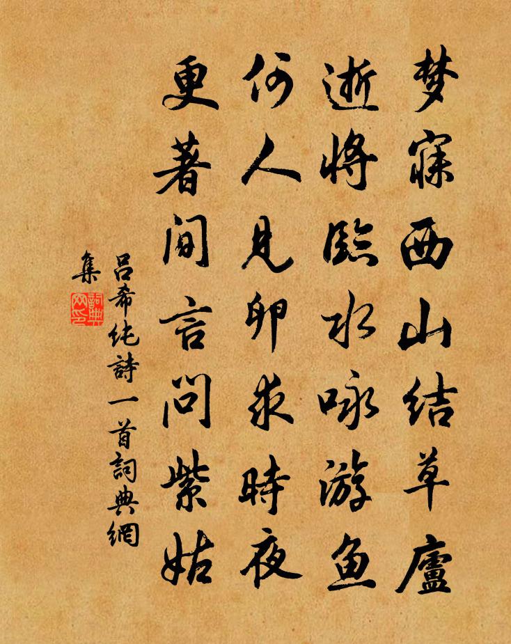 詩詞名句歷史字典書法欣賞書法字典國語詞典說文解字康熙字典古漢語字典標 題 作 者 詩 句 詩一首作者:呂希純 朝代:宋代詩一首原文夢寐西山結草廬,逝將臨水詠游魚。何人見卵求時夜,更著間言問紫姑。詩詞問答問:詩一首的作者是誰?答:呂希純問:詩一首寫於哪個朝代?答:宋代呂希純詩一首書法欣賞詩一首書法作品詩詞推薦步蟾宮(守歲)章謙亨〔宋代〕團欒小酌醺醺醉。廝捱著、沒人肯睡。呼盧直到五更頭,便鋪了妝檯梳洗。庭前鼓吹喧人耳。驀忽地、又添一歲。古別離張彪〔唐代〕別離無遠近,事歡情亦悲。不聞車輪聲,後會將何時。去日忘寄書,來日乖前期。縱知明當返,一息千萬思。東林精舍見故殿中鄭侍御題詩追舊書情涕泗橫集…馮少府韋應物〔唐代〕仲月景氣佳,東林一登歷。中有故人詩,淒涼在高壁。精思長懸世,音容已歸寂。墨澤傳灑餘,磨滅親翰跡。平生羅提舉見和再用韻四首陳造〔宋代〕燄燄水芝照影,娟娟風柳受梳。何日詩成喜雨,憑欄客意凌虛。碧岩吟金朋說〔宋代〕蒼蒼岩上樹,夜氣積而然。念彼人之學,盈科為有源。松江趙嘏〔唐代〕松江菰葉正芳繁,張翰逢秋憶故園。千里帆遮館娃寺,一川風暖采香村。潮聲漸遇仙人宅,鶴市曾迷子夜魂。我有木蘭花令黃庭堅〔宋代〕風開水面魚紋皺。暖入草心犀點透。乍看晴日弄柔條,憶得章台人姓柳。心情老大痴成就。不復淋漓沾翠袖。早梅中興樂毛文錫〔唐代〕豆蔻花繁煙艷深,丁香軟結同心。翠鬟女,相與,共淘金。紅蕉葉里猩猩語。鴛鴦浦,鏡中鸞舞。絲雨,隔荔枝陰寶祐二年皇子冠二十首佚名〔宋代〕有來振振,月重輪兮。瑜玉在佩,綦組明兮。左徽在羽,德結旌兮。步中采齊,矩彠循兮。陪師厚游百花洲盤礴範文正祠下道羊曇哭謝安黃庭堅〔宋代〕憶在昭陵日,傾心用老成。功歸仁祖廟,正得一書生。醉吟許碏〔唐代〕閬苑花前是醉鄉,踏翻王母九霞觴。群仙拍手嫌輕薄,謫向人間作酒狂。江湖穩處方逢振〔宋代〕此舟無物本來虛,萬斛清香只有詩。昨夜潮頭高几丈,老僧睡著不曾知。壽樓監丞陳起〔宋代〕十洲三島日月長,殷紅軟紫秋更香。銀河倒浸珊瑚冷,十二樓高玉露瀼。九老仙都在何許,縹緲五雲鸞對舞。璇台紹興親享明堂二十六首佚名〔宋代〕地禮泰折,歌同我將。黝牲純潔,絲竹發揚。博厚而久,含洪以光。扶持宗社,日篤不忘。【中呂】上小樓 自適王愛山〔元代〕酒酣時乘興吟,花開時對景題。剪雪裁冰,擊玉敲金。貫串珠璣,得意時,自陶寫,吟喔一會,放情懷悅心神有何瑞雲譽偈趙善扛〔宋代〕日日飛鳴宣妙旨,幻華起滅復何疑。可憐多少風塵客,去去來來只自欺。題薛少府莊李洞〔唐代〕何須鑿井飲,門占古溪居。寂寞苔床臥,寒虛玉柄書。有期登白閣,又得賞紅蕖。清淺蒲根水,時看鷺啄魚。題高縉之劍室二首陳造〔宋代〕高郎櫑具映峨冠,沈燎茶鐺一室安。遊刃聖經千載計,即今長鋏未須彈。寄無斁陳師道〔宋代〕敬問晁夫子,官池幾許深。已應飛鳥下,復作臥龍吟。待我中痾愈,同君把臂臨。泥塗無去馬,夏木有來禽。次韻德孺晚菊李處權〔宋代〕屈原作離騷,採菊餐其英。淵明賦歸來,徑荒菊猶榮。此物有至性,名因君子成。豈知時節過,不顧霜露凝。歲華名句推薦遠信入門先有淚,妻驚女哭問何如。元稹《得樂天書》 送君九月交河北,雪裡題詩淚滿衣。岑參《送崔子還京》 夫孝,天之經也,地之義也,民之行也。孔子及其弟子《孝經·三才》 蜀魂飛繞百鳥臣,夜半一聲山竹裂。林景熙《冬青花》 婦人依倚子與夫,同居貧賤心亦舒。張籍《征婦怨》 黃鳥翩翩楊柳垂,春風送客使人悲。高適《東平別前衛縣李寀少府 / 送前衛縣李宷少府》 肉腐出蟲,魚枯生蠹。荀子《荀子·勸學》 惟有河邊雁,秋來南向飛。庾信《重別周尚書》 願天上人間,占得歡娛,年年今夜。柳永《二郎神·炎光謝》 百歲落半途,前期浩漫漫。李白《登敬亭山南望懷古贈竇主簿》