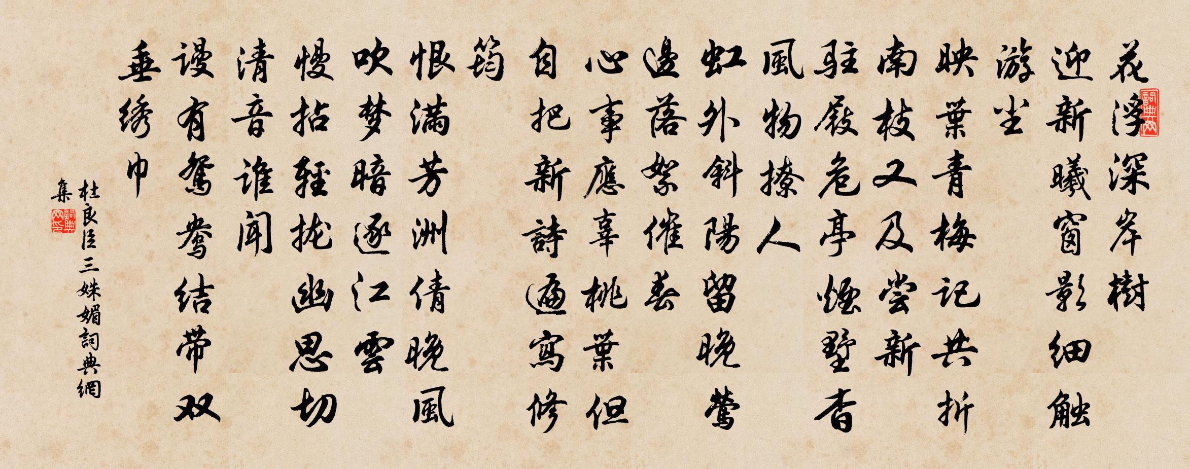 詩詞名句歷史字典書法欣賞書法字典國語詞典說文解字康熙字典古漢語字典標 題 作 者 詩 句 三姝媚作者:杜良臣 朝代:宋代三姝媚原文花浮深岸樹。迎新曦窗影,細觸游塵。映葉青梅,記共折南枝,又及嘗新。駐屐危亭,煙墅杳、風物撩人。虹外斜陽留晚,鶯邊落絮催春。心事應辜桃葉,但自把新詩,遍寫修筠。恨滿芳洲,倩晚風吹夢,暗逐江雲。慢拈輕攏,幽思切、清音誰聞。謾有鴛鴦結帶,雙垂繡巾。詩詞問答問:三姝媚的作者是誰?答:杜良臣問:三姝媚寫於哪個朝代?答:宋代問:三姝媚是什麼體裁?答:詞杜良臣三姝媚書法欣賞三姝媚書法作品詩詞推薦贈萍鄉道士文天祥〔宋代〕道上觀行人,半似重相見。古雲性相近,性豈不如面。萬形本一性,萬心方一殊。世固難絕聖,亦恐難絕愚。李倉子長按行偶成四韻奉呈吳芾〔宋代〕長年蹤跡嘆西東,此地那知得會逢。老去我將歸梓里,時來君合拜芝封。故交零落添新家,晚景衰頹減舊容。今日癸未至節以病晚起走筆戲書紀事排悶十首方回〔宋代〕雲無事書者,泥屨隔牆聲。小市扃虛肆,荒庖絕美烹。流涎淮蟹紫,入夢海柑頳。莫殢閉關卦,兵戈商不行。戲題酒肆陳棣〔宋代〕一氣無私萬物春,小兒造化果能神。鳥啼花發遽如許,酒病詩狂那厭頻。倒著敢期山簡醉,典衣誰計少陵貧。上林春日絕句陸游〔宋代〕門前喚擔買芳菲,白髮猶堪插一枝。舊厭蛙聲今喜聽,牆陰特地作盆池。感齒髮之衰作詩自解曹勛〔宋代〕我生飽艱苦,初年心已衰。況今七十化,形憊聊支持。頭童漸不束,齒敗余牆圍。發落尚樂樂,齒豁良依依。魚蟹陳情獻蜀皇帝貫休〔唐代〕河北江東處處災,唯聞全蜀勿塵埃。一瓶一缽垂垂老,千水千山得得來,奈菀幽棲多勝景,巴歈陳貢愧非才。自慚偈頌一百零二首釋慧遠〔宋代〕若能離諸相,即入法王家。法王無二法,無法即是家。是故法王法,當甚苦瓠瓜。虞美人 梳樓蔣捷〔宋代〕絲絲楊柳絲絲雨。春在溟濛處。樓兒忒小不藏愁。幾度和雲飛去、覓歸舟。天憐客子鄉關遠。借與花消遣。海棠紅哭孟寂張籍〔唐代〕曲江院裡題名處,十九人中最少年。今日春光君不見,杏花零落寺門前。頌古十九首釋法全〔宋代〕驢覷井,井覷驢,冬瓜葉上長葫蘆。會不得,莫踟躕,定盤星上絕錙銖。新安陳仲獻(名策)客蜀總戎幕府,嘗贖一俘陳維崧〔清代〕天畔蠶叢路。記當日、錦城絲管,華陽士女。一自愁雲霾蜀棧,飛下桓家宣武。有多少、花鈿血污。十萬娥眉齊上和吳伯承提宮孟冬風雨楊萬里〔宋代〕舊雨新更寒,晝歇夜復隕。我行十日泥,屨跡故未泯。吟聲正酸苦,已似琴促軫。更遭雪作祟,不由弦不緊。與公曲水亭薛映〔宋代〕台盤疏石渠,激流環四面。夏屋有餘清,羽觴隨意轉。賓告醉言歸,主稱情未惓。雖非禊飲辰,豈謝蘭亭讌。解夏小參問無準禪師僧某〔宋代〕選佛場開日,叢林氣象新。心空及第者,畢竟是何人。答御製頌釋德光〔宋代〕當陽一句子,平地步青雲。踏翻關棙處,便是主家春。答常山屯田張中行寄贈宋祁〔宋代〕紫荷焦脫燥宮毫,萬裡邊霜擾鬢毛。不稱衰年開幕府,只堪平世掾功曹。飛蓬轉野初無定,瘡雁驚弦久未高。猶有至節即事馬臻〔元代〕天街曉色瑞煙濃,名紙相傳盡賀冬。繡幕家家渾不捲,呼盧笑語自從容。絕句二首張紹文〔宋代〕雨過盤池起綠波,夜來添得幾圓荷。單衣不奈春寒惡,卻美楊枝挾纊多。承劉學錄示三山佳詠兼欲下旬仙鯉湖宿約以詩陳宓〔宋代〕秋聲又向耳邊鳴,轉眼平頭六十人。最是讀書難久坐,不甘空負百年身。名句推薦思歸若汾水,無日不悠悠。李白《太原早秋》 光陰似箭,日月如梭吳承恩《西遊記·第八回》 十年花骨東風淚,幾點螺香素壁塵。史達祖《鷓鴣天·搭柳欄乾倚佇頻》 主貴多變,國貴少變。國多物,削;主少物,強。商鞅《商君書·去強》 酹酒蒼茫,倚歌平遠,亭上玉虹腰冷。吳文英《十二郎·垂虹橋》 力貴突,智貴卒。得之同則速為上,勝之同則濕為下。呂不韋《呂氏春秋·論·開春論》 塞下秋來風景異,衡陽雁去無留意。范仲淹《漁家傲·秋思》 兵家勝敗真常事,卷甲重來未可知。羅貫中《三國演義·第十二回》 素娥無賴,西去曾不為人留。蘇轍《水調歌頭·徐州中秋》 東風隨春歸,發我枝上花。李白《落日憶山中》