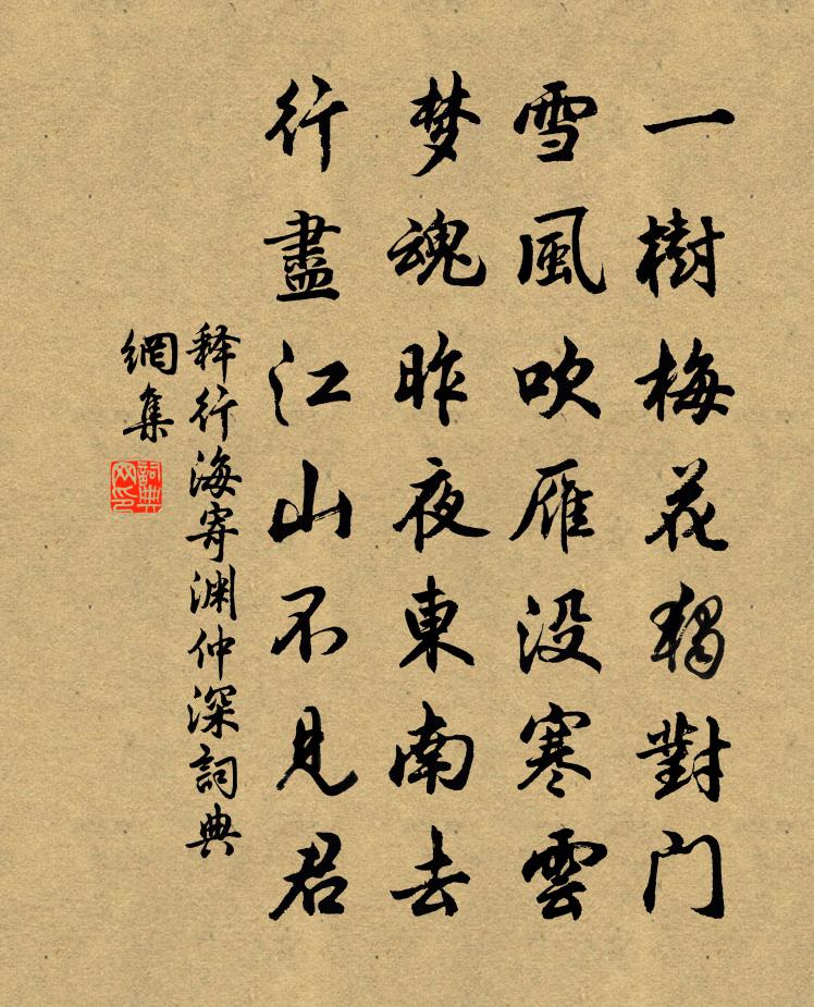 詩詞名句歷史字典書法欣賞書法字典國語詞典說文解字康熙字典古漢語字典標 題 作 者 詩 句 寄淵仲深作者:釋行海 朝代:宋代寄淵仲深原文一樹梅花獨對門,雪風吹雁沒寒雲。夢魂昨夜東南去,行盡江山不見君。詩詞問答問:寄淵仲深的作者是誰?答:釋行海問:寄淵仲深寫於哪個朝代?答:宋代釋行海寄淵仲深書法欣賞寄淵仲深書法作品詩詞推薦春晚寫望宋祁〔宋代〕不覺春芳晏,翻成客望勞。草平天一色,風暖燕雙高。擊轊爭輕幰,書旗衒縹醪。隨宜歌白紵,都士半雲袍。園中雜書陸游〔宋代〕北窗看鏡意悽然,夢斷梁州已七年。獵獵彩旗春日晚,不堪花外見鞦韆。題靜山文天祥〔宋代〕地得一以寧,凝然者卷石。嵁岩及培塿,異形不異質。古之能定者,悟此為一極。春榮秋以悴,一歲百態出。鳥鳴送王學士赴兩浙轉運歐陽修〔宋代〕漢家財利析秋毫,暫屈清才豈足勞。邑屋連雲盈萬井,舳艫銜尾列千艘。春寒欲盡黃梅雨,海浪高翻白鷺濤。平昔白日麗江皋(一作鮑溶詩)陳昌言〔唐代〕遲景臨遙水,晴空似不高。清明開曉鏡,昭晰辨秋毫。鬱郁長堤土,離離淺渚毛。煙銷占一候,風靜擁千艘。獨媚初秋陸游〔宋代〕生世元浮脆,人言七十稀。耄期今已及,氣力固應微。食冷常憂過,追涼每念歸。入秋才幾日,卷簟換縑衣。向負春遊辭以風雨開霽既久樂事未果因書百言強至〔宋代〕常恨春日少,況遭風雨多。桃李冷不覺,□□如濁河。廣陌斷游騎,寂不聞行歌。方其正雨時,樂事空蹉跎。晴來御製慶先後升袝禮成七言六韻奉和寇準〔宋代〕天錫靈符興寶祚,澤流錦宇福含生。蒸蒸至孝鹹歸厚,翼翼精衷尚執盈。順考漢儀彰道廣,欽崇周典闡文明。豆籩舟中觀雪呈李堯俞二首馮時行〔宋代〕孤渚凝寒睇,斜風看亂飄。已狂難自定,初泊不勝嬌。白向水邊斷,輕來衣上消。更愁清夢覺,篷底聽蕭蕭。寄李不危張耒〔宋代〕憶昨東風吹馬蹄,瓦關分袂涕交揮。淮陽風物應如舊,獨在柯山送雁歸。秋宵辭白玉蟾〔宋代〕長天與遠水,極目煙冥茫。暮鴻孤悲鳴,霜林萬葉黃。倚松望翠微,數點寒螢光。吾非長夜魂,墮此寂寞鄉。衷情山濤徐鈞〔宋代〕身心已逐竹林游,為國搜賢事卻優。持正擬官覘上意,事君可作不忠謀。贈祖三詠王維〔唐代〕〔濟日照州官舍作日照〕[蟲日照蕭][蟲日照肖]掛虛牖。蟋蟀鳴前除。歲晏涼風至。君子復何如。高館闃無人鸚鵡曲 都門感舊馮子振〔元代〕都門花月蹉跎住。恰做了白髮傖父。酒微醒曲榭迴廊,忘卻天街酥雨。曉鍾殘紅被留溫,又逐馬蹄聲去。恨無題亭次韻張亞彥書事韓元吉〔宋代〕頡利何時縛,康居久未灰。天威如自震,敵勢不難摧。日月丹心在,風塵白眼開。受降城旋築,且緩羽書來。書志陸游〔宋代〕飲水蕭然臥曲肱,桑村麥野醉騰騰。老身長子知無憾,泛宅浮家苦未能。南畝服勞勝乞食,腐儒垂死恥依僧。柴荊贈筆趙蕃〔宋代〕管城封已失,少室價難高。外作蕭嵩表,中慚去病鏖。縱橫才適用,脫略已陳勞。自分當頻棄,毋庸謂不遭。劉景仁畫墨梅扇上又畫梅影於扇陰求詩各題一胡銓〔宋代〕竹外梅花耿玉顏,凜然冰句落霜紈。莫將輕扇趨炎子,留作人間六月寒。踏月看梅不見花,客路朱繼芳〔宋代〕閨合空相憶,那知客路艱。背人前去鳥,迎面遠來山。夜泊孤燈悄,晨裝片月彎。猿聲不知處,杳杳白雲間。一室鄭會〔宋代〕坐眠惟一室,貧與病相依。風急夜沽酒,月明秋搗衣。異鄉身是寄,久客事俱非。忽忽誰可語,滿庭黃葉飛。名句推薦老母與子別,呼天野草間。李白《豫章行》 敖不可長,欲不可從,志不可滿,樂不可極。戴聖《禮記·曲禮上》 只解沙場為國死,何須馬革裹屍還。徐錫麟《出塞》 秋色冷並刀,一派酸風卷怒濤。陳維崧《南鄉子·邢州道上作》 衣貴潔,不貴華。上循分,下稱家。李毓秀《弟子規·謹》 洞庭春溜滿,平湖錦帆張。陰鏗《渡青草湖》 殘月出門時,美人和淚辭。韋莊《菩薩蠻·紅樓別夜堪惆悵》 滿羅衫是酒,香痕凝處,唾碧啼紅相半。張翥《陌上花·有懷》 見素抱樸,少私寡慾,絕學無憂。老子《老子·道經·第十九章》 昭昭若日月之明,離離如星辰之行劉勰《文心雕龍·宗經》
