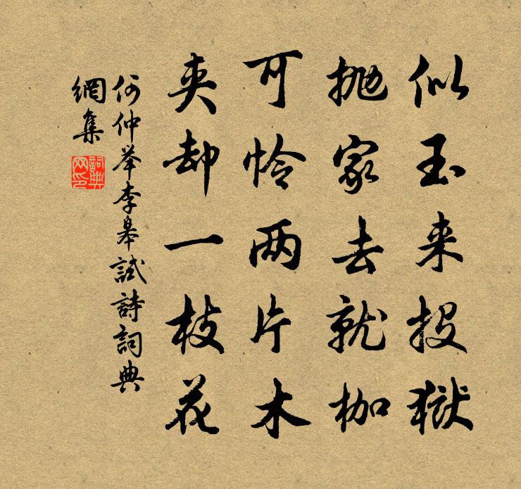 詩詞名句歷史字典書法欣賞書法字典國語詞典說文解字康熙字典古漢語字典標 題 作 者 詩 句 李皋試詩作者:何仲舉 朝代:唐代李皋試詩原文似玉來投獄,拋家去就枷。可憐兩片木,夾卻一枝花。詩詞問答問:李皋試詩的作者是誰?答:何仲舉問:李皋試詩寫於哪個朝代?答:唐代問:李皋試詩是什麼體裁?答:五絕何仲舉李皋試詩書法欣賞李皋試詩書法作品注釋全唐詩:卷762-13詩詞推薦游金華山詩沈約〔南北朝〕遠策追夙心。靈山協久要。天倪臨紫闕。地道通丹竅。未乘琴高鯉。且縱嚴陵釣。若蒙羽駕迎。得奉金書召。高馳道室試筆陸游〔宋代〕吾家學道今四世,世佩施真三住銘。一窗蘿月照孤詠,萬壑松風吹半醒。無題鄭剛中〔宋代〕池塘好處煙迷柳,簾幕昏時雨過山。燕子不知春有恨,銜將花片入梁間。南歌子張元乾〔宋代〕玉露團寒菊,秋風入敗荷。繚牆南畔曲池渦。天迥遙岑倒影、落層波。月轉檐牙短,更傳漏箭多。醉來歸去意如何辛春日詞御閣晏殊〔宋代〕令月歸餘屆早春,羲舒相望協元辰。初陽乍逐青旂動,聖壽長隨鳳歷新。慈利簿樂思中自沅州考試回經過見之留以小酌趙蕃〔宋代〕飄然一舸順流東,敏捷如鴻恨不同。為我能留半日許,得君何翅一聯中。頗思暮句記初識,已復枉詩醉古風。沅芷游列真觀劉道士拉上潮際觀漁趙汝回〔宋代〕珠宮何岧嶢,前江後層嶂。開山者何人,蕭梁山中相。竊惟經營初,豈曰此幽賞。地靈宜仙事,境寂銷俗相。既積梅友李龍高〔宋代〕老子平生怕熱瞞,論心只可話餘酸。劉郎枉了夸豪傑,甘向伾文托歲寒。覽陳丕卷羅鄴〔唐代〕雪宮詞客燕宮游,一軸煙花象外搜。謾把蜀紋當晝展,徒夸湘碧帶春流。吟時致我寒侵骨,得處疑君白盡頭。從北和士特栽果十首椑柿劉子翬〔宋代〕秋林黃葉晚霜嚴,熟蒂甘香味獨兼。火傘頳虬浪褒拂,風標那似邑中黔。吳農謠楊維楨〔元代〕吳農竭力耕王田,王賦已供常餓眠。鄧通董賢何為者,一生長用水衡錢。去鄭暮次中牟宋祁〔宋代〕暮投京縣宿,氣象已紛羅。菀樹道旁密,侯田關內多。高城切星斗,秋水似天河。自問還台馬,猶餘几子珂。將歸趙汝績〔宋代〕拄笏西山一笑中,掛帆猶及棟花風。此身可是屠羊說,餘事寧非失馬翁。不問鬢毛成早白,免將痴面發羞紅。故人聽新蟬寄張晝方乾〔唐代〕細聲頻斷續,審聽亦難分。仿佛應移處,從容卻不聞。蘭棲朝咽露,樹隱暝吟雲。莫遣鄉愁起,吾懷只是君。偶見·深山曲路見徐禎卿〔明代〕深山曲路見桃花,馬上匆匆日欲斜。可奈玉鞭留不住,又銜春恨到天涯。 點絳唇(春半)趙長卿〔宋代〕輕暖輕寒,賞花天氣春將半。柳搖金線。求友鶯相喚。玉腕蛾眉,意眼頻頻眄。歌喉軟。玉卮受勸。一醉應相拼。奉先寺張耒〔宋代〕定知生不出長門,禾黍蕭蕭寺後村。松柏城南萬丘冢,傷心最說內人園。海寇趙某伏誅王亦世〔宋代〕憑陵海若玩波神,怙恃乾坤不殺身。刀鋸未加先自殞,陸梁未有白頭人。國史龍圖侍郎宋次道輓辭五首蘇頌〔宋代〕告臥春明日,災逢本命年。英靈百人敵,奄忽一朝捐。妙墨宗祧秘,遺文太史編。家書四世學,嗣子復能傳。次金東園漁家雜詠八首楊公遠〔宋代〕經行葦荻沙頭熟,出沒風濤膽氣粗。博得酒歸明月夜,呼兒作膾旋批鱸。名句推薦好時節,願得年年,常見中秋月。徐有貞《中秋月·中秋月》 名花傾國兩相歡,常得君王帶笑看。李白《清平調·名花傾國兩相歡》 瀉水置平地,各自東西南北流。鮑照《擬行路難十八首》 謝亭離別處,風景每生愁。李白《謝公亭·蓋謝朓范雲之所游》 假金方用真金鍍,若是真金不鍍金。李紳《答章孝標》 黃衫飛白馬,日日青樓下。陳克《菩薩蠻·赤闌橋盡香街直》 幾處早鶯爭暖樹,誰家新燕啄春泥。白居易《錢塘湖春行》 敏捷詩千首,飄零酒一杯。杜甫《不見》 文人之筆,勸善懲惡也。王充《論衡·卷二十·佚文篇》 君去滄江望澄碧,鯨鯢唐突留餘跡。李白《赤壁歌送別》