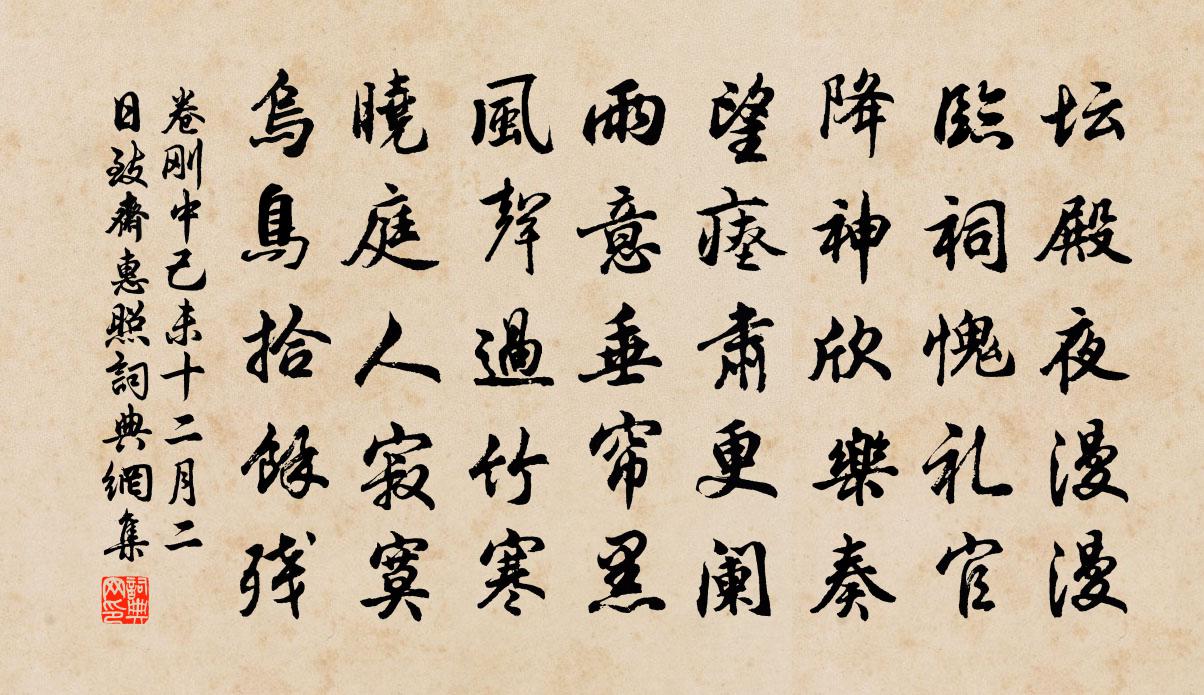 詩詞名句歷史字典書法欣賞書法字典國語詞典說文解字康熙字典古漢語字典標 題 作 者 詩 句 己未十二月二日致齋惠照作者:卷剛中 朝代:宋代己未十二月二日致齋惠照原文壇殿夜漫漫,臨祠愧禮官。降神欣樂奏,望瘞肅更闌。雨意垂簾黑,風聲過竹寒。曉庭人寂寞,烏鳥拾餘殘。詩詞問答問:己未十二月二日致齋惠照的作者是誰?答:卷剛中問:己未十二月二日致齋惠照寫於哪個朝代?答:宋代卷剛中己未十二月二日致齋惠照書法欣賞己未十二月二日致齋惠照書法作品詩詞推薦句薛紹彭〔宋代〕霜乾葉飄零,日出水清淺。蟋蟀詩羅隱〔唐代〕頑颸斃芳,吹愁夕長。屑戍有動,歌離吊夢。如訴如言,緒引虛寬。周隙伺榻,繁咽夤緣。范睡蟬老,冠峨緌好。三山先賢祠落成八首熊禾〔宋代〕共惟無極翁,混元再開闢。關洛與考亭,杲杲行世日。惟此五大賢,人極賴以立。謂宜昭明薦,千古為令式。重登廬山感懷陳香梅〔〕四十年來煙雨多,國恨家仇奈若何;英雄抗日征戰死,天涯遊子唱離歌。牯嶺東西谷尚在, 郎人士舊風波;廬山賈節庵冒夏暑越修塗過我苕霅情誼甚厚令聞古牟巘五〔宋代〕自言勤教督,燈火與之對。淵明定不孤,門戶期汝大。答來上人春日即事梅堯臣〔宋代〕南國三衣客,三城一見春。花明馳道遠,雨漲御溝新。茗憶山中物,雲懷嶺上鄰。如何異鄉感,卻出解空人。贈司空拾遺戴叔倫〔唐代〕侍臣何事辭雲陛,江上彈冠見雪花。望闕未承丹鳳詔,開門空對楚人家。陳琳草奏才還在,王粲登樓興不賒。高館偈三首釋祖珠〔宋代〕機前一句子,用處不留情。如撞幢子弩,箭箭中紅心。會覽亭三首張嵲〔宋代〕角聲嗚咽下城頭,水國風煙欲暮愁。遠日苦遭層嶂隔,歸心欲逐大江游。漁村積火臨沙岸,賈客連檣集市樓。千里聞稻有成晁公溯〔宋代〕庭柯不搖綠蔽空,西風未回尚南風。香稻既收八月白,晚花能開百日紅。安排物色慰年暮,流落天涯嗟路窮。炎江烏鵲李覯〔宋代〕烏鵲翩翩競羽毛,南飛無樹過良宵。就中管得他人事,祗與天孫倩作橋。忍淚吟/採桑子賀鑄〔宋代〕十年一覺揚州夢,雨散雲沈。隔水登臨。揚子灣西夕照深。當時玉管朱弦句,忍淚重吟。辦取沾襟。餖飣西風□□建康六感吳劉子翬〔宋代〕龍翔大耳兒,虎視捉刀人。風雲競追逐,逸軌誰能遵。大皇負英材,沈潛欻求伸。一呼定南國,再戰威強鄰。抗魏送余郎中知鄭州梅堯臣〔宋代〕西接都門才百里,壓城殘雪照牙旗。風煙古是諸侯國,鴈鶩新來僕射陂。饋食且依當日具,鑄刑無改昔人為。濃薰山行周弼〔宋代〕盡日群山里,知行第幾重。竹深春寺磬,灘急午溪舂。殘旭猶雙塔,晴雲只半峰。豈無仙隱者,恨不少從容。閒居釋行海〔宋代〕山礬香氣近幽蓀,靜聽幽禽弄夕陽。滿地落花春已闌,深林只有蕙蘭香。送戴漢老翁卷〔宋代〕三洞聳奇秀,雙溪瀉澄鮮。上有婺女光,照耀無窮年。儲靈復產異,人物相比肩。君雖生後來,識與先輩連。如筠牡丹盧梅坡〔宋代〕玉欄四面護花王,一段風流似洛陽。深院不須驅野鹿,只愁蜂蝶暗偷香。除官陳師道〔宋代〕扶老趨嚴召,徐行及聖時。端能幾字正,敢恨十年遲。肯著金根謬,寧辭乳媼譏。向來憂畏斷,不盡鹿門期。陪陳立道中書泛湖二首吳潛〔宋代〕弦管叢中畫舫行,都人一一賀昇平。飛鴻不識人間事,猶作窮邊腸斷聲。名句推薦流星透疏木,走月逆行雲。賈島《宿山寺》 貴上極則反賤,賤下極則反貴。貴出如糞土,賤取如珠玉。財幣欲其行如流水。司馬遷《史記·貨殖列傳》 同來望月人何處?風景依稀似去年。趙嘏《江樓舊感 / 江樓感舊》 萬里赴戎機,關山度若飛佚名《木蘭詩/木蘭辭》 何處寄想思,南風搖五兩。王維《送宇文太守赴宣城》 醉中渾不記,歸路月黃昏辛棄疾《臨江仙·探梅》 微微風簇浪,散作滿河星。查慎行《舟夜書所見》 曾經滄海難為水,除卻巫山不是雲。元稹《離思五首·其四》 蘭陵美酒鬱金香,玉碗盛來琥珀光。李白《客中行 / 客中作》 記得綠羅裙,處處憐芳草。賀鑄《綠羅裙·東風柳陌長》