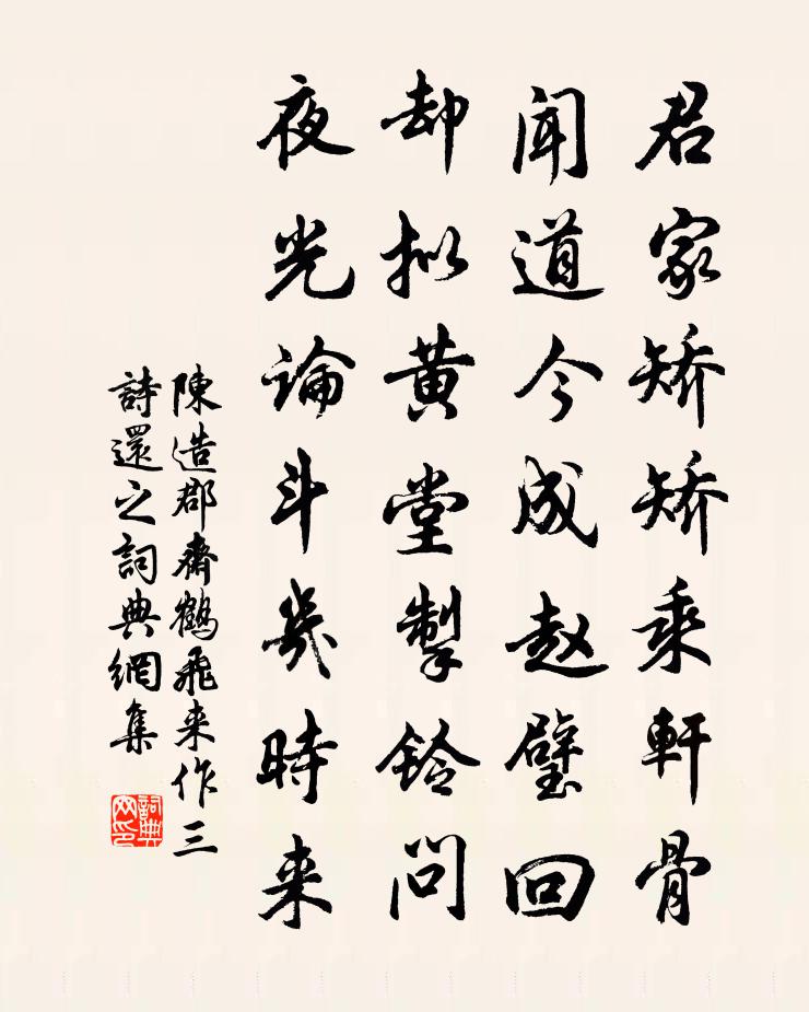 詩詞名句歷史字典書法欣賞書法字典國語詞典說文解字康熙字典古漢語字典標 題 作 者 詩 句 郡齋鶴飛來作三詩還之作者:陳造 朝代:宋代郡齋鶴飛來作三詩還之原文君家矯矯乘軒骨,聞道今成趙璧回。卻擬黃堂掣鈴問,夜光論斗幾時來。詩詞問答問:郡齋鶴飛來作三詩還之的作者是誰?答:陳造問:郡齋鶴飛來作三詩還之寫於哪個朝代?答:宋代陳造郡齋鶴飛來作三詩還之書法欣賞郡齋鶴飛來作三詩還之書法作品詩詞推薦擇良上人歸天台楊億〔宋代〕片席然犀經水府,幾程登入望霞標。吟情晚日繁雲合,歸路秋風密葉凋。行道六時廬岳漏,浮杯千里浙江潮。舊房郊廟歌辭。祭方丘樂章。金奏佚名〔唐代〕坤元至德,品物資生。神凝博厚,道協高明。列鎮五嶽,環流四瀛。於何不載,萬寶斯成。句石待問〔宋代〕何常為柱石,同立太平基。沁園春(戊申歲,奏邸忽騰報,謂余以病掛冠,因賦此)辛棄疾〔宋代〕老子平生,笑盡人間,兒女怨恩。況白頭能幾,定應獨往,青雲得意,見說長存。抖擻衣冠,憐渠無恙,合掛當年柳梢青(和人)葛郯〔宋代〕謝家池閣。翠桁香濃,瑣紗窗薄。夜雨燈前,秋風筆下,與誰同樂。主人許我清狂,奈酒量、從來最弱。顛倒冠巾村居即事陸游〔宋代〕炊甑生塵榻長苔,柴門日晏未曾開。載醪問字今牢落,猶有鄰翁裹飯來。溪上羅公升〔宋代〕往歲貪奇覽,今年遂老槃。門前溪一發,我作五湖看。桐柏觀周朴〔唐代〕東南一境清心目,有此千峯插翠微。人在下方沖月上,鶴從高處破煙飛。岩深水落寒侵骨,門靜花開色照衣。欲識朝中措盧炳〔宋代〕曉來天氣十分涼。時候近重陽。村落人家瀟灑,籬菊有芬芳。年來漸覺,詩腸愈窄,酒量偏狂。好景不須放過,何問內賀鑄〔宋代〕庚伏壓蒸暑,細君弄鹹縷。烏綈百結裘,茹繭加彌補。勞問汝何為,經營特先期。婦工乃我職,一日安敢墮。嘗聞偈頌六十首釋曇華〔宋代〕千溪水冷,萬壑雲寒。無位真人乾屎橛,金剛寶劍破牢關。多年曆日最靈驗,百尺竿頭子細看。瞎卻眼,啞卻口,群玉山董居誼〔宋代〕浮世囂塵不可乾,漫山琮璧照人寒。客來莫認為頑石,具眼還須作玉看。留詩葉法善〔唐代〕昔在禹餘天,還依太上家。忝以掌仙錄,去來乘煙霞。暫下宛利城,渺然思金華。自此非久住,雲上登香車。適向東湖行釋善珍〔宋代〕湖埆埆,泥駮駮,千夫萬夫鉏剝剝。菰蒲濛濛深復鑿,湖水渾黃車漉漉。朝車暮鑿聲不已,土山矗矗黃埃里。山成和史司直韻五首吳潛〔宋代〕空中萬鶴舞盤旋,飛向西天只樹園。一幅繒綃包宇宙,連城珪璧委郊原。冰笳莫弄兩三曲,鐵甲猶聯百萬屯。痛癢次開祖使君韻兼呈端叔大夫聖域長老晁補之〔宋代〕神龍異凡馬,頭角要須斂。崢嶸法雲窟,跳出有家范。金剛不吐焰,已落天魔膽。一派感慈中,無波寒湛湛。是波詠史上王褒陳普〔宋代〕彭祖呼噓不可為,碧雞使節豈堪持。區區含糗羹藜厚,聊似相如衣錦時。赴桂陽道中喜晴書事陳傅良〔宋代〕十日九雨垂垂雪,馬僵仆病泥乘橇。披衣闖戶得星月,喜有恥向妻兒說。耳根久與朝雞別,熟睡八年謀未拙。乞米次韻張守同往華嚴劉子翬〔宋代〕淺水荷花開傍橋,晚鐘樓殿碧山椒。林松繞路行不徹,野鳥避人飛更遙。喜有高情共捕壑,應須長嘯混漁樵。老僧讀太白集李呂〔宋代〕吾宗老太白,俊逸自幼年。學成喜任俠,長劍辭三川。無心馴鳥雀,急義散金錢。曳裾半天下,所至驚四筵。竺陣名句推薦馬穿楊柳嘶,人倚鞦韆笑,探鶯花總教春醉倒。王磐《清江引·清明日出遊》 亂雲低薄暮,急雪舞迴風。杜甫《對雪》 曲終過盡松陵路,回首煙波十四橋。姜夔《過垂虹》 酒盞旋將荷葉當。蓮舟盪。時時盞里生紅浪。歐陽修《漁家傲·花底忽聞敲兩槳》 無奈朝來寒雨,晚來風。李煜《相見歡·林花謝了春紅》 芄蘭之葉,童子佩韘。佚名《芄蘭》 九日龍山飲,黃花笑逐臣。李白《九日龍山飲》 學之興廢,隨世輕重。顏之推《顏氏家訓·勉學篇》 老來情味減,對別酒,怯流年。辛棄疾《木蘭花慢·滁州送范倅》 剩水殘山無態度,被疏梅料理成風月。辛棄疾《賀新郎·把酒長亭說》