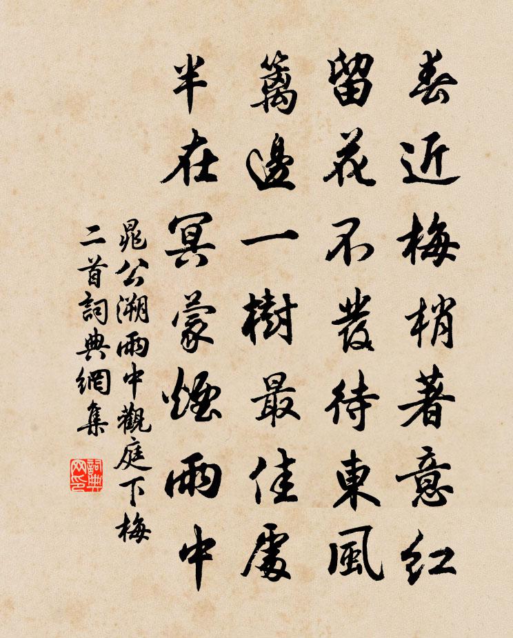 詩詞名句歷史字典書法欣賞書法字典國語詞典說文解字康熙字典古漢語字典標 題 作 者 詩 句 雨中觀庭下梅二首作者:晁公溯 朝代:宋代雨中觀庭下梅二首原文春近梅梢著意紅,留花不發待東風。籬邊一樹最佳處,半在冥濛煙雨中。詩詞問答問:雨中觀庭下梅二首的作者是誰?答:晁公溯問:雨中觀庭下梅二首寫於哪個朝代?答:宋代晁公溯雨中觀庭下梅二首書法欣賞雨中觀庭下梅二首書法作品詩詞推薦春晚雨中作陸游〔宋代〕冉冉流年不貸人,東園青杏又嘗新。方書無藥醫治老,風雨何心斷送春!樂事久歸孤枕夢,酒痕空伴素衣麈。畏途和顏長官百詠負薪朱繼芳〔宋代〕破帽籠頭髮半華,樵歌一曲勝長嗟。雞鳴裹飯豈高去,日暮天寒未到家。送黃生還臨安王銍〔宋代〕舊事恍如前後身,龍門四紀更情親。茅廬驚嘆見斯客,天馬超騰感似人。三逕草荒殘歲雨,一枝梅作渡江春。莫言春日焦山觀瘞鶴銘吳琚〔宋代〕昔愛山樵書,今踏山樵路。江邊春事動,梅柳皆可賦。犖确石徑微,白浪灑衣履。臨淵魚龍驚,捫崖猿鳥懼。古刻李德充再賦九日期字韻詩輒亦復作晁說之〔宋代〕多才公子莫淒淒,九日不嘲風雨期。清酒玉腴浮杯底,黃花金蕊粲鈴兒。百年歌吹驂鸞地,萬里旌幢鳴鳳枝。前後蘇武慢馮尊師〔元代〕絕粒停廚,餐霞飲露,返照自然相制。鉛生五彩,汞發三光,方顯大丹苗裔。開啟朱扉,躍出金烏,飛入玉蟾宮裡湖上眾禽盡以俗呼為題連點七文同〔宋代〕翩翩彼珍禽,金羽耀寒日。飛落灘上冰,對人連點七。青溪村居二首熊孺登〔唐代〕家占溪南千個竹,地臨湖上一群山。漁船多在馬長放,出處自由閒不閒。深樹黃鸝曉一聲,林西江上月猶明。野人劉無虞尊人輓詩二首張嵲〔宋代〕蓄德竟不耀,坐觀門戶成。生無三事貴,祿有萬鍾榮。色養無違志,陵終若事生。秋風如罔極,蕭瑟在松聲。念奴嬌佚名〔宋代〕三山高惟月以慶元戊午校秋試於零陵竣事,嘗游淡岩,觀山谷留題。後廿九年,朅來分符,暮秋復游。睹景物之依二十日新田清江一曲小飲袁說友〔宋代〕一曲清江古岸頭,茅檐初日照高秋。數聲又得閒身到,相對綠漪橫小舟。南溪楊輔世〔宋代〕碧玉寒塘瑩不流,紅蕖影里立沙鷗。便當不作南溪看,當得西湖十里秋。梅花李煜〔唐代〕殷勤移植地,曲檻小欄邊。共約重芳日,還憂不盛妍。阻風開步障,乘月溉寒泉。誰料花前後,蛾眉卻不全。失卻河間文天祥〔宋代〕南歸雁盪報郎君,老子精神健十分。不為瀛洲復相見,阿戎翻隔萬山雲。竹齋二首王阮〔宋代〕清陰翠色滿湘山,月下風前極目間。第一莫污兒女淚,失身嫌作杖頭斑。戲贈高述六言黃庭堅〔宋代〕江湖心計不淺,翰墨風流有餘。相期乃千載事,要須讀五車書。臨江何氏結亭松間名曰彈秋因王通一來乞詩章甫〔宋代〕萬籟從風俱發聲,唯松得之尤善鳴。五聲水亂無虧成,膝橫三尺秋月明。君家江南一茆屋,直乾森森伴幽獨。人言驀山溪(早梅)徐安國〔宋代〕青梅骨瘦,已有生春意。椒萼露微花,便覺香魂旖旎。惜花公子,可是賦情深,攜瘦竹,繞疏籬,終日成孤倚。賞經八合坂許棠〔唐代〕躡險入高空,初疑勢不窮。又緣千嶂盡,還共七盤同。下辨東流水,平隨北去鴻。天然無此道,應免患窮通。次前韻與舅氏竺九成求芋陳著〔宋代〕何處蹲鴟美,雲南一望中。角巾臨晚歲,拙語寄西風。喜報無乾鵲,緘回靳篆蟲。還詩元有例,盍與昔人同。名句推薦兼聽之明,而無矜奮之容;有兼覆之厚,而無伐德之色。荀子《荀子·正名》 杖劍對尊酒,恥為遊子顏。陸龜蒙《別離》 數點雨聲風約住,朦朧淡月雲來去李冠《蝶戀花·春暮》 巴子城頭青草暮,巴山重疊相逢處張先《漁家傲·和程公辟贈》 布帛尋常,庸人不釋。韓非及後人《韓非子·五蠹》 風遞幽香出,禽窺素艷來。齊己《早梅》 奈南牆冷落,竹煙槐雨。吳文英《惜秋華·七夕前一日送人歸鹽官》 相思黃葉落,白露濕青苔。李白《長相思三首》 流水落花春去也,天上人間。李煜《浪淘沙令·簾外雨潺潺》 愔愔坊陌人家,定巢燕子,歸來舊處。周邦彥《瑞龍吟·大石春景》
