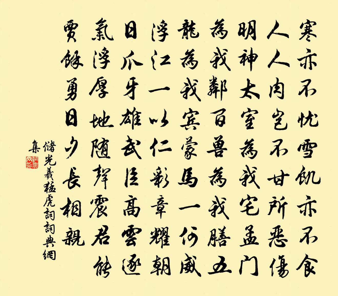 詩詞名句歷史字典書法欣賞書法字典國語詞典說文解字康熙字典古漢語字典標 題 作 者 詩 句 猛虎詞作者:儲光羲 朝代:唐代猛虎詞原文寒亦不憂雪,飢亦不食人。人肉豈不甘,所惡傷明神。太室為我宅,孟門為我鄰。百獸為我膳,五龍為我賓。蒙馬一何威,浮江一以仁。彩章耀朝日,爪牙雄武臣。高雲逐氣浮,厚地隨聲震。君能賈餘勇,日夕長相親。詩詞問答問:猛虎詞的作者是誰?答:儲光羲問:猛虎詞寫於哪個朝代?答:唐代問:猛虎詞是什麼體裁?答:樂府儲光羲猛虎詞書法欣賞猛虎詞書法作品注釋全唐詩:卷136_10詩詞推薦花張南史〔唐代〕花,花。深淺,芬葩。凝為雪,錯為霞。鶯和蝶到,苑占宮遮。已迷金谷路,頻駐玉人車。芳草欲陵芳樹,東家半狄明府(博濟。一作寄狄明府)杜甫〔唐代〕梁公曾孫我姨弟,不見十年官濟濟。大賢之後竟陵遲,浩蕩古今同一體。比看叔伯四十人,有才無命百寮底。今者溪梅初放張嵲〔宋代〕荒山犖确倦征行,溪畔逢梅照眼明。枝裊霜天寒日薄,影沉碧澗晚流清。最憐雪後開來瘦,可忍風前落去輕。卻悔奉送崔侍御和蕃耿湋〔唐代〕萬里華戎隔,風沙道路秋。新恩明主啟,舊好使臣修。旌節隨邊草,關山見戍樓。俗殊人左衽,地遠水西流。日暮送董伯玉造朝改秩吳芾〔宋代〕之子久言別,今秋忽此來。訪我湖山上,連月相追陪。和詩動盈軸,舉酒必晝罍。使人增眼明,頓覺忘衰頹。方將讀史陳杰〔宋代〕口體乃累人,過時餓事亦細。擁篲何為者,妨我雪中睡。先生死非令尹辱,彼四百家無罪哭。粟三鍾,薪十束,天儲福觀謁唐玉真公主祠程公許〔宋代〕華萼樓前花冥冥,三郎雅知睦天倫。脂田恩厚說屣輕,獨將泡影觀此身。碧瑤六六秀蜀岷,朝來鬱勃連夕曛,石壇明妃車若水〔宋代〕萬里來朝拜寵歸,琵琶下馬冊閼氏。虛傳千古和戎話,不道當年虜自衰。齊雩祭歌 青帝 二謝朓〔南北朝〕景陽陽。風習習。女夷歌。東皇集。句羅松野〔宋代〕驚舟出瞿塘,還有平流安。迎仙客(洞天)史浩〔宋代〕瑞雲繞。四窗好。何須隔水尋蓬島。日常曉。春不老。玉蕊樓台,果是無塵到。沒智巧。沒華妙。箇中只喜風波少壽襄閫李曾伯〔宋代〕江南三月春事濃,人間處處熙東風。山陰亭下羽觴舉,長安小邊簫鼓從。衣冠酣燕太平久,干戈浸鈍鐵鉞朽。神州苦雨中又作四聲詩寄魯望平上聲皮日休〔唐代〕河平州橋危,壘晚水鳥上。沖崖搜松根,點沼寫芡響。舟輕通縈紆,棧墮阻指掌。攜橈將尋君,渚滿坐可往。聖政更新詔書正告訐之罪因得小詩十首韓元吉〔宋代〕金貂七葉誰能必,石槨三年計自愚。得鹿覆樵真一夢,求魚緣木信狂圖。水樂洞王鎡〔宋代〕一派宮商石壁中,此腔不與世人同。分明水府真韶樂,幾換興亡曲未終。李郎中有詩謝寄藤杖仍次韻答之何夢桂〔宋代〕海南覓得古藤枝,持與詩人杜牧之。紫貝斑文鞭更爛,赤龍蒼骨蛻尤奇。路無夷險終全節,用有行藏一任時。非但贈韋早陸羽皎然〔唐代〕只將陶與謝,終日可忘情。不欲多相識,逢人懶道名。寄普門上人劉長卿〔唐代〕白雲幽臥處,不向世人傳。聞在千峰里,心知獨夜禪。辛勤羞薄祿,依止愛閒田。惆悵王孫草,青青又一年。傷情怨/清商怨方千里〔宋代〕閒愁眉上翠小。盡春衫寬了。舞檻孤鸞,嚴妝羞獨照。王孫音信尚渺。度寒食、禁菸須到。趁賞芳菲,今年春事早漁家傲洪皓〔宋代〕圃蕙庭桐凋大半。西風不借行人便。不用留題明月觀。西園宴。顏酡浪說觴無算。萬斛羈愁推不遠。千杯魯酒何曾名句推薦我來一長嘆,知是東溪蓮。白居易《京兆府栽蓮》 杖劍對尊酒,恥為遊子顏。陸龜蒙《別離》 蓄恩不倦,以一取萬。黃石公《三略·上略》 東風有信無人見,露微意、柳際花邊。蘇軾《一叢花·今年春淺侵年》 刷羽同搖漾,一舉還故鄉。沈約《詠湖中雁》 為報今年春色好。花光月影宜相照。李清照《蝶戀花·上巳召親族》 沉憂能傷人,綠鬢成霜蓬。李白《怨歌行》 萬事一身傷老矣,戎葵凝笑牆東。陳與義《臨江仙·高詠楚詞酬午日》 離離原上草,一歲一枯榮。白居易《草 / 賦得古原草送別》 更吹羌笛關山月,無那金閨萬里愁王昌齡《從軍行七首》