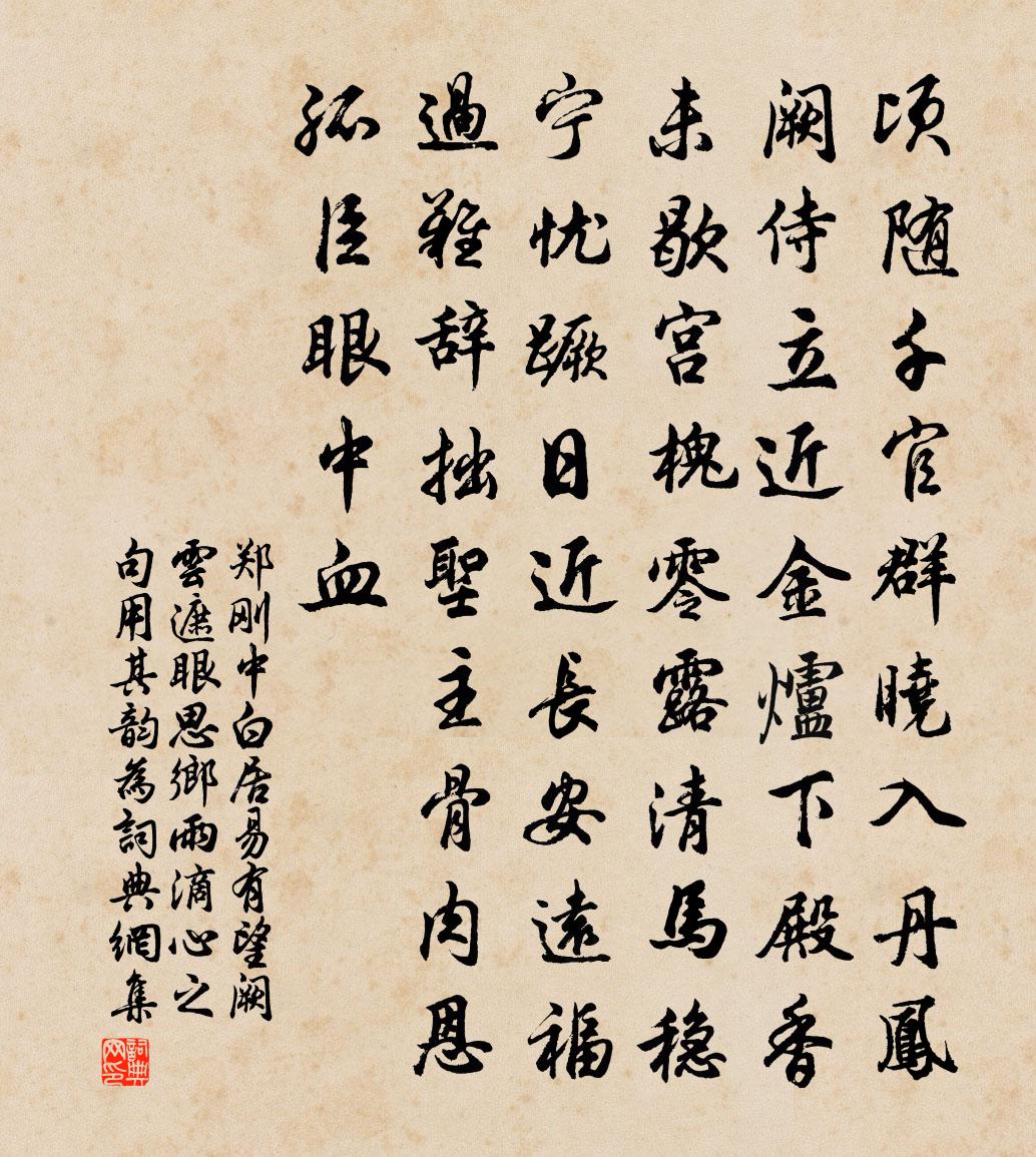 詩詞名句歷史字典書法欣賞書法字典國語詞典說文解字康熙字典古漢語字典標 題 作 者 詩 句 白居易有望闕雲遮眼思鄉雨滴心之句用其韻為作者:鄭剛中 朝代:宋代原文頃隨千官群,曉入丹鳳闕。侍立近金爐,下殿香未歇。宮槐零露清,馬穩寧憂蹶。日近長安遠,福過難辭拙。聖主骨肉恩,孤臣眼中血。詩詞問答問:《白居易有望闕雲遮眼思鄉雨滴心之句用其韻為》的作者是誰?答:鄭剛中問:該詩寫於哪個朝代?答:宋代書法欣賞白居易有望闕雲遮眼思鄉雨滴心之句用其韻為書法作品詩文賞析【原題】:白居易有望闕雲遮眼思鄉雨滴心之句用其韻為秋思十首詩詞推薦人生如流丸方回〔宋代〕人生如流丸,冉冉不肯住。草變鶗鴃鳴,花零蝴蝶去。去去無奈何,一飯三起步。鬢綠密已稀,紅顏新忽故。往悔王子中使君家東澗修竹孫應時〔宋代〕一徑修篁百畝深,倚天喬木更陰陰。紅塵萬事不到眼,好景四時長會心。穩著亭台添遠趣,透開風朋自清音。使君和陸成父司戶過淮陰縣韻三首袁說友〔宋代〕當年三傑共封侯,誰念淮陰為漢留。不是向來曾躡足,未容平勃獨安劉。自詠老身示諸家屬白居易〔唐代〕壽及七十五,俸沾五十千。夫妻偕老日,甥侄聚居年。粥美嘗新米,袍溫換故綿。家居雖獲落,眷屬幸團圓。置榻不寢二首劉克莊〔宋代〕三杯攻散愁腸易,百歲頻開笑口難。誰與南柯太守說,黃粱未熟且追歡。得盧蒲江劉懲齋倡和墨陳郁〔宋代〕天錫吟箋慰老懷,筆花文藻卷中開。二分者有如此,一世之雄安在哉。疁邑墳荒惟宿草,玉堂人去幾秋槐。詩仙應雪後出遊戲作陸游〔宋代〕小巘平岡雪陸離,幽人又賦探春詩。典琴沽酒元非俗,著屐觀碑又一奇。大度乾坤容落托,多情風月笑衰遲。吾生過項羽廟陳洎〔宋代〕八千子弟已投戈,夜帳猶聞怨楚歌。學敵萬人成底事,不思一箇范增多。燕居即事韋應物〔唐代〕蕭條竹林院,風雨叢蘭折。幽鳥林上啼,青苔人跡絕。燕居日已永,夏木紛成結。幾閣積群書,時來北窗閱。八聲甘州(燕山雪花)趙功可〔宋代〕渺平沙、莽莽海風吹,一寒氣崔嵬。耿長天欲壓,河流不動,雲濕如灰。帝敕冰花剪刻,飛瑞上燕台。馬上行人笑金紫岩李鐊〔宋代〕百尺雲岩道院邊,曉鍾疏聲思悠然。荷間酌酒和清露,石上題詩染翠煙。半嶺泉鳴通古澗,數家秋盡隔寒川。西風陳道士乞頌釋慧遠〔宋代〕先生道妙一時傳,我亦隨機叩兩端。拈卻司農無字印,百川從此絕波瀾。送孔江州(一作送人之九江)權德輿〔唐代〕九派尋陽郡,分明似畫圖。秋光連瀑布,晴翠辨香爐。才子厭蘭省,邦君榮竹符。江城多暇日,能寄八行無。邠王小管張祜〔唐代〕虢國潛行韓國隨,宜春深院映花枝。金輿遠幸無人見,偷把邠王小管吹。題洪使君詩卷劉克莊〔宋代〕刻於芹泮士爭披,傳到茅廬我竊窺。突過韋郎森戟句,高如柳惲采苹詩。日惟坐嘯熏沉水,間亦搖毫品荔支。況有壽皇聖帝挽章三首陳造〔宋代〕慈儉遵先志,剛明肖上乾。題期千一遇,躋治五三前。他日山藏壑,終天澤漏泉。稽山穿望眼,松影五雲連。題劍門先寄上西蜀杜司徒薛逢〔唐代〕峭壁橫空限一隅,劃開元氣建洪樞。梯航百貨通邦計,鍵閉諸蠻屏帝都。西蹙犬戎威北狄,南吞荊郢制東吳。千年裴尹東溪別業李頎〔唐代〕公才廊廟器,官亞河南守。別墅臨都門,驚湍激前後。舊交與群從,十日一攜手。幅巾望寒山,長嘯對高柳。清歡夫人合春帖子趙湘〔唐代〕漸暖正當挑菜日,輕陰新變養花天。君王勤政稀游幸,院院相過理管弦。詠德上太原李尚書歐陽詹〔唐代〕那以公方郭細侯,并州非復舊并州。九重帝宅司丹地,十萬兵樞擁碧油。鏘玉半為趨閤吏,腰金皆是走庭流。王褒名句推薦過春風十里,盡薺麥青青。姜夔《揚州慢·淮左名都》 風水人間不可無,也須陰騭兩相扶。馮夢龍《醒世恆言·卷一》 寵柳嬌花寒食近,種種惱人天氣。李清照《念奴嬌·春情》 黃鶯百舌正相呼,玉樹後庭花帶雨。牛殳《琵琶行》 遍身羅綺者,不是養蠶人張俞《蠶婦》 酒逢知己飲,詩向會人吟。佚名《增廣賢文·上集》 記年時、舊宿淒涼,暮煙秋雨野橋寒。吳文英《霜花腴·重陽前一日泛石湖》 教子弟求顯榮,不如教子弟立品行。王永彬《圍爐夜話·第四五則》 民惟邦本,本固邦寧。佚名《尚書·夏書·五子之歌》 孤帆遠影碧空盡,唯見長江天際流。李白《黃鶴樓送孟浩然之廣陵》