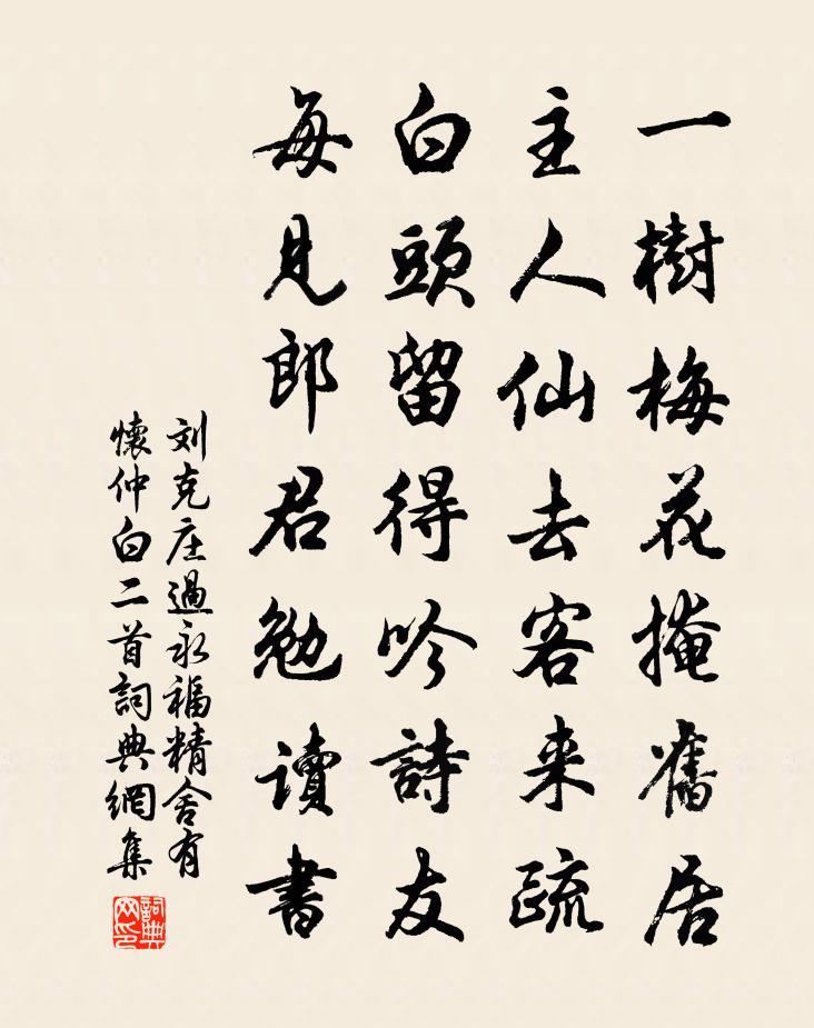 詩詞名句歷史字典書法欣賞書法字典國語詞典說文解字康熙字典古漢語字典標 題 作 者 詩 句 過永福精舍有懷仲白二首作者:劉克莊 朝代:宋代過永福精舍有懷仲白二首原文一樹梅花掩舊居,主人仙去客來疏。白頭留得吟詩友,每見郎君勉讀書。詩詞問答問:過永福精舍有懷仲白二首的作者是誰?答:劉克莊問:過永福精舍有懷仲白二首寫於哪個朝代?答:宋代問:劉克莊的名句有哪些?答:劉克莊名句大全劉克莊過永福精舍有懷仲白二首書法欣賞過永福精舍有懷仲白二首書法作品詩詞推薦泊廬江縣界幾遭寇掠董嗣杲〔宋代〕酒興那如歸興濃,此行誰信破囊空。扁舟小艤廬江外,雨夜深埋虎穴中。獨客痛心無可說,何人料事偶相同。昏時西園十詠方物亭吳中復〔宋代〕草林蟲魚部,披尋自古無。飛沉天產異,生植土風殊。物色隨心匠,形容記繪圖。虛亭玩真意,浩思滿江湖。知邵武縣禱雨大有感應任滿作詩紀其事張士遜〔宋代〕乞靈曾爇一爐煙,言下滂沱救旱田。今日解龜留數字,要教來者更恭虔。題陳主管小壺天三首陳造〔宋代〕未放歌雲散,先看醉帽偏。周郎自醇酎,樂廣定青天。持勝收賢業,推枰睨世緣。明年一品手,卻訪玉堂仙。又借答送蟹韻並戲小何黃庭堅〔宋代〕草泥本自行郭索,玉人為開桃李顏。恐似曹瞞說雞肋,不比東阿舉肉山。題束季博山園二十首薝蔔林牟巘五〔宋代〕都將千石危,化作一林雪。盡日無別香,五月何曾熱。清平樂劉過〔宋代〕新來塞北。傳到真訊息。赤地居民無一粒。更五單于爭立。維師尚父鷹揚。熊羆百萬堂堂。看取黃金假鉞,歸來異春半朱淑真〔宋代〕拭目憑闌久,柔風拂面吹。鶯花爭嫵媚,詩酒斗清奇。已近清明節,初過上巳時。莫縈尋俗事,隨意樂春熙。李徽猷病後許賞蓮而未酬小詩發一笑陳元晉〔宋代〕僧夏分來一榻涼,愛蓮更壇水雲鄉。露融初日敷朝采,雨卷涼飈送晚香。天女群參青葉髻,水仙爭護紫荷囊。一絲題孫倅面山軒詩朱翌〔宋代〕舉頭直北看青山,低頭真下覷黃卷。黃卷辛勤有時厭,青山於人保不變。山作主人我為客,主人看客長不倦。今代新夏趙希邁〔宋代〕四月寒猶在,日高常掩扉。縱收風外絮,難暖客中衣。新竹筍多瘦,殘梢花最肥。有情雙燕子,能認舊巢歸。生朝前一日過隆慶十里得老人書中詩因用尊韻洪咨夔〔宋代〕劍棧高寒潦水空,兒心片片趁歸鴻。喜聞禪觀如黃薜,想見仙風過赤松。利慾無厭騎鶴客,功名有定賦狙翁。萬鍾題水雲亭劉升道福唐所居朱翌〔宋代〕沙合南台會有期,沙邊築屋俯清漪。宋香陳紫丹成後,渭綠湘斑族盛時。長者時懷流水念,老兄元愛白雲知。一塵木蘭花慢 陪安參政宴吳山盛氏樓張野〔元代〕愛吳山佳處,凝望際,眼增明。正簾卷江濤,屏開罨畫,境接蓬瀛。中朝相君寬厚,領太平、歌吹宴簪纓。巧囀雛早行鳴山二首楊萬里〔宋代〕淡淡清霜薄薄冰,膮寒端為作新晴。殷懃喚醒梅花睡,枝上春禽一兩聲。秋日同文館詩張耒〔宋代〕騎列千床直,雲羅萬卷齊。舒妍交孔翠,爭味雜柤梨。白日諸侯貢,青春天老題。秋清文酒健,莫嘆羽林閨。聲鳴悲秋辭白玉蟾〔宋代〕蟲聲樹聲各已變,吾知流年暗中換。晝烏夜兔忙如箭,各光漸入蘆花岸。蘆花白兮蓼花紅,鴻雁跧蹲滿荻叢。牡丹酴醿滕岑〔宋代〕向人未肯吐芳心,玉困香融已不禁。久矣禪心無色想,如何對此獨沉吟。與同年李定言曲水閒話戲作李商隱〔唐代〕海燕參差溝水流,同君身世屬離憂。相攜花下非秦贅,對泣春天類楚囚。碧草暗侵穿苑路,珠簾不捲枕江樓。莫驚旅舍書事楊時〔宋代〕懶拙乖時尚,支離與世殊。饋漿驚禦寇,避席愧陽居。觸事紛難解,忘形色易鋤。不須修混沌,機械本來無。名句推薦台榭空濛煙柳暗,白鳥銜魚欲舞。納蘭性德《摸魚兒·午日雨眺》 交親望歸騎,幾處擁年華。盧僎《歲晚還京台望城闕成口號先贈交親》 萬里煙塵。回首中原淚滿巾。朱敦儒《採桑子·彭浪磯》 花徑不曾緣客掃,蓬門今始為君開。杜甫《客至》 脫鞍暫入酒家壚,送君萬里西擊胡岑參《送李副使赴磧西官軍》 人事有代謝,往來成古今。孟浩然《與諸子登峴山》 承恩不在貌,教妾若為容。杜荀鶴《 * 怨》 女蘿發馨香,菟絲斷人腸。李白《古意》 此身如傳舍,何處是吾鄉。蘇軾《臨江仙·送王緘》 面譽者不忠,飾貌者不情戴聖《大戴禮記·文王官人第七十二》