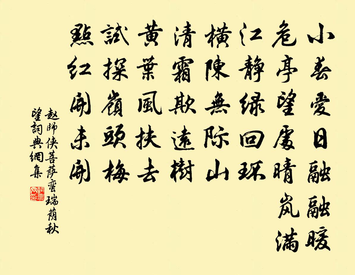 詩詞名句歷史字典書法欣賞書法字典國語詞典說文解字康熙字典古漢語字典標 題 作 者 詩 句 菩薩蠻(瑞蔭秋望)作者:趙師俠 朝代:宋代菩薩蠻(瑞蔭秋望)原文小春愛日融融暖。危亭望處晴嵐滿。江靜綠迴環。橫陳無際山。清霜欺遠樹。黃葉風扶去。試探嶺頭梅。點紅開未開。詩詞問答問:菩薩蠻(瑞蔭秋望)的作者是誰?答:趙師俠問:菩薩蠻(瑞蔭秋望)寫於哪個朝代?答:宋代問:菩薩蠻(瑞蔭秋望)是什麼體裁?答:詞趙師俠菩薩蠻(瑞蔭秋望)書法欣賞菩薩蠻(瑞蔭秋望)書法作品詩詞推薦和張民朝謁建隆寺二次用寫望試筆韻梅堯臣〔宋代〕時不選數老獨嗟,鬢毛未變目未花。愛公深殿見桃李,長才高詠無能加。紅英灼灼弄日色,穠艷皎皎生鉛華。長廊廬江道中二首王阮〔宋代〕老大添身倦,飄零減性豪。路塵知旱苦,山瘦覺秋高。若有持衡分,慚無汗馬勞。九原如可作,公瑾笑吾曹。因大師請贊釋師範〔宋代〕不是神,不是鬼。突出人前,是何面嘴。妙因等閒覷破,扣齒擎拳頂禮。唵蘇嚧蘇嚧{左口右悉}唎{左口右悉}送韋十二丈赴襄城令三韻(柳字)權德輿〔唐代〕留連出關騎,斟酌臨岐酒。舊業傳一經,新官栽五柳。去去望行塵,青門重回首。紹興祀神州地祗十六首佚名〔宋代〕[函鍾為宮]芒芒下土,恢恢方和。富媼統報,潛運八維。爰稱元祀,告和吉時。揭茲虔恭,優其格思。意難忘張炎〔宋代〕風月吳娃。柳陰中認得,第二香車。春深妝減艷,波轉影流花。鶯語滑,透紋紗。有低唱人夸。怕誤卻,周郎醉眼送張寺丞李覯〔宋代〕三載居鄰縣,得聞金玉音。路遙相見少,道合受知深。已矣瓜時戍,悠哉魏闕心。歸舟望不及,白日隱寒林。東林寺范成大〔宋代〕談易翻經宰木春,三生猶自裊煙燻。客塵長隔虎溪水,劫火不侵香谷雲。老矣懶供蓮社課,歸哉忺讀草堂文。山頭和項平父送別孫應時〔宋代〕長江風景舊聞知,雪裡經行變大奇。官舍荒涼乏松竹,邊城清晏少文移。有時懷古登臨久,自省無才職分卑。白日玉京山王哲〔元代〕失笑迷陰化不來。頑愚心鎖硬,怎生開。直饒富貴沒殃災。天年限,終久落輪迴。鬼使早相催。兒孫難替得,有何酬潘景玉林景熙〔宋代〕讀史雙眸夜炯然,一聲江雁落燈前。馬非汗血材終下,木或青黃性不全。風月未容詩入務,乾坤應許酒為年。寒城雜詩黃庭堅〔宋代〕 * 淡盪不知津,老卻平生夢幻身。滿眼紛華心寂寞,長安市上酒家人。送山茶上知府郎給事釋重顯〔宋代〕穀雨前收獻至公,不爭春力避芳叢。煙開曾入深深塢,百萬槍旗在下風。舜兄南山為僧後歸東林釋紹曇〔宋代〕新生白額眼光搖,肯向南山戀舊巢。背蹭西風行一轉,人驚不過虎溪橋。逍遙詠宋太宗〔宋代〕不醉迷如醉,猶貪居鼎扛。通玄求得一,清靜更無雙。鸞鳳棲瑤渚,天津壓漢江。欲窮何所似,夜月透雲窗。宿溧陽靈泉精舍僧以白字韻請留詩許堅〔唐代〕近枕吳溪與越峰,前朝恩錫靈泉額。竹林晴見雁塔高,石室增棲幾禪伯。荒碑字沒秋苔深,古池香泛荷花白。客有吳江道中楊冠卿〔宋代〕野色蒼煙闊,篷籠宿雨開。湖光與天接,林彩覺春回。心事歸雙鬢,年華付一杯。松江元赴海,流駛更須催。次韻康慶之題予桐江詩卷方回〔宋代〕小儒百窘似貧戶,薪及扅襦作褌。梓澤珊瑚許窺否,未多玉璞與金渾。到荊州春物正佳樞使王公招宴歡甚已而幕府諸孫應時〔宋代〕初日明遠岸,綠蕪滿平川。天宇呈春姿,物物懷芳妍。長堤行車馬,高樓余管弦。由來大國楚,風景故依然。賀聖朝(雙調)張先〔宋代〕淡黃衫子濃妝了。步縷金鞋小。愛來書幌綠窗前,半和嬌笑。謝家姊妹,詩名空杳。何曾機巧。爭如奴道,春來情名句推薦星垂平野闊,月涌大江流。杜甫《旅夜書懷》 書卷多情似故人,晨昏憂樂每相親。于謙《觀書》 尚憐終南山,回首清渭濱。杜甫《奉贈韋左丞丈二十二韻》 洛陽親友如相問,一片冰心在玉壺。王昌齡《芙蓉樓送辛漸》 賞賜不能喜,誅罰不能威。墨子《墨子·05章 七患》 從時者,猶救火、追亡人也,蹶而趨之,唯恐弗及。左丘明《國語·越語·越興師伐吳而弗與戰》 木葉紛紛下,東南日煙霜。劉昚虛《暮秋揚子江寄孟浩然》 美不美,鄉中水;親不親,故鄉人。佚名《增廣賢文·上集》 君子博學而日參省乎己,則知明而行無過矣。荀子《荀子·勸學》 意長翻恨遊絲短。盡日相思羅帶緩。嚴仁《玉樓春·春思》