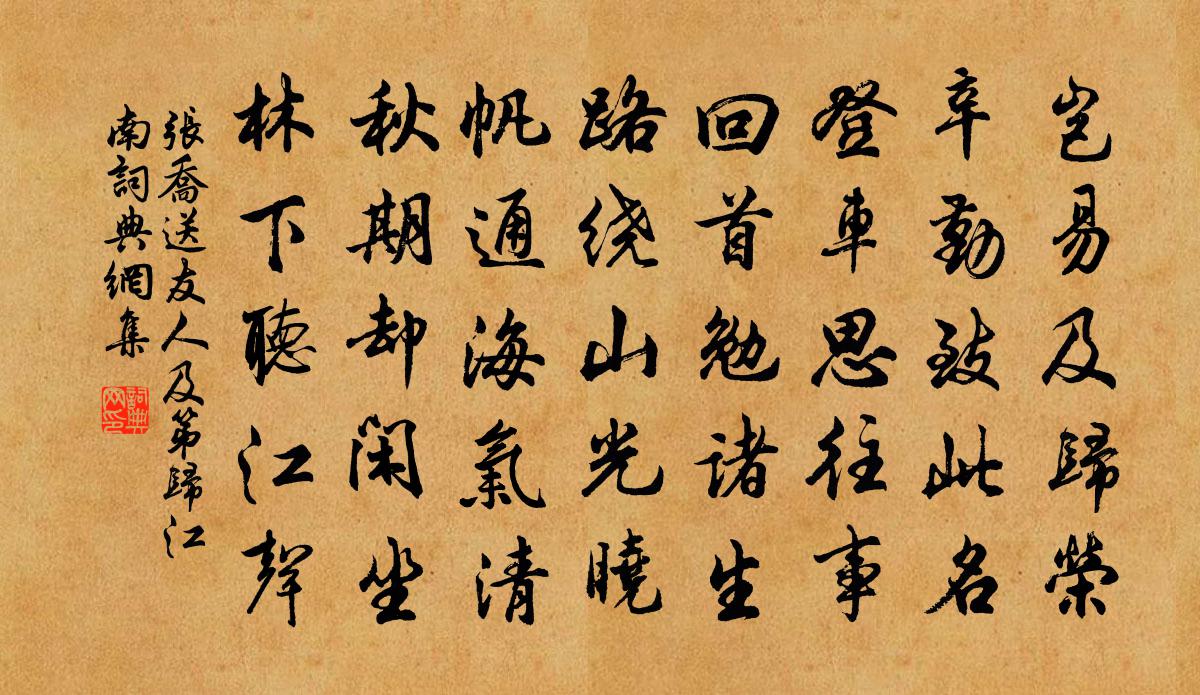 詩詞名句歷史字典書法欣賞書法字典國語詞典說文解字康熙字典古漢語字典標 題 作 者 詩 句 送友人及第歸江南作者:張喬 朝代:唐代送友人及第歸江南原文豈易及歸榮,辛勤致此名。登車思往事,回首勉諸生。路繞山光曉,帆通海氣清。秋期卻閒坐,林下聽江聲。詩詞問答問:送友人及第歸江南的作者是誰?答:張喬問:送友人及第歸江南寫於哪個朝代?答:唐代問:送友人及第歸江南是什麼體裁?答:五律張喬送友人及第歸江南書法欣賞送友人及第歸江南書法作品注釋全唐詩:卷638-82詩詞推薦出火祀大辰十二首佚名〔宋代〕有嚴在條,陳彼牲牢。孔碩其俎,薦此血毛。厥初生民,飲如則然。以燔以炙,伊誰雲先。奉和陳閣老寒食初假當直,從東省往集賢,因權德輿〔唐代〕繁花滿樹似留客,應為主人休浣歸。次韻十絕修養樓鑰〔宋代〕聞道壺中別有天,能將俄頃比千年。千年俄頃俱成夢,只任天真卻晏然。孟津歲晚十首宋庠〔宋代〕隱軫分河壤,崢嶸念歲華。關雲沈鞏樹,樓月嘯羌笳。要路誰雲騁,浮生會有涯。高哉羨門子,橫海挹朝霞。盱眙館中題雲山圖章甫〔宋代〕北風三日吹黃土,長淮浪高少人渡。客愁正坐小窗間,眼明見此江南山。好山連娟螺髻鬟,白雲無心終日閒。野橋鸚鵡曲 陸羽風流馮子振〔元代〕兒啼漂向波心住。捨得陸羽喚誰父。杜司空席上從容,點出茶甌花雨。散蓬萊兩腋清風,未便玉川仙去。待中泠一沁園春(送趙運使之江西)黃機〔宋代〕有美一人,昔在何居,今方見之。儼瓊纓翠弁,氣清芬只,珠幢絳節,光陸離兮。吾道非耶,世情復爾,天驥昂藏南浦寇準〔宋代〕春色入垂楊,煙波漲南浦。落日動離魂,江花泣微雨。游郭希呂石洞二十詠壺天劉過〔宋代〕逆溪隨水行,更上紫翠峰。朱欄忽飛閣,映帶煙霞重。鳥夜啼 含暉亭芍藥謝劉敏中〔元代〕含暉亭下春風。錦雲叢。臨到開時別去,苦匆匆。人乍到。花已老。酒瓶空。惟有一溪流水,照詩翁。歸自南康寄懷朱使君李呂〔宋代〕過盡重湖復過山,陰凝忽變雪花團。路迷曲折易成遠,風助橫斜巧送寒。憶昨片帆離渡口,特煩千騎駐江乾。如今滿庭芳 重遇吟馬鈺〔元代〕重遇風仙,重增開悟,一心專做痴愚。掀髯勢已,且恁嘴廬都。罷了高談闊論,疏筆硯、不講經書。從今後,孤雲沉醉東風胡紹開〔元代〕漁得魚心滿意足,樵得樵眼笑眉舒。一個罷了釣竿,一個收了斤斧,林泉下偶然相遇。是兩個不識字漁樵士大夫,聲聲慢(飲時貴家,即席三姬求詞)吳文英〔宋代〕春星當戶,眉月分心,羅屏繡幕圍香。歌緩□□,輕塵暗簌文梁。秋桐泛商絲雨,恨未回、飄雪垂楊。連寶鏡,更送翁誠之尉慈谿陳傅良〔宋代〕詩律吾將問,心期孰與親。明朝當異縣,永夜更懷人。尚友逢三益,明農識大臣。可無相問訊,勿道鬢毛新。武陵春(重陽)曹勛〔宋代〕今歲重陽經閏早,金蕊粲繁枝。玉殿珠樓步輦隨。高興在東籬。且泛金英同瀲灩,休與傲霜期。只恐秋香一夜衰。奉和幸安樂公主山莊應制劉憲〔唐代〕主家別墅帝城隈,無勞海上覓蓬萊。沓石懸流平地起,危樓曲閣半天開。庭莎作薦舞行出,浦樹相將歌棹回。此日江城子秦觀〔宋代〕清明天氣醉游郎。鶯兒狂。燕兒狂。翠蓋紅纓,道上往來忙。記得相逢垂柳下,雕玉珮,縷金裳。春光還是舊春光呈孫元素呂祖異〔宋代〕匹馬先來破曉雲,千章喬本翠繽紛。山圍道院窗窗見,泉出丹池處處分。酒好便能澆磈磊,飯香何必御羶葷。明朝贈景和尚院貫休〔唐代〕藏經看幾遍,眉有數條霜。萬境心都泯,深冬日亦長。窗虛花木氣,衲掛水雲鄉。時說秋歸夢,峰頭雪滿床。名句推薦微風搖紫葉,輕露拂朱房。沈約《詠芙蓉》 流水孤村,荒城古道。陳霆《踏莎行·晚景》 西風潑眼山如畫,有黃花休恨無錢。張可久《風入松·九日》 林暗草驚風,將軍夜引弓。盧綸《和張僕射塞下曲·其二》 雲鬢花顏金步搖,芙蓉帳暖度春宵。白居易《長恨歌》 兒童強不睡,相守夜歡嘩。蘇軾《守歲》 昭昭若日月之明,離離如星辰之行劉勰《文心雕龍·宗經》 人有不為也,而後可以有為。孟子《孟子·離婁章句下·第八節》 遙憐小兒女,未解憶長安。杜甫《月夜》 彭蠡湖天晚,桃花水氣春。白居易《彭蠡湖晚歸》