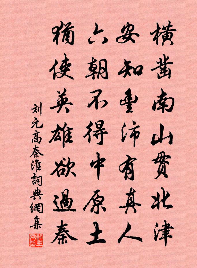 詩詞名句歷史字典書法欣賞書法字典國語詞典說文解字康熙字典古漢語字典標 題 作 者 詩 句 秦淮作者:劉元高 朝代:宋代秦淮原文橫鑿南山貫北津,安知豐沛有真人。六朝不得中原土,猶使英雄欲過秦。詩詞問答問:秦淮的作者是誰?答:劉元高問:秦淮寫於哪個朝代?答:宋代劉元高秦淮書法欣賞秦淮書法作品詩詞推薦桂湖五首曾國藩〔清代〕遂劉華陽國,歸程始此賒。翻然名境訪,來及夕陽斜。翠竹偎寒蝶,丹楓噪幕鴉。詞人云異代,臨水一咨嗟。林下留別道友齊己〔唐代〕住亦無依去是閒,何心終戀此林間。片雲孤鶴東西路,四海九州多少山。靜坐趁涼移樹影,興隨題處著苔斑。秋來望江南(雨)黃公紹〔宋代〕思晴好,去上竹山窠。自古常言光霽好,如今卻恨雨聲多。奈此坐愁何。和諸庵花光十梅頌王柏〔宋代〕江頭千樹紛紛,紙上不堪狼藉。翻思洞口風流,忽見半梢橫出。八璽蘇轍〔宋代〕秦人一璽十五城,百二十城當八璽。元日臨軒組綬新,君臣相顧無窮喜。九鼎崢嶸夏禹余,八璽錯落古所無。古人江上散步尋梅偶得三絕句陸游〔宋代〕小南門外野人家,短短疏籬練白沙。紅稻不須鸚鵡啄,清霜催放兩三花。雜詩李復〔宋代〕高松懷正氣,挺特入空碧。短棘無直枝,千鉤未成尺。松生倚雲岡,棘散傍道側。道側侵行人,牽衣去不得。絲蔓郊廟歌辭。昭德皇后廟樂章。舒和佚名〔唐代〕金枝羽部徹清歌,瑤台肅穆笙磬羅。諧音遍響合明意,萬類昭融靈應多。包山書院張道洽〔宋代〕銜命龍荒萬里余,歸尋水竹與同居。早從洙泗傳心學,晚辟包山教子書。細草幽花香筆硯,清風明月滿庭除。一生三十六灣許渾〔唐代〕縹緲臨風思美人,荻花楓葉帶離聲。夜深吹笛移船去,三十六灣秋月明。圓書記之錢唐釋智愚〔宋代〕誰管點魚上竹竿,拚身捱得髑髏乾。者回歸去西湖上,犢草鷗波不亂看。贈卜道人二首袁燮〔宋代〕道人怪我年如許,宿債胡為未盡償。寧識吾心烈於火,得歸要下便清涼。言懷仇遠〔宋代〕馬蹄赤日走紅塵,汗濕林宗折角巾。輸與夷山班博士,深衣脫卻作閒人。送陳尉別二首李呂〔宋代〕奕世雄題雁塔名,於今父子自師生。詞場魚貫真無敵,慶事蟬聯盡有聲。雅興莫追吳市隱,橫飛端繼紫微明。從來題劉氏綠映亭二首呂祖謙〔宋代〕鷺浴魚跳在鏡屏,搖青浮碧太鮮明。牆東種得陰成幄,隔葉看來卻有情。淳熙十六年皇后冊寶十三首佚名〔宋代〕華榱壁璫,有聲椒殿。備物來陳,多德式煥。日冊日實,是刻是互。閏舉以行,皇矣懿典。句釋曉瑩〔宋代〕寂寂饒孤興。絕句三首龐謙孺〔宋代〕楚天落日暮雲浮,痛飲狂歌不覺愁。醉眼山光似鄉曲,怎知身在漢江頭。泛湖次柳洲二首曹勛〔宋代〕淨舍乘閒一葦航,入門松竹獻清涼。倚欄澄碧龜魚樂,照眼荷花風露香。水調歌頭(壽歐陽景明)廖行之〔宋代〕蒼立籜龍秀,青壓雨梅肥。清和天氣,無限佳景屬斯時。試聽虞弦初理,便有熏兮入奏,風物正熙熙。此日定何日名句推薦一點浩然氣,千里快哉風。蘇軾《水調歌頭·黃州快哉亭贈張偓佺》 一棹碧濤春水路。過盡曉鶯啼處。晏幾道《清平樂·留人不住》 雲邊雁斷胡天月,隴上羊歸塞草煙。溫庭筠《蘇武廟》 人有悲歡離合,月有陰晴圓缺,此事古難全。蘇軾《水調歌頭·丙辰中秋》 寒山幾堵,風低削碎中原路,秋空一碧無今古。陳維崧《醉落魄·詠鷹》 輕汗微微透碧紈,明朝端午浴芳蘭。蘇軾《浣溪沙·端午》 移舟泊煙渚,日暮客愁新。孟浩然《宿建德江》 聽元宵,今歲嗟呀,愁也千家,怨也千家。王磐《古蟾宮·元宵》 那堪更被明月,隔牆送過鞦韆影。張先《青門引·春思》 年年郡縣送征人,將與遼東作丘坂。王建《遼東行》