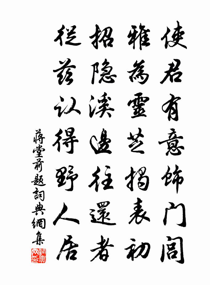 詩詞名句歷史字典書法欣賞書法字典國語詞典說文解字康熙字典古漢語字典標 題 作 者 詩 句 前題作者:蔣堂 朝代:宋代前題原文使君有意飾門閭,雅為靈芝揭表初。招隱溪邊往還者,從茲認得野人居。詩詞問答問:前題的作者是誰?答:蔣堂問:前題寫於哪個朝代?答:宋代蔣堂前題書法欣賞前題書法作品詩詞推薦中和樂九章歌明堂第二盧照鄰〔唐代〕穆穆聖皇,雍雍明堂。左平右墄,上圓下方。調均風雨,制度陰陽。四窗八達,五室九房。南通夏火,西瞰秋霜。寄秋山和尚黃庚〔宋代〕幾夜孤吟憶貫休,疏鐘敲月動詩愁。何人來入匡廬社,分我山中一半秋。風流子(范覺民生日)王之望〔宋代〕江國東風早,芳菲又、迤邐報寒梅。正元氣孕和,小春歸候,數丁千載,喜動三台。向此際,上天開景運,王國產齋中焚香宴坐宋庠〔宋代〕耳界千聲外,爐薰一室中。妙心那有住,真意本無空。香飯凝盂白,天花蔽席紅。閒觀色身相,方信幻人工。題韓侂胄舊第國子監生〔宋代〕花柳依然弄晚風,才郎袖手去無蹤。不知郿塢金多少,爭似盧門席不重。寄白司馬徐凝〔唐代〕三條九陌花時節,萬戶千車看牡丹。爭遣江州白司馬,五年風景憶長安。幽居院陸游〔宋代〕久墮塵沙里,幽尋始此行。侵雲千嶂合,披草一僧迎。蘚潤泉時滴,崖傾竹倒生。登高忽平曠,回首失崢嶸。老矣庭檜呈蔣潁叔曾鞏〔宋代〕櫂枝高下秀森森,曾寄名卿異俗心。草舍一時成往事,松身千尺見新陰。聲清不受笙竽雜,氣勁能遺霰雪侵。漢節登鵝鼻山至絕頂訪秦刻石且北望大海山路危甚陸游〔宋代〕街頭旋買雙芒屩,作意登山殊不惡。蒼崖無罅竹鞭逸,崩石欲墜松根絡。憑高開豁快送目,歷險崎嶇危著腳。川雲次韻陶明甫陶夢桂〔宋代〕寸質元非紫磨金,少地徒有濟時心。中年世味諳常盡,晚節宗門趨向深。萬境皆空何所著,百年未滿得長吟。人間和陶雜詩十一首蘇軾〔宋代〕孟德黠老狐,奸言嗾鴻豫。哀哉喪亂世,梟鸞各騰翥。逝者知幾人,文舉獨不去。天方斲漢室,豈計一郗慮。昆蟲和秦壽之題靖安棲霞觀王之道〔宋代〕飛觀臨無地,江天在目中。晚霞工射日,秋水欲浮空。蓼岸深迷綠,楓林遠映紅。歸歟還可喜,千里一帆風。和遺綃女子張資〔宋代〕自得佳人遺贈物,書窗終自獨無寥,未能得會真仙面,時賞香囊與絳綃。浣溪沙李處全〔宋代〕宋玉應當久斷腸。滿城風雨盡重陽。年年戲馬憶吾鄉。催促東籬金蕊放,佳人更繡紫萸囊。白衣才到共飛觴。浯溪易士達〔宋代〕阿瞞南幸國幾危,顛倒皆由豢祿兒。休說馬嵬當日事,浯溪且細讀元碑。貴游杜牧〔唐代〕朝回佩馬草萋萋,年少恩深衛霍齊。斧鉞舊威龍塞北,池台新賜鳳城西。門通碧樹開金鎖,樓對青山倚玉梯。南陌以長歌意無極好為老夫聽為韻奉別沔鄂親友姜夔〔宋代〕中郎逝千霜,曲高復誰為。龐翁趣無弦,鄭伯功斬鼻。春風桃花溪,寒淥繞蒼翠。何當從兩君,放浪討幽事。客好舒岳祥〔宋代〕薄田歲罕收,柴門客多好。車轍處厲趣,蒿萊不須掃。鄰家知客到,亦復饋梨棗。酒盡當復沽,言論自顛倒。萬事幽居初夏陸游〔宋代〕梅塢青黃子,草陂紅紫花。雙鵝朝戲浦,群鴨暮還家。赤腳挑殘筍,蒼頭摘晚茶。出門逢野老,滿意說桑麻。【正宮】塞鴻秋_功名萬里忙薛昂夫〔元代〕功名萬里忙如燕,斯文一脈微如線。光陰寸隙流如電,風霜兩鬢白如練。盡道便休官,林下何曾見?至今寂寞彭澤名句推薦夫魚食其餌,乃牽於緡;人食其祿,乃服於君。姜子牙《六韜·文韜·文師》 空山不見人,但聞人語響。王維《鹿柴》 高風吹玉柱,萬籟忽齊飄司空曙《風箏》 保民而王,莫之能御也。孟子《孟子·梁惠王章句上·第七節》 白雲江上故鄉,月下風前吟處。子蘭《秋日思舊山》 朱門沉沉按歌舞,廄馬肥死弓斷弦。陸游《關山月》 八月寒葦花,秋江浪頭白。李頎《送劉昱》 雨前初見花間蕊,雨後兼無葉里花。王駕《雨晴》 何時詔此金錢會,暫醉佳人錦瑟旁。杜甫《曲江對雨》 憶年十五心尚孩,健如黃犢走復來。杜甫《百憂集行》