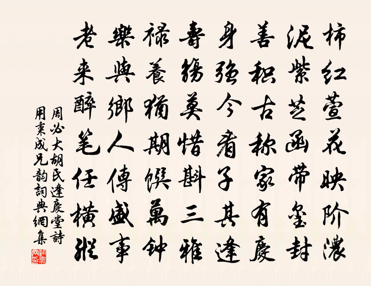 詩詞名句歷史字典書法欣賞書法字典國語詞典說文解字康熙字典古漢語字典標 題 作 者 詩 句 胡氏逢慶堂詩用秉成兄韻作者:周必大 朝代:宋代胡氏逢慶堂詩用秉成兄韻原文柿紅萱花映階濃,泥紫芝函帶璽封。善積古稱家有慶,身強今看子其逢。壽觴莫惜斟三雅,祿養猶期饌萬鍾。樂與鄉人傳盛事,老來醉筆任橫縱。詩詞問答問:胡氏逢慶堂詩用秉成兄韻的作者是誰?答:周必大問:胡氏逢慶堂詩用秉成兄韻寫於哪個朝代?答:宋代周必大胡氏逢慶堂詩用秉成兄韻書法欣賞胡氏逢慶堂詩用秉成兄韻書法作品詩詞推薦池水二首楊萬里〔宋代〕池底枯荷瘦不勝,池水新琢玉壺凝。如何留到炎蒸日,上有荷花下有水。滿江紅呂渭老〔宋代〕晚浴新涼,風蒲亂、松梢見月。庭陰盡、暮蟬啼歇。螢繞井闌簾入燕,荷香蘭氣供搖箑。賴晚來、一雨洗游塵,無依韻奉和來篇李至〔宋代〕紅塵赤日欲相燃,賴向蓬丘少事牽。明月動搖紈扇室,亂雲重疊火□天。幽屏看雪思寒景,小簟橫風戀晝眠。安得客興王冕〔元代〕鶴鳴猿嘯近如何,客里枯衣結薜蘿。峽石臥雲山氣重,江風翻雨樹聲多。狂夫對酒評秦法,野老敲檀和楚歌。誰似桃源憶故人 因趙元帥舍人出示用其韻王丹桂〔元代〕人生百歲誠稀少。此事任誰明曉。相見但開口笑。管甚閒悲惱。四時風月尋常好。放下心腸便了。雖是身難恆少。李丞相綱生朝三首張元乾〔宋代〕梁溪萬折必流東,間氣英姿葉夢熊。出入三朝推大老,險夷一節合蒼穹。守關虎豹徒窺闖,得雨蛟龍定長雄。袞繡文明殿受冊封閩王翁承贊〔唐代〕龍墀班聽漏聲長,竹帛昭勛撲御香。鳴佩洞庭辭帝主,登車故里冊閩王。一千年改江山瑞,十萬軍蒙雨露光。吟寄甲子語溪閔雨四首黃榦〔宋代〕老夫年來百不悲,夜聽群兒聲吾伊。呼兒握手長太息,不見儂家數口飢。寓齋李呂〔宋代〕萍梗天地間,初不異萬物。可能發深省,惟有一事實。道中遇雨曾幾〔宋代〕客子祈晴意未公,林間布穀勸春農。雨師若有分風手,留取車輪一道通。將發循州社日於所居館宴送趙嘏〔唐代〕浪花如雪疊江風,社過高秋萬恨中。明日便隨江燕去,依依俱是故巢空。雪中登垂虹亭武衍〔宋代〕投箠江邊雪滿頭,玉虹千尺要詩酬。詩成上馬誰同說,說似亭前兩白鷗。無夢令 詠圍棋藏頭 拆起目字王哲〔元代〕下圍棋取樂。閒白烏交錯。者好關機,度輸贏憂謔。作。言作。看這拜賜宮花紀恩詩許應龍〔宋代〕濟濟蹌蹌藹縉紳,祝堯均效華封人。觴稱鳳闕懽聲沸,花錫鸞枝內樣新。露葉巧裁隋苑彩,天葩先借漢宮春。舉頭句王隨〔宋代〕竹韻扣寒玉,苔花疊碧錢。送斗山兄隱居石耳山汪炎昶〔宋代〕遙望石耳山嶙峋,咆哮虎豹林潤深。山屏倚翠障殘日,石劍攢鋒鎪太陰。豈有漁人可間訊,苦憐木客長衰吟。似聞和任大夫贈別胡寅〔宋代〕未老先衰負疾憂,敢貪榮祿尚為州。已慚騷客能招隱,更愧疲民欲借留。斤斧且廳存夜氣,江湖那得獻辰猷。新詩水調歌頭(徐侍郎生辰)楊無咎〔宋代〕寥亮度弦管,笑語集簪纓。又逢華旦爭慶,豪傑為時生。猶對中秋月影,漸放重陽菊蕊,萬寶正西成。爽氣知多少題龔山長棲閣劉過〔宋代〕愛客龔山長,能容日日過。栽培初種竹,愛護乍生荷。堂對青山短,門關白日多。細聽間議論,不似我狂歌。曹氏寒碧即事葛紹體〔宋代〕屋頭楊柳綠參差,小竹疎花此更宜。簾漾水紋閒晝日,早秋風物似春時。名句推薦寧知寸心裡,蓄紫復含紅!沈約《詠新荷應詔》 言則稱於湯文,行則譬於狗豨,傷矣哉。墨子《墨子·46章 耕柱》 為學日益,為道日損。損之又損,以至於無為。老子《老子·德經·第四十八章》 迢迢新秋夕,亭亭月將圓。陶淵明《戊申歲六月中遇火》 垂緌飲清露,流響出疏桐。虞世南《蟬》 愁因薄暮起,興是清秋發。孟浩然《秋登蘭山寄張五》 今日大風寒,寒風摧樹木,嚴霜結庭蘭佚名《孔雀東南飛並序/古詩為焦仲卿妻作》 舉觴酹先酒,為我驅憂煩。柳宗元《飲酒》 唯不求利者為無害,唯不求福者為無禍。劉安及其門客《淮南子·詮言訓》 晚來天,空悄然,孤眠,枕檀雲髻偏。孫光憲《河傳·花落》