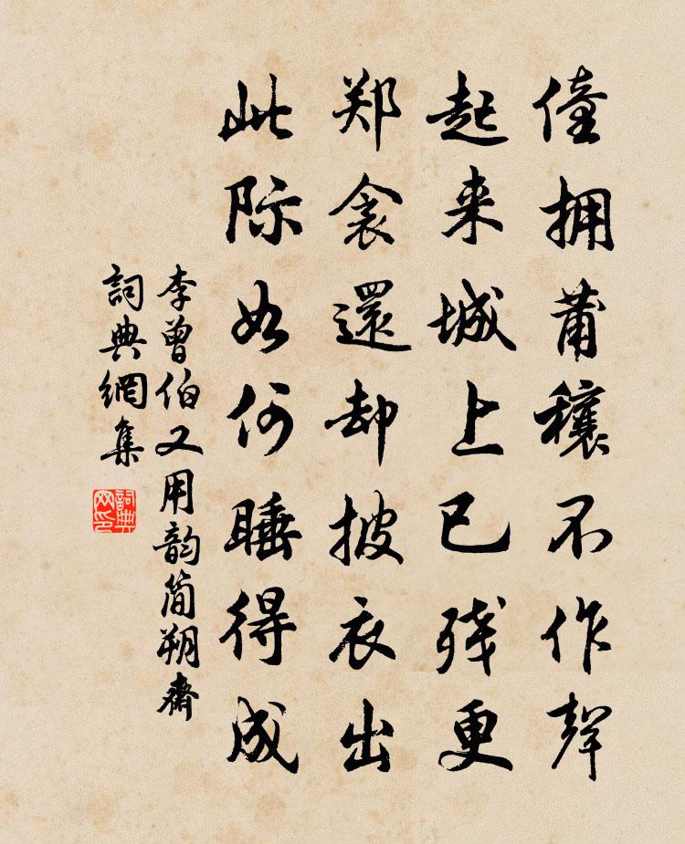 詩詞名句歷史字典書法欣賞書法字典國語詞典說文解字康熙字典古漢語字典標 題 作 者 詩 句 又用韻簡朔齋作者:李曾伯 朝代:宋代又用韻簡朔齋原文僮擁莆穰不作聲,起來城上已殘更。鄭衾還卻披衣出,此際如何睡得成。詩詞問答問:又用韻簡朔齋的作者是誰?答:李曾伯問:又用韻簡朔齋寫於哪個朝代?答:宋代李曾伯又用韻簡朔齋書法欣賞又用韻簡朔齋書法作品詩詞推薦偈頌四十一首釋普寧〔宋代〕右脅才生,便放拍盲。指天指地,獨步縱橫。雲門要打殺,建長助掘坑。惡種從教不復萌,雖然也是賊過後張弓。感事王鐐〔唐代〕擊石易得火,扣人難動心。今日朱門者,曾恨朱門深。千秋歲(追和秦少游)王之道〔宋代〕山前湖外。初日浮雲退。荷氣馥,槐陰碎。葵花紅障錦,萱草青垂帶。誰得似,黃鸝求友新成對。憶昔東門會。千短歌行陸游〔宋代〕百年酒鼎鼎世共酒悲,晨鐘酒暮鼓無休時。碧酒紅杏易零落,翠眉玉頰多別離。涉江采菱風敗意,登樓侍月云為祟謁雲藍山先越公墓汪宗臣〔宋代〕此生未展雲藍墓,鬱郁甘棠孫子情。今度忽為寒食客,欣欣喬木歲時榮。堯天日月重光顯,越國江山幾變更。回首金剛隨機無盡頌知見不生分第三十一釋印肅〔宋代〕能有幾人知。鼓是兩頭皮,禾山打不迷。道吾聞舉笏,和農師四和前韻仍有推獎鄙薄之句再次韻蘇頌〔宋代〕敬輿平日始來西。老拙方叨掌武泥。初見魚龍起騰躍,從陪鵷鷺共牽攜。儒林盛會沾恩飫,雲閣新圖預客題。更聽題西施拜心圖姚勉〔宋代〕紵羅山頭浣紗余, * 嬌擁擁顰不舒。高軒直蓋填寒閭,東家少婦羞弗如。越宮選進吳王側,光照姑蘇春奪色。鴟清平樂馮延巳〔唐代〕深冬寒月,庭戶凝霜雪。風雁過時魂斷絕,塞管數聲嗚咽。披衣獨立披香,流蘇亂結愁腸。往事總堪惆悵,前歡休九日答張謀父見招賀鑄〔宋代〕昨夜新霜滿菊叢,起來何面對西風。白衣送酒無訊息,賴有西鄰張長公。再留幾復黃庭堅〔宋代〕客興蓮藕敝鶉衣,蓮藕囊金罄褭蓮藕蹄。羸驂蓮藕多斷轡,垢發不勝篦。道德千年事,窮通一理齊。晚田猶溉種,宴邊將張喬〔唐代〕一曲梁州金石清,邊風蕭颯動江城。座中有老沙場客,橫笛休吹塞上聲。戲詠白羅系髻王氏〔宋代〕香羅如雪縷新裁,惹住烏雲不放回。還似遠山秋水際,夜來吹散一枝梅。受誓戒李若水〔宋代〕秋月淨如璧,影著烏帽寒。殘夢未辭睫,疲駑兀難安。龍津橋下路。燈火半斕斑。中台門已敞,風細簾幕乾。有司喜侯十七校書見訪耿湋〔唐代〕東城獨屏居,有客到吾廬。發廩因舂黍,開畦復剪蔬。許酣令乞酒,辭窶任無魚。遍出新成句,更通未悟書。藤絲句陳輔〔宋代〕雲樹天低楚,煙汀地失吳。送於員外歸隱藍田吳融〔唐代〕曾吟工部兩峰寒,今日星郎得掛冠。吾道不行歸始是,世情如此住應難。圍棋已訪生雲石,把釣先尋急雨灘。若遇齊堯佐寄詩許予授代歸谷城日相過次韻王之望〔宋代〕故人千里去,猶記別時歌。衰鬢禁愁得,狂懷可奈何。南枝春意動,西望夕陽多。三徑荒涼外,高軒詎肯過。西齋睡起李新〔宋代〕綠雲山麥層層綠,紅雨豀桃處處老殘。老去見花如隔霧,可堪不得霧中看。贈山屋相士方逢振〔宋代〕圓顱方趾具仁端,性體曲來只一般。若見裡頭腔子黑,相書已作死人看。名句推薦桃花仙人種桃樹,又摘桃花換酒錢。唐寅《桃花庵歌》 東君也不愛惜,雪壓霜欺。晁沖之《漢宮春·梅》 縱被春風吹作雪,絕勝南陌碾成塵。王安石《北陂杏花》 馬嘶人散後,秋風換、故園夢裡。吳文英《丁香結·夷則商秋日海棠》 長楊跨武騎,細柳接戎軒。鄭愔《奉和幸望 * 送朔方大總管張仁亶》 飛鴻過也。萬結愁腸無晝夜。蔣氏女《減字木蘭花·題雄州驛》 中秋佳月最端圓。老痴頑。見多番。陳著《江城子·中秋早雨晚晴》 翠華想像空山里,玉殿虛無野寺中。杜甫《詠懷古蹟五首·其四》 鴻雁不堪愁里聽,雲山況是客中過。李頎《送魏萬之京》 他年我若為青帝,報與桃花一處開。黃巢《題菊花》