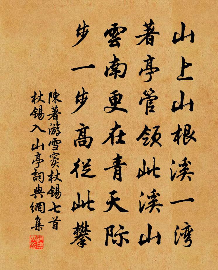 詩詞名句歷史字典書法欣賞書法字典國語詞典說文解字康熙字典古漢語字典標 題 作 者 詩 句 游雪竇杖錫七首杖錫入山亭作者:陳著 朝代:宋代游雪竇杖錫七首杖錫入山亭原文山上山根溪一灣,著亭管領此溪山。雲南更在青天際,步一步高從此攀。詩詞問答問:游雪竇杖錫七首杖錫入山亭的作者是誰?答:陳著問:游雪竇杖錫七首杖錫入山亭寫於哪個朝代?答:宋代陳著游雪竇杖錫七首杖錫入山亭書法欣賞游雪竇杖錫七首杖錫入山亭書法作品詩詞推薦挽饒伯余室氏曾夫人二首曾豐〔宋代〕歸相起家翁,繅紉奮婦庸。初心光四教,末願滿三從。已已谿毛薦,行行馬鬣封。斷機遲後效,黃紙賁青松。偈頌七十二首釋祖欽〔宋代〕同時啐啄不同時,石火電光猶較遲。燈影里行今已會,蹉跎非是落便宜。賈司倉祠堂常勉〔宋代〕自古才難達,司倉與世乖。官雖為言謫,名不共身埋。龕像塵昏壁,詩魂月滿齋。孤墳沒秋草,客到重傷懷。減字木蘭花(贈孫興宗侍兒四首)王之道〔宋代〕修眉山遠。嬌抹烏雲秋水畔。酒里花前。坐擁斯人怎得寒。醁醽浮滿。須索空缸仍覆盞。正恐相妨。歸去如聞笑語對雪寄荊幕知己齊己〔唐代〕猛勢微開萬里清,月中看似日中明。此時鷗鷺無人見,何處關山有客行。郢唱轉高誰敢和,巴歌相顧自銷聲。江齋過武夷韓元吉〔宋代〕不到仙山二十年,道人雙鬢亦皤然。卻看翠嶺千尋石,又汎清溪九曲船。目極已高聊自喜,身輕欲上可無緣。只應次韻黃魯直赤目蘇軾〔宋代〕誦詩得非子夏學,紬史正作丘明書。天公戲人亦薄相,略遣幻醫生明珠。賴君年來屏鮮腴,百千燈光同一如。書成過臥龍先生幽居李新〔宋代〕手調鼎劑作清涼,不秘千金肘後方。閒數嶺雲松自翠,臥聽梅雨藥初香。三山夢斷黃粱熟,一逕莓封白日長。我欲用幾複韻題白氏思堂黃庭堅〔宋代〕夫子勤於蘧伯玉,洗心觀道得靈龜。開門擇友盡三益,清坐不言行四時。風與蛛絲游碧落,日將槐影下隆墀。天空浣溪沙(壽子有)洪咨夔〔宋代〕蒼鶴飛來水竹幽。初弦涼月一簾秋。木犀花底試新篘。鳳味硯供無盡藏,龍飛榜占最高頭。慈闈洗眼看封侯。偈二十二首釋洵〔宋代〕若欲正提綱,直教大地荒。擬來沖雪刃,不免露鋒鋩。遣興陸游〔宋代〕勳業如今莫繫懷,開單日日學僧齋。讒深只有天堪問,憂極渾無地可埋。看鏡已成雙白鬢,登山猶費幾青鞋。晚來上侍御七兄王昌齡〔唐代〕天人俟明路,益稷分堯心。利器必先舉,非賢安可任。吾兄執嚴憲,時佐能釣深。送林若山博赴建粹劉克莊〔宋代〕入誨諸生方樂育,出為少尹忽高翔。登臨庾月平分處,唯諾侁星一點傍。署尾冰廳雖寂寂,瞻前鐵壁正堂堂。自憐漁家傲晏殊〔宋代〕粉筆丹青描未得。金針彩線功難敵。誰傍暗香輕採摘。風淅淅。船頭觸散雙鸂鶒。夜雨染成天水碧。朝陽借出胭脂石室釋文珦〔宋代〕石室閒眠過午鍾,看來唯我最疎慵。生憎俗客妨幽趣,不與樵夫說定蹤。麋下磵陰時引子,鶴歸林表只依松。人生勝業寺折彥質〔宋代〕故宮余禹跡,勝地屬僧家。古廟松陰合,幽亭竹影斜。嶺雲吟外澹,山鳥定中嘩。譴逐成輕別,空懷客路賒。庵居雜詠九首張繼先〔宋代〕南山雨過北山出,昨夜月明今日晴。雲氣自舒還自卷,太虛萬古常清明。陪西山游鼓山一首劉克莊〔宋代〕先生廊廟姿,非直藩翰才。南州彩旗留,北闕丹詔催。重臣方暑行,停驂小裴回。客中載枚鄒,物外尋宗雷,遂窮題鄭常侍廳前竹賈島〔唐代〕綠竹臨詩酒,嬋娟思不窮。亂枝低積雪,繁葉亞寒風。蕭颯疑泉過,縈迴有徑通。侵庭根出土,隔壁筍成叢。疏影名句推薦焚琴煮鶴從來有,惜玉憐香幾個知!馮夢龍《醒世恆言·卷三》 醉折殘梅一兩枝,不妨桃李自逢時。陸游《落梅》 聽其言也,觀其眸子,人焉廋哉?孟子《孟子·離婁章句上·第十五節》 秋寂寞,秋風夜雨傷離索孫道絢《憶秦娥·季溫老友歸樵陽人來閒書因以為寄》 雪後燕瑤池,人間第一枝。趙令畤《菩薩蠻·春風試手先梅蕊》 縱使有花兼有月,可堪無酒又無人。李商隱《春日寄懷》 惡言不出於口,忿言不反於身。戴聖《禮記·祭義》 而浮生若夢,為歡幾何?李白《春夜宴桃李園序 / 春夜宴從弟桃花園序》 處顛者危,勢豐者虧。王充《論衡·卷一·累害篇》 憶昔霍將軍,連年此征討。高適《登百丈峰二首》