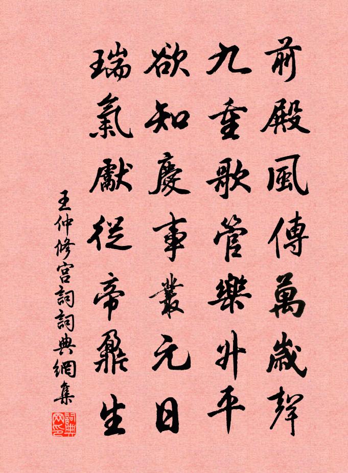 詩詞名句歷史字典書法欣賞書法字典國語詞典說文解字康熙字典古漢語字典標 題 作 者 詩 句 宮詞作者:王仲修 朝代:宋代宮詞原文前殿風傳萬歲聲,九重歌管樂昇平。欲知慶事叢元日,瑞氣先從帝鼐生。詩詞問答問:宮詞的作者是誰?答:王仲修問:宮詞寫於哪個朝代?答:宋代王仲修宮詞書法欣賞宮詞書法作品詩詞推薦謝君寄一犁春雨圖求詩為作絕句陸游〔宋代〕說著功名我自羞,喜君解劍換吳牛。莫將江上一犁雨,輕博人間萬戶侯。沁園春周權〔元代〕說與黃花,九日今朝,同誰舉觴。笑指點行囊,雖然羞澀,*來鬧市,怎忍荒涼。螯壓橙香,酒浮萸紫,醉脫烏紗緣識宋太宗〔宋代〕大丈夫兮兼文武。君子能仁潛喜怒。強明非是盡周旋,滿眼真如不自取。三春花卉正芬芳,發作痴迷我也狂。道德傷心袁枚〔清代〕傷心六十三除夕,都在慈親膝下過。今日慈親成永訣,又逢除夕恨如何?素琴將鼓光陰速,椒酒虛供涕淚多。只覺題竹李群玉〔唐代〕一頃含秋綠,森風十萬竿。氣吹朱夏轉,聲掃碧霄寒。呈印主學万俟紹之〔宋代〕君世能城我石城,不堪兩處總烽塵。向時未快披雲願,今日同為避地人。襟宇光風無盡藏,杯盤夜雨有餘春。喚回對獵宋祁〔宋代〕黃山橫鶩曉成圍,後騎蕭蕭萬弩隨。當路豺狼宜一發,不須回首問狐狸。戰城南陸游〔宋代〕王師出城南,塵頭暗城北。五軍戰馬如錯繡,出入變化不可測。逆胡欺天負中國,虎狼雖猛那勝德。馬前嗢咿爭乞舟至湖心,望豫章西山雲起,風雨驟至楊萬里〔宋代〕橫洲送我忽俱還,四顧無邊已慘顏。雪浪撞天吞几子,拋雲將雨起西山。一聲霹靂從空下,萬丈金蛇掣斗間。舟子守居園池雜題此君庵文同〔宋代〕叢筠裹圜檐,淨影碧如水。誰識愛君心,過橋先到此。王南卿母輓詞范成大〔宋代〕櫛縱稱純孝,笄珈蚤隱憂。病中心已化,身外世如浮。聞道悲風木,誰能駐壑舟?佳兒行古道,足以賁潛幽。陳夫人哀詩劉克莊〔宋代〕龍川天下士,女子節尤奇。孟母遷鄰訓,共姜誓己詩。生無封國分,歿有表阡時。曾識雙珠樹,聊為補些辭。失題(末缺)李頎〔唐代〕紫極殿前朝伏奏,龍華會裡日相望。別離歲歲如流水,誰辨他鄉與故鄉。句鍾元章〔唐代〕金筈離弦三尺電,星髇破的一聲雷。六祖釋安永〔宋代〕黃梅半夜錯分付,才得星兒便亂做。一庾嶺頭屙一堆,後代兒孫遭點污。自宣州赴官入京路逢裴坦判官歸宣州因題贈杜牧〔唐代〕敬亭山下百頃竹,中有詩人小謝城。城高跨樓滿金碧,下聽一溪寒水聲。梅花落徑香繚繞,雪白玉璫花下行。縈風過桂平陳藻〔宋代〕嶺南太平尚鴻荒,城壁空堅草莽長。忽到潯州江上飲,喜他風物近吾鄉。秋雨未已客懷不佳夜誦少陵遣興詩至生涯能幾章甫〔宋代〕逆旅故人少,今秋風雨多。禾頭欲生耳,農夫空悲歌。飢腸望一飽,嗷嗷同雁鵝。臨風不把酒,奈此菊花何。山居十首薛嵎〔宋代〕柴門長日關,不礙溪水流。桃花樹難尋,悵望回輕舟。雖無武陵源,事與昔人侔。已矣勿復言,白首安吾丘。次韻達觀弟送法椿長老入杭陳著〔宋代〕與師交際狎,弟後我居前。久憩上方閣,忽登西浙船。翩然如過鶴,聽不到啼鵑。心契無千里,詩盟終有緣。名句推薦自笑好山如好色,只今懷樹更懷人。閒愁閒恨一番新。辛棄疾《浣溪沙·偕叔高子似宿山寺戲作》 美人贈我錦繡段,何以報之青玉案。張衡《四愁詩》 年年雪裡。常插梅花醉。李清照《清平樂·年年雪裡》 智者畏禍,愚者懼刑;言以誅人,刑之極也。來俊臣《羅織經·刑罰卷第十一》 君子不以冥冥墮行。張廷玉《明史·列傳·卷三十七》 沉舟側畔千帆過,病樹前頭萬木春。劉禹錫《酬樂天揚州初逢席上見贈》 來是空言去絕蹤,月斜樓上五更鐘。李商隱《無題四首》 口言之,身必行之。墨子《墨子·48章 公孟》 若言琴上有琴聲,放在匣中何不鳴?蘇軾《琴詩》 不求見面惟通謁,名紙朝來滿敝廬。文徵明《拜年》