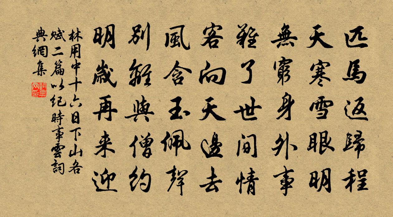 詩詞名句歷史字典書法欣賞書法字典國語詞典說文解字康熙字典古漢語字典標 題 作 者 詩 句 十六日下山各賦二篇以紀時事雲作者:林用中 朝代:宋代原文匹馬返歸程,天寒雪眼明。無窮身外事,難了世間情。客向天邊去,風含玉佩聲。別離與僧約,明歲再來迎。詩詞問答問:《十六日下山各賦二篇以紀時事雲》的作者是誰?答:林用中問:該詩寫於哪個朝代?答:宋代書法欣賞十六日下山各賦二篇以紀時事雲書法作品詩詞推薦江上李鄴嗣〔清代〕亂余野老哭,天地黯然愁。絕爨吹磷火,頹垣湊髑髏。夢依薦黍定,家對旅葵秋。尚有徵租吏,頻從白屋搜。宿甘棠館儲嗣宗〔唐代〕塵跡入門盡,悄然江海心。水聲巫峽遠,山色洞庭深。風桂落寒子,嵐煙凝夕陰。前軒鶴歸處,蘿月思沈沈。書嘆七首戴表元〔宋代〕英英天上星,碌碌澗中石。升沉雖不同,精爽或相激。我有知名文,四海邯鄲壁。遭逢不自閟,頗為談者惜。談者夜坐示友戴表元〔宋代〕夜久燭花落,淒聲生遠林。有懷嫌會淺,無事又秋深。黃葉歸田夢,白頭行路吟。山中亦可樂,不似此同襟。急雨陸游〔宋代〕炎炎赤日當空燒,簿書圍坐如居窯。黑雲壓檐忽迢嶢,急雨鼎來風駕潮。彈壓旱氣蘇枯焦,祝融退聽不敢驕。父老扶風晝屆離京浸遠王勃〔唐代〕帝里金莖去,扶風石柱來。山川殊未已,行路方悠哉。江樓望鄉寄內劉兼〔唐代〕獨上江樓望故鄉,淚襟霜笛共淒涼。雲生隴首秋雖早,月在天心夜已長。魂夢只能隨蛺蝶,煙波無計學鴛鴦。蜀箋唐多令(城歸泊湖山)陳著〔宋代〕倦枕寄漁鄉。篷低被怯霜。月窺人、多少思量。自是欲眠眠不穩,禁聽得、雁聲雙。和夢早催行。歸來梅竹窗。小幽事絕句陸游〔宋代〕新傳服氣訣,舊喜步虛吟。兒女不難棄,雲山何處深?春帖子詞二十首皇帝合六首歐陽修〔宋代〕朝雲藹藹弄春暉,萬木欣欣暖尚微。造化未嘗私一物,各隨妍醜自芳菲。維揚再贈林相士用前韻李曾伯〔宋代〕三數年來已倦遊,只緣心跡不相謀。深知我類虞翻相,莫怪人驚雍齒侯。江國舊懷詩一解,吳鄉新思酒雙投。一番次韻民瞻端禮二首李處權〔宋代〕春雨既過雲未歸,春寒屋下人無衣。林如膏沐勃鳩語,草已怒生胡蝶飛。中原格鬥幾時定,北叟飄零何所歸。我今五仟觀二首古成之〔宋代〕撥破浮塵入紫煙,五羊壇上訪神仟。人間自覺無閒地,城裡誰知有洞天。竹葉影繁籠藥圃,桃花香煖映芝田。吟余點絳唇晁補之〔宋代〕檀口星眸,艷如桃李情柔惠。據我心裡。不肯相拋棄。哭怕人猜,笑又無滋味。忡忡地。系人心裡。一句臨歧誓。次師白弟元日韻黃公度〔宋代〕且看時事愜心期,莫為流年作許悲。足慰羈愁緣雁序,恐無奇策對龍墀。梅妝已覺香全減,柳線相將綠四垂。臘雪聞蛩陸游〔宋代〕稽首周公萬世師,小儒命薄不同時。秋蟲卻是生無憾,名在豳人七月詩。自桐廬如蘭溪有寄權德輿〔唐代〕東南江路舊知名,惆悵春深又獨行。新婦山頭雲半斂,女兒灘上月初明。風前盪颺雙飛蝶,花裡間關百囀鶯。滿目句顏棫〔宋代〕衰草連天慘澹黃。香積廚法文釋印肅〔宋代〕咦,好辨心,以此三法為三昧,無量無邊世不會。我今修供佛眾生,萬聖千賢悉同共。摩訶般若味真如,十波羅蜜迎仙客張可久〔元代〕雲冉冉,草纖纖,誰家隱居山半崦。水煙寒,溪路險。半幅青簾,五里桃花店。名句推薦安而不忘危,存而不忘亡,治而不忘亂佚名《易傳·繫辭傳下·第五章》 舍南舍北皆春水,但見群鷗日日來。杜甫《客至》 懷舊空吟聞笛賦,到鄉翻似爛柯人。劉禹錫《酬樂天揚州初逢席上見贈》 得忍且忍,得耐且耐,不忍不耐,小事成災。佚名《增廣賢文·上集》 錦里開芳宴,蘭缸艷早年。盧照鄰《十五夜觀燈》 昭昭若日月之明,離離如星辰之行劉勰《文心雕龍·宗經》 虛靜無事,以暗見疵。韓非及後人《韓非子·主道》 柳柔搖不定,草短綠應難。張惠言《風流子·出關見桃花》 馬蹀閼氏血,旗裊可汗頭。岳飛《送紫岩張先生北伐》 君子遵道而行,半途而廢:吾弗能已矣。子思《中庸·第十一章》