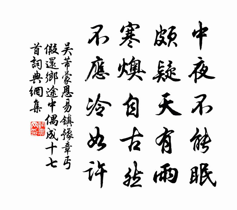 詩詞名句歷史字典書法欣賞書法字典國語詞典說文解字康熙字典古漢語字典標 題 作 者 詩 句 蒙恩易鎮豫章丐假還鄉途中偶成十七首作者:吳芾 朝代:宋代原文中夜不能眠,頗疑天有雨。寒燠自古然,不應冷如許。詩詞問答問:《蒙恩易鎮豫章丐假還鄉途中偶成十七首》的作者是誰?答:吳芾問:該詩寫於哪個朝代?答:宋代書法欣賞蒙恩易鎮豫章丐假還鄉途中偶成十七首書法作品詩詞推薦立春前密雪應祈呈范內翰李新〔宋代〕六出飛霙歲或愆,喜觀瓊礫曉滂然。水官休隸一時慘,木帝已夸群物妍。斗換石田皆沃壤,暗催雲稼入豐年。吾君壽彭簿王邁〔宋代〕武夷深處有台仙,岳降元肖六日前。早挾雄文偕漢史,晚將奇策對堯天。一官祭灶真遊戲,萬里搏風吏勉旃。早晚哭諸故人,因寄元八白居易〔唐代〕昨日哭寢門,今日哭寢門。借問所哭誰?無非故交親。偉卿既長往,質夫亦幽淪。屈指數年世,收涕自思身。彼皆嘉陵江羅鄴〔唐代〕嘉陵南岸雨初收,江似秋嵐不煞流。此地終朝有行客,無人一為棹扁舟。早行李鹹用〔唐代〕家國三千里,中宵算去程。困才成蝶夢,行不待雞鳴。馬首搖殘月,鴉群起古城。發來經幾堠,村寺遠鐘聲。雜詠十首酬汪鎮卿林景熙〔宋代〕漢日落西崦,孤彗明中州。玄德負英猛,欲挽無萬牛。龍鳳一已逝。期人復安求。區區守江左,老此以菟裘。大義題小景扇黃庭堅〔宋代〕草色青青柳色黃,桃花零落杏花香。春風不解吹愁卻,春日偏能惹恨長。山亭錢厚〔宋代〕又踏君山路,來驅陌上塵。江仍舊時面,我是去年人。愛聽松聲古,休催柳色新。片雲銜落日,梅與月爭春。因何常德招游西塔有詩遂和李復〔宋代〕支提壓西城,境絕天香集。招邀乘逸興,步駛追隨急。到門病眼明,曉逐秋雲入。浮屠喜躋攀,萬象在拱揖。古洞有嘆陳造〔宋代〕應事如應敵,收功端有素。詩乃隨景遷,預計幾膠柱。鼓吹月明秋,當時亦佳句。見卵求時夜,竟為陰雲妒。想像春遊有感華岳〔宋代〕上苑春工到海棠,老夫隨分為春忙。朱弦圍枕鶯催拍,紅粉倚欄花斗妝。吾道幾時曾損益,人心今日自炎涼。願言無庵道人贈硯報之以詩徐瑞〔宋代〕別雲驚離宗,重來列劇談。送人還有硯,住世俗無庵。白鶴千年化,黃粱萬枕酣。區中緣未畢,一見一回慚。箜篌引姜夔〔宋代〕箜篌且勿彈,老夫不要聽。河邊風浪起,亦作箜篌聲。古人抱恨死,今人抱恨生。南鄰賣妻者,秋夜難為情。長安示李叔時二首王安石〔宋代〕知子鳴弦意在山,一官聊復戲人間。能為白下東南尉,藜杖緇巾得往還。雲際嶺鄧肅〔宋代〕狂直初無涉世才,雷公斥下九天來。面衝風雪吹三月,馬避干戈易四回。帶雪燒柴平體粟,瀝槽沽酒慰飢雷。如聞伐雙谷蘇轍〔宋代〕芳蘭非不嘉,當門自宜鋤。矧此惡木陰,久妨長者車。僕夫礪尋斧,告 * 方除。久持不忍意,柯條益扶疏。植根所感方回〔宋代〕生涯今爾許,心悔舊為邦。老合營埋穴,貧猶買釀缸。山行憐瘦馬,晝誦喜晴窗。忽欲翩然去,風帆泝九江。退堂頌黃庭堅〔宋代〕愚者日進,智士日退。象蹋恆河徹底過,大千世界百雜碎。愚人尋文弄章句,更覓中間及內外。驀山溪周銖〔宋代〕松陵江上,極目煙波緲。天際接滄溟,到如今、東流未了。吳檣越櫓,都是利名人,空擾擾,知多少,只見朱顏老臨江仙辛棄疾〔宋代〕冷雁寒雲渠有恨,春風自滿余懷。更教無日不花開。未須愁菊盡,相次有梅來。多病近來渾止酒,小槽空壓新醅。名句推薦慎終如始,則無敗事。老子《老子·德經·第六十四章》 夕陽牛背無人臥,帶得寒鴉兩兩歸。張舜民《村居·水繞陂田竹繞籬》 麥浪翻晴風颭柳,已過傷春候。納蘭性德《四和香·麥浪翻晴風颭柳》 元宵佳節,融和天氣,次第豈無風雨。李清照《永遇樂·落日熔金》 江上小堂巢翡翠,花邊高冢臥麒麟。杜甫《曲江二首》 路入南中,桄榔葉暗蓼花紅。歐陽炯《南鄉子·路入南中》 昨夜吳中雪,子猷佳興發。李白《答王十二寒夜獨酌有懷》 老來疾病都是壯時招得;衰時罪孽都是盛時作得。洪應明《菜根譚·概論》 草木行列,煙消日出。蘇轍《黃州快哉亭記》 國之寶器,其在得賢。李大師、李延壽《北史·列傳·卷五十一》
