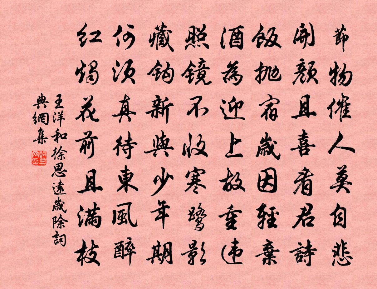 詩詞名句歷史字典書法欣賞書法字典國語詞典說文解字康熙字典古漢語字典標 題 作 者 詩 句 和徐思遠歲除作者:王洋 朝代:宋代和徐思遠歲除原文節物催人莫自悲,開顏且喜看君詩。飯拋宿歲因輕棄,酒為迎上故重違。照鏡不收寒鷺影,藏鉤新與少年期。何須真待東風醉,紅燭花前且滿枝。詩詞問答問:和徐思遠歲除的作者是誰?答:王洋問:和徐思遠歲除寫於哪個朝代?答:宋代王洋和徐思遠歲除書法欣賞和徐思遠歲除書法作品詩詞推薦游洞霄宮王與能〔宋代〕洞霄飛杖屨,人境共真清。天柱擎峰出,丹泉迸霤生。棲岩遺隱跡,漱石洗虛名。珍重樂斯者,微吟謾紀行。葦航劉黻〔宋代〕世路崎嶇即險灘,扁舟隨處著漁芊。主盟鷗鷺交全淡,管領江湖夢跡安。吟定月侵蓬戶靜,釣閒潮打石磯寒。即今寄題喻叔奇國傅郎中園亭二十六詠花嶼楊萬里〔宋代〕桃李無言照水光,玻璃盆底洗新妝。不須水上紅雲句,水上紅雲不解香。春從天上來姬翼〔元代〕枯木寒灰。寄野墅茅堂,冷淡林隈。地偏人靜,月朗風清,窗戶絕點塵埃。有自然訊息,銀霞璨、珠玉瓊瑰。信悠吳江縣作陳著〔宋代〕不行浙右已三年,卻上今秋考試船。文禁何妨鷗鷺狎,廚供旋得蟹魚鮮。遠山浮動太湖浪,密樹冥濛小市煙。及過題荊溪圖張監〔宋代〕斬蛟橋北玉樞府,高樹連雲第一家。欲向新圖問何處,客窗風雨對梨花。鷺鷥障子張喬〔唐代〕剪得機中如雪素,畫為江上帶絲禽。閒來相對茅堂下,引出煙波萬里心。送李厚秘校赴相州戶曹強至〔宋代〕迎婦金貂宅,之官銅雀台。俱新是婚宦,有素獨憐才。簿領時能撥,圖書日可開。無勞嘆州縣,自足脫塵埃。瀑布祖無擇〔宋代〕絕巘千尋勢,飛泉萬疊痕。寒光涵玉岫,靈派析璇源。峭壁河流立,蒼崖井浪翻。猿悲經樹急,龍駭落潭渾。氣爽次單君范袖來汪西皋所譔詠秋十章以示因和之陳著〔宋代〕平生四海有知心,宿草秋風只感今。獨向西皋一回首,未曾平面已蘭金。題峽江譚溫父詠齊楊萬里〔宋代〕漁郎載我下峽水,夜尋故人有譚子。柴門竹屋斷崖底,艮齊手題詠齋字。巴丘花草一番新,玉笥峰頭月半輪。如今送外兄方卿公美赴廣東憲十絕黃公度〔宋代〕石門酌水賦新詩,舊事曾聞吳隱之。習習清風化貪懦,不圖今見古齊夷。和黃先卿即事五首王炎〔宋代〕水落洲爭出,天寒日易昏。倦遊來異縣,小隱住荒村。鶴骨緣詩瘦,雞膚借酒溫。長須煩灑掃,吾欲叩柴門。冬夜聞蟲白居易〔唐代〕蟲聲冬思苦於秋,不解愁人聞亦愁。我是老翁聽不畏,少年莫聽白君頭。春日懷淮陽六首張耒〔宋代〕靈通禪剎古叢林,永日惟聞鍾梵音。閱世興亡千室佛,百年風雨古牆金。送四明汪文子陳傅良〔宋代〕文盛經生少,官輕舉子繁。誰能堪遠役,相與及微言。殘凍留春雨,新愁起夜樽。斯文吾不敢,短句送歸轅。六言章甫〔宋代〕舊書終日懶讀,小斧有時獨攜。取醉旋篘白酒,護生不殺黃雞。綠蓋舞風輕(白蓮賦)周密〔宋代〕玉立照新妝,翠蓋亭亭,凌波步秋綺。真色生香,明璫搖淡月,舞袖斜倚。耿耿芳心,奈千縷、情思縈系。恨開遲賦未見君子憂心靡樂八韻寄李載黃庭堅〔宋代〕齊地谷翔貴,排門無爨饙。二仲有甘旨,奉親亦良勤。原田水洸洸,何時稼如雲。無民願歲豐,正自不忘君。琴齋乃予舊居以琴名齋吾為之也項先生與諸生張繼先〔宋代〕琴齋高致有真風,山合延賓未折中。來問死生非碌碌,為談莊老肯匆匆。喜今可與君還往,惜昨曾留客許同。處士名句推薦鄂王墳上草離離,秋日荒涼石獸危。趙孟頫《岳鄂王墓》 功名萬里外,心事一杯中。高適《送李侍御赴安西》 田夫荷鋤至,相見語依依。王維《渭川田家》 濤瀾洶湧,風雲開闔。蘇轍《黃州快哉亭記》 同是人,類不齊,流俗眾,仁者希。李毓秀《弟子規·親仁》 疑行無名,疑事無功。司馬遷《史記·七十列傳·商君列傳》 二人同心,其利斷金。同心之言,其臭如蘭。佚名《易傳·繫辭傳上·第八章》 花時同醉破春愁,醉折花枝作酒籌。白居易《同李十一醉憶元九》 深知身在情長在,悵望江頭江水聲。李商隱《暮秋獨游曲江》 一溪煙柳萬絲垂,無因系得蘭舟住。周紫芝《踏莎行·情似遊絲》