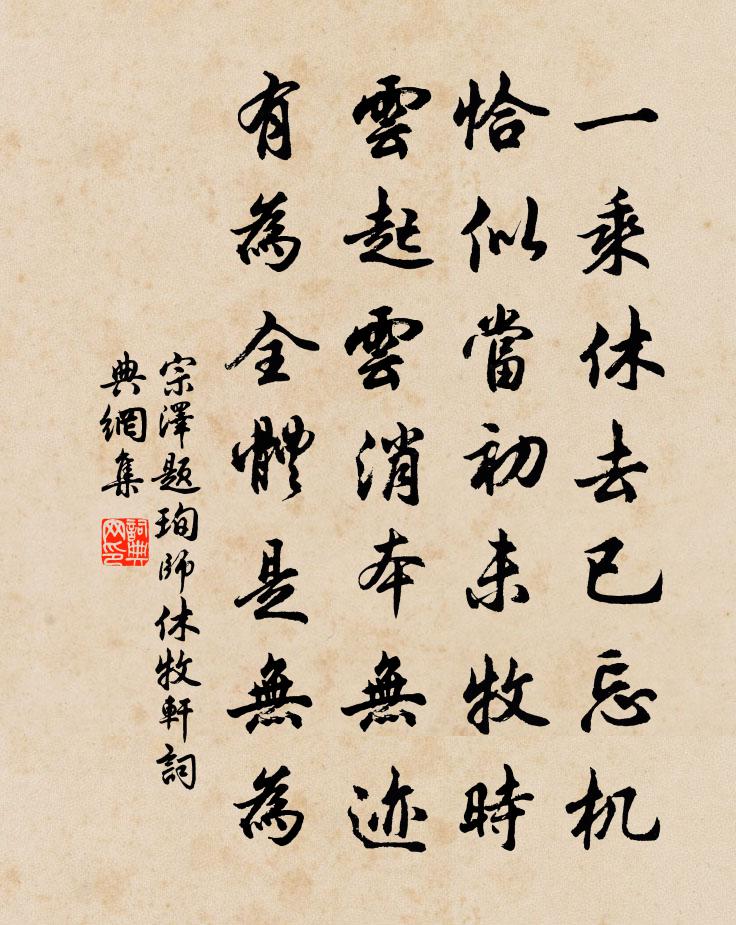 詩詞名句歷史字典書法欣賞書法字典國語詞典說文解字康熙字典古漢語字典標 題 作 者 詩 句 題珣師休牧軒作者:宗澤 朝代:宋代題珣師休牧軒原文一乘休去已忘機,恰似當初未牧時。雲起雲消本無跡。有為全體是無為。詩詞問答問:題珣師休牧軒的作者是誰?答:宗澤問:題珣師休牧軒寫於哪個朝代?答:宋代問:題珣師休牧軒是什麼體裁?答:七絕宗澤題珣師休牧軒書法欣賞題珣師休牧軒書法作品詩詞推薦庚午蛾眉亭張埴〔宋代〕漠漠西淮雲散,滔滔東海潮歸。鷗鳥飛來石壁,柳花撲上人衣。送祖月上人王灼〔宋代〕月公別我浮三峽,欲往南中求 * 。此行初為梅州老,過嶺障煙恐難狎,掛帆勝指古鄱陽,驥子鳳鶵亦稱甲。十年入直劉奉世〔宋代〕玉燭含輝望處遐,禁鍾動後起雌鴉。天高秘省雲偏重,地迥瓊林月半斜。三古文章留大史,百年事業照東華。時揮近作小池頗有野意日晚臨流吟柳渾獨不見慨然晁說之〔宋代〕無波枉陼若堪憑,白露青苹更可陵。過盡秋風獨不見,此時腸斷柳吳興。京兆眉劉方平〔唐代〕新作蛾眉樣,誰將月里同。有來凡幾日,相效滿城中。游西湖五首滕岑〔宋代〕豐樂樓頭沸管弦,拍床喚酒記當年。而今寂寞空欄楯,樓下漣漪自宛然。齊天樂·碧雲闕處無多雨高觀國〔宋代〕碧雲闕處無多雨,愁與去帆俱遠。倒葦沙閒,枯蘭漵冷,寥落寒江秋晚。樓陰縱覽。正魂怯清吟,病多依黯。怕挹正月十七日麗正門觀迎接口號傅若金〔元代〕南徼旌旗萬里回,中天城闕九重開。龍門仗簇青雲起,鶴禁香通紫氣來。父老多流去日淚,公卿不乏濟時材。已聞出城二首張鎡〔宋代〕只道南湖沒樣奇,出關又有許多詩。便須抄取天然句,才下工夫走卻伊。好鳥鳴高枝鄭袞〔唐代〕養翮非無待,遷喬信自卑。影高遲日度,聲遠好風隨。雲拂千尋直,花催百囀奇。驚人時向晚,求友聽應知。委質南歌子(為呂聖俞壽)侯置〔宋代〕菊潤初經雨,橙香獨占秋。碧琳仙釀試新篘。內集熙熙休試、蟻浮甌。家世傳黃閣,功名起黑頭。雙鳧聊傍故人舟天水牛蘇軾〔宋代〕兩角徒自長,空飛不服箱。為牛竟何事,利吻穴枯桑。分韻送盧國華福建提刑得華字樓鑰〔宋代〕盧侯場屋聲,天馬騰渥窪。殘膏沾後人,奇芬吐天葩。來踏九陌塵,去種河陽花。向來再去國,盛山建高牙。平生酬韓弇歸崖見寄武元衡〔唐代〕惆悵人間事,東山遂獨游。露凝瑤草晚,魚戲石潭秋。軒冕應相待,煙霞莫遽留。君看仲連意,功立始滄洲。驃國樂-欲王化之先邇後遠也白居易〔唐代〕驃國樂,驃國樂,出自大海西南角。雍羌之子舒難陀,來獻南音奉正朔。德宗立仗御紫庭,黈纊不塞為爾聽。玉螺題東邨所藏宮錦圖王柏〔宋代〕後德相成帝業昌,不耽歌舞夸新妝。六宮婦式頒蠶事,職雅心耑清晝長。忽見雙娥理絲把,寬急對牽身勢強。輻輪玉堂栽花周正孺有詩次韻蘇軾〔宋代〕故山桃李半荒榛,粗報君恩便乞身。竹簟暑風招我老,玉堂花蕊為誰春。纖纖翠蔓詩催發,皎皎霜葩發斗新。只有常庵題范心遠〔宋代〕路入清溪第二灣,東風猶自逗餘寒。白雲粘地掃不去,黃葉戀枝吹未乾。沙上濕痕誰涉水,天邊長嘯獨憑闌。道人題石水澗陳摶〔宋代〕銀河混落翠光冷,一派迴環湛晚暉。幾恨卻為頑石礙,琉璃滑處玉花飛。宋叔達家聽琵琶蘇軾〔宋代〕數弦已品龍香撥,半面猶遮鳳尾槽。新曲翻從玉連鎖,舊聲終愛郁輪袍。夢回只記歸舟字,賦罷雙垂紫錦絛。何異名句推薦審知四度,可以定天下,可安一國。佚名《黃帝四經·經法·四度》 秋陰不散霜飛晚,留得枯荷聽雨聲。李商隱《宿駱氏亭寄懷崔雍崔袞》 山迴路轉不見君,雪上空留馬行處。岑參《白雪歌送武判官歸京》 小雨纖纖風細細,萬家楊柳青煙里。朱服《漁家傲·小雨纖纖風細細》 強自取柱,柔自取束。荀子《荀子·勸學》 千里稻花應秀色,五更桐葉最佳音。曾幾《蘇秀道中》 畫樓洗淨鴛鴦瓦,彩繩半濕鞦韆架。王元鼎《醉太平·寒食》 教化之行,興於學校。脫脫《金史·列傳·卷三十七》 萬里不惜死,一朝得成功。高適《塞下曲》 死別已吞聲,生別常惻惻。杜甫《夢李白二首·其一》