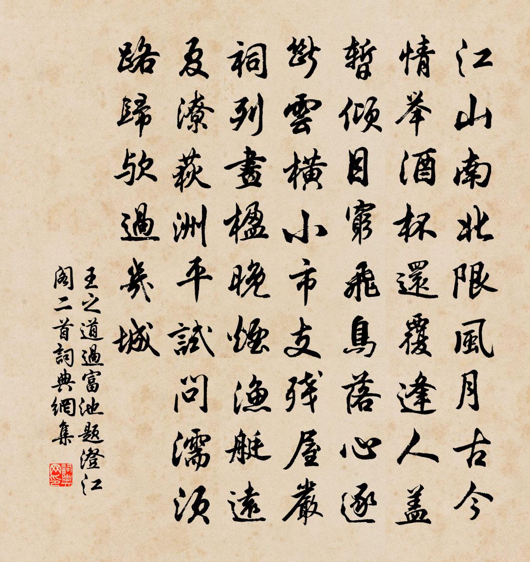 詩詞名句歷史字典書法欣賞書法字典國語詞典說文解字康熙字典古漢語字典標 題 作 者 詩 句 過富池題澄江閣二首作者:王之道 朝代:宋代過富池題澄江閣二首原文江山南北限,風月古今情。舉酒杯還覆,逢人蓋暫傾。目窮飛鳥落,心逐斷雲橫。小市支殘屋,嚴祠列畫楹。晚煙漁艇遠,夏潦荻洲平。試問濡須路,歸歟過幾城。詩詞問答問:過富池題澄江閣二首的作者是誰?答:王之道問:過富池題澄江閣二首寫於哪個朝代?答:宋代王之道過富池題澄江閣二首書法欣賞過富池題澄江閣二首書法作品詩詞推薦西江月(再游龍隱岩,追和陶商翁韻)方信孺〔宋代〕碧洞青崖著雨,紅泉白石生寒。朅來十月九湖山。人笑元郎太漫。絕壑偏宜疊鼓,夕陽休喚歸鞍。茲游未必勝驂鸞西澗即事示盧陟韋應物〔唐代〕寢扉臨碧澗,晨起澹忘情。空林細雨至,圓文遍水生。永日無餘事,山中伐木聲。知子塵喧久,暫可散煩纓。清商怨·庭花香信尚淺晏幾道〔宋代〕庭花香信尚淺。最玉樓先暖。夢覺春衾,江南依舊遠。回紋錦字暗翦。漫寄與、也應歸晚。要問相思,天涯猶自短南浦韓偓〔唐代〕月若半環雲若吐,高樓簾卷當南浦。應是石城艇子來,兩槳咿啞過花塢。正值連宵酒未醒,不宜此際兼微雨。直教羌村三首杜甫〔唐代〕崢嶸赤雲西,日腳下平地。柴門鳥雀噪,歸客千里至。妻孥怪我在,驚定還拭淚。世亂遭飄蕩,生還偶然遂。鄰人途中作王昌齡〔唐代〕遊人愁歲晏,早起遵王畿。墜葉吹未曉,疏林月微微。驚禽棲不定,寒獸相因依。嘆此霜露下,復聞鴻雁飛。渺然畫緋桃題詩賈蓬萊〔宋代〕硃砂顏色瓣重台,曾是劉郎舊看來。只好天台雲里種,莫教移近俗人栽。登禪定寺閣(一作登總持寺閣)宋之問〔唐代〕梵宇出三天,登臨望八川。開襟坐霄漢,揮手拂雲煙。函谷青山外,昆池落日邊。東京楊柳陌,少別已經年。酬王季友題半日村別業兼呈李明府郎士元〔唐代〕村映寒原日已斜,煙生密竹早歸鴉。長溪南路當群岫,游呪土寺西台蒲瀛〔宋代〕偶到城西寺,人言呪土墳。夕陽台半山,秋草徑才分。地下無紅粉,天邊有碧雲。徘徊追往事,風急葉紛紛。過南嶽入洞庭湖杜甫〔唐代〕洪波忽爭道,岸轉異江湖。鄂渚分雲樹,衡山引舳艫。翠牙穿裛槳,碧節上寒蒲。病渴身何去,春生力更無。壤童送靜江曾帥釋善珍〔宋代〕嶺西支郡聯荊湖,時危選帥勞廟謨。公才健如天馬駒,胸中戈甲敵萬夫。向來持節犯賊區,賊降不用丈二殳。浮雲華清池汪元量〔宋代〕一夜春寒事可知,海棠無地避風吹。溫泉自向東流去,不管飛紅出禁池。自廬山回過富池隔江遙禱甘公祠求便風至黃瀝張耒〔宋代〕江邊鬼古祠吳甘鬼公,往來鬼祭禱嚴且恭。我離匡山已經宿,舟挽不進篙工慵。沙邊朝服遙致禱,澆鬼未竟天迴風寄江子之晃沖之〔宋代〕平生江季子,疏嬾近忘吾。不啻三年別,如何一字無。燒丹岣嶁令,釀酒步兵廚。二者將安擇,功名莫浪圖。南鄉子(愛閣賦別二首)葛長庚〔宋代〕夜月照千峰。影滿荷池靜裊風。明日今宵還感慨,梧桐。葉葉隨雲揚碧空。聚散與誰同。野鶴孤雲有底蹤。別處要送上元張尉宋庠〔宋代〕馳譽光英域,糊名限選條。州臨建叢水,路出廣陵潮。歸思刀頭苦,離心旆影搖。行聞有薦牘,南闕郁岧嶢。題廣昌館(在隨州棗陽縣南)韓愈〔唐代〕白水龍飛已幾春,偶逢遺蹟問耕人。丘墳發掘當官路,何處南陽有近親。題蘇州楞伽寺張祜〔唐代〕樓台山半腹,又此一經行。樹隔夫差苑,溪連勾踐城。上坡松徑澀,深坐石池清。況是西峰頂,淒涼故國情。宴張記室宅孟浩然〔唐代〕甲第金張館,門庭軒騎多。家封漢陽郡,文會楚材過。曲島浮觴酌,前山入詠歌。妓堂花映發,書閣柳逶迤。玉指名句推薦父母威嚴而有慈,則子女畏慎而生孝矣。顏之推《顏氏家訓·教子篇》 滿衣血淚與塵埃,亂後還鄉亦可哀。高啟《送陳秀才還沙上省墓》 玉璫緘札何由達,萬里雲羅一雁飛。李商隱《春雨》 回鞭指長安,西日落秦關。李白《登敬亭北二小山余時送客逢崔侍御並登此地》 日出入安窮?時世不與人同。佚名《日出入》 山上層層桃李花,雲間煙火是人家。劉禹錫《竹枝詞九首·其九》 有花有酒春常在,無燭無燈夜自明蒲松齡《聊齋志異·卷一·考城隍》 朽木不可雕也,糞土之牆不可杇也,於予與何誅?孔子弟子《論語·公冶長篇》 翠娥執手送臨歧,軋軋開朱戶柳永《採蓮令·月華收》 客路青山外,行舟綠水前。王灣《次北固山下》