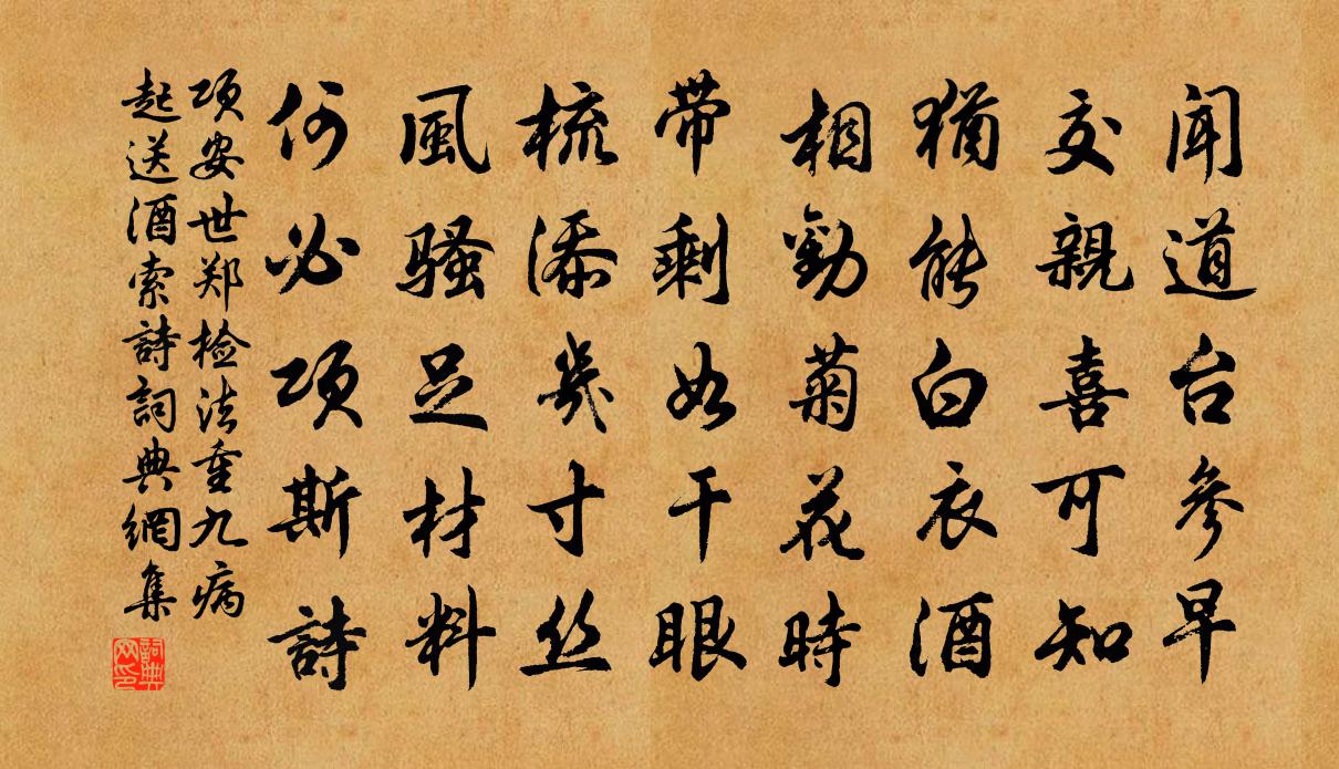 詩詞名句歷史字典書法欣賞書法字典國語詞典說文解字康熙字典古漢語字典標 題 作 者 詩 句 鄭檢法重九病起送酒索詩作者:項安世 朝代:宋代鄭檢法重九病起送酒索詩原文聞道台參早,交親喜可知。猶能白衣酒,相勸菊花時。帶剩如乾眼,梳添幾寸絲。風騷足材料,何必項斯詩。詩詞問答問:鄭檢法重九病起送酒索詩的作者是誰?答:項安世問:鄭檢法重九病起送酒索詩寫於哪個朝代?答:宋代項安世鄭檢法重九病起送酒索詩書法欣賞鄭檢法重九病起送酒索詩書法作品詩詞推薦春曉感別宋祁〔宋代〕樓外疏鍾落曉河,天涯感別思煙波。三年客鯉傳書遠,五丈星機得素多。溝水東流勞想像,峽靈西去隔嵯峨。良辰送梁諫議陸游〔宋代〕湖海還朝白髮生,嬾隨年少事聲名。極知憂國人誰及,細看無心語自平。歸訪鄉人忘位重,乍辭言責覺身輕。籃輿某敬采民言成六韻為安撫閣老尚書壽伏幸過目張栻〔宋代〕清坐鈴齋公事稀,春來風日更遲遲。胸中水鏡渠自避,卻笑缿筒徒徒爾為。和河豚趙希逢〔宋代〕楊花飛處賤魚暇,蕨已抽拳韭迸芽。此日河豚真劍腹,生風谷虎浪磨牙。品題不在八珍數,甘美從今眾口夸。一死徐師川典祀廬山延真觀用送駒父韻餞別四首王銍〔宋代〕徐稚前風在,何勞白首歸。書來寄文錦,詩報守寒機。駑驥難同力,鸞凰任自飛。前村幽獨意,且放酒淋衣。暮春錢瑞琮〔宋代〕園林深處綠成堆,更著松陰一徑苔。煙欲過牆風約轉,水將爭港石沖回。斷雲收雨鳩呼婦,嫩麥盈堤雉應媒。獨有夢得得新詩白居易〔唐代〕池上今宵風月涼,閒教少樂理霓裳。集仙殿里新詞到,便播笙歌作樂章。偈頌六十八首釋法薰〔宋代〕德山雨點棒,臨際雷奔喝。收拾將來,七零八落。靈山咬定牙關,盡力也難提掇,睦州拶折雲門腳。次答邦直、子由五首蘇軾〔宋代〕五斗塵勞尚足留,閉關卻欲治幽憂。羞為毛遂囊中穎,未許朱雲地下游。無事會須成好飲,思歸時欲賦登樓。羨君謝人惠魚兔蟹李若水〔宋代〕昔時藜莧田隴頭,近時虀鹽學舍里。腹不成癭腸有雷,何郎萬錢其敢企。當年守株披褐衣,亦嘗臨淵羨赬尾。餘力水龍吟 廣陵送客,次鄭蘭玉賦蓼花韻張翥〔元代〕芙蓉老去妝殘,露華滴盡珠盤淚。水天瀟灑,秋容冷淡,憑誰點綴。瘦葦黃邊,疏萍白外,滿汀煙*。把余妍分與金房道間皆蠟梅居人取以為薪周務本戲為蠟梅鄭剛中〔宋代〕邊城草木枯,散漫惟蠟梅。花蜂不成蜜,深黃吐春回。如行沙礫中,眼明見瓊瑰。初謂此邦人,推為百世魁。文房去年會慶節初定上壽儀敕差翰林承旨今樞密洪周必大〔宋代〕去歲茲辰侍赤墀,詔黃親許奉瑤卮。如今不及封人賤,猶對君王效祝辭。阮郎歸歐陽修〔宋代〕去年今日落花時。依前又見伊。淡勻雙臉淺勻眉。青衫透玉肌。才會面,便相思。相思無盡期。這回相見好相知。詠史上丙吉陳普〔宋代〕污茵馭吏習邊方,阿保宮人畏霍光。丞相馬前人蹀血,病牛何足累陰陽。對梨花贈皇甫秀才韋莊〔唐代〕林上梨花雪壓枝,獨攀瓊艷不勝悲。依前此地逢君處,還是去年今日時。且戀殘陽留綺席,莫推紅袖訴金卮。騰騰送張忠州使君八兄二首曾協〔宋代〕邂逅江乾不自期,坐傾談屑看霏霏。豈無清禁摛華地,只得名城衣錦歸。惜別定知雙鬢換,問詩常恨寸心違。目窮漢上春雪宋庠〔宋代〕繁霧乘陰結,寒英匝宇飄。風催洛妃舞,春伴郢人謠。逗浦添珠媚,縈叢掩柳嬌。樓空先月白,野闊助天遙。稍傍三峽橋洪咨夔〔宋代〕太行擘破黃河出,贔屓翻身滄海立。老龍抱寶正鼾睡,地底黑風吹霹靂。挹之以北斗之枘,瀹之以明月之璧。啜之乾會聖節賜宴董嗣杲〔宋代〕瑞靄薰風遍赤墀,共歌隨佛下生時。報班立筍嵩呼遠,接宴簪花拜舞遲。聯坐不矜朝士貴,綴員深愧醴曹卑。山中名句推薦名不正,則言不順;言不順,則事不成孔子弟子《論語·子路篇》 竹外桃花三兩枝,春江水暖鴨先知。蘇軾《惠崇春江晚景 / 惠崇春江曉景》 何事非相思,江上葳蕤竹。吳均《登二妃廟》 三千丈清愁鬢髮,五十年春夢繁華。喬吉《折桂令·客窗清明》 生亦我所欲,所欲有甚於生者,故不為苟得也。孟子《孟子·告子章句上·第十節》 相思本是無憑語,莫向花箋費淚行。晏幾道《鷓鴣天·醉拍春衫惜舊香》 風住塵香花已盡,日晚倦梳頭。李清照《武陵春·春晚》 吾嘗跂而望矣,不如登高之博見也。荀子《荀子·勸學》 剛待不思量,吹一片、簫聲過牆。項鴻祚《太常引·客中聞歌》 不可以身相得見如來。鳩摩羅什譯《金剛經·如理實見》
