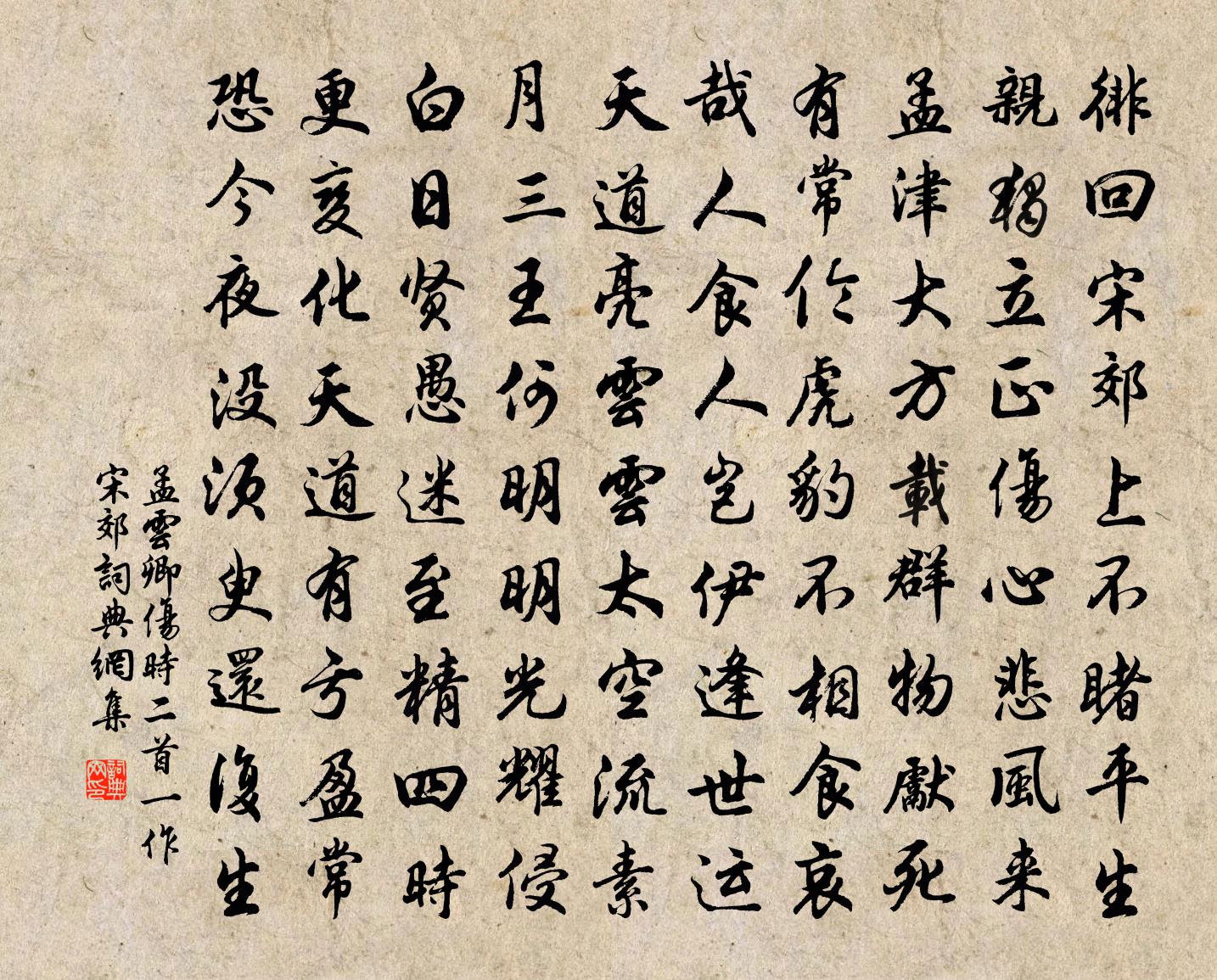 詩詞名句歷史字典書法欣賞書法字典國語詞典說文解字康熙字典古漢語字典標 題 作 者 詩 句 傷時二首(一作宋郊)作者:孟雲卿 朝代:唐代傷時二首(一作宋郊)原文徘回宋郊上,不睹平生親。獨立正傷心,悲風來孟津。大方載群物,先死有常倫。虎豹不相食,哀哉人食人。豈伊逢世運,天道亮云云。太空流素月,三王何明明。光耀侵白日,賢愚迷至精。四時更變化,天道有虧盈。常恐今夜沒,須臾還復生。詩詞問答問:傷時二首(一作宋郊)的作者是誰?答:孟雲卿問:傷時二首(一作宋郊)寫於哪個朝代?答:唐代孟雲卿傷時二首(一作宋郊)書法欣賞傷時二首(一作宋郊)書法作品注釋全唐詩:卷157_10詩詞推薦念奴嬌(次賈子濟韻)郭應祥〔宋代〕瓊苞玉屑,問天公、底事亂拋輕墜。城郭山川都一樣,那得個般清氣。謝女才情,如何只道,柳絮因風起。比梅差和立齋橘花韻王柏〔宋代〕梅花已仙去,草木同蕕薰。萬物競妖冶,二氣勞氤氳。南服有橘隱,春風罔知聞。濃露浥清曉,落月籠夜分。玉圓句張嵲〔宋代〕白水汪汪滿稻畦,樟花零落遍前溪。祭九鼎十二首真宗〔宋代〕法乾剛兮,鑄鼎奠方。涓嘉旦兮,齊明迎祥。胡為持幣,維箱及筥。胡為和羹,有錡維金。和余天開見寄余宏孫〔宋代〕春樹君今吟渭北,林塘我已卜溪西。賞心樂事優遊處,花自飛飛鳥自啼。徒行短歌次前輩韻陸游〔宋代〕風吹短衣雙鬢白,老人徒步歸鄉國。數樹丹楓野店西,一川紅蓼溪橋北。芒鞋有賣百無憂,過盡青山到渡頭。更求依韻和宋中道見寄梅堯臣〔宋代〕歲在涒灘初別子,子適廣平裨郡理。廉頗台傾有遺址,今逢四方弓久弛。時不用兵皆樂鄉,念我貧居天子庠。抱經送王通判葉適〔宋代〕左原冢孫產巴東,山靈地秀兼長雄。自小赤心天與通,可惜五十方治中。北風吹沙暗中渡,不合吹君落南去。水有夜寒行戴表元〔宋代〕昨日天寒不成醉,今日天寒不成寐。醉遲得酒可強歡,寐少愁多亦頻喟。紫竿葦炬鬧荒城,役夫遙作鸛鴨鳴。擁衾雨後登吸江亭釋紹嵩〔宋代〕吸江亭下雨初晴,中有樵夫跣足行。時作微吟清徹骨,茲游無乃太清生。第一百八十五文天祥〔宋代〕蕭條四海內,慷慨有餘悲。路逢相識人,開懷無愧辭。書齋獨坐鄭清之〔宋代〕避事寧違俗,端居悟及身。穎泓供媵御,方冊替親賓。室暗月闌入,庭空花自陳。所安惟適耳,誰復辨秋春。小齋劉克莊〔宋代〕小齋自理畫並琴,匣貯香薰怕蠹侵。出塞已忘傳檄夢,入山猶有著書心。南船不至城無米,北貨難通藥闕參。卻為香山詹中正〔宋代〕浪兀孤舟一葉輕,香山登步覺神清。幾多怪石全勝畫,大半奇花不識名。猿狖盡當吟里見,煙霞祗向眼前生。官身晚霽錢時〔宋代〕斑駁天穿漏,驚奔浪疊空。山留宿雨碧,雲受夕陽紅。蠶麥關時務,鶯花怯老翁。乾坤方寸地,今古一絲風。詠史下蜀先主陳普〔宋代〕北投南走若窮猿,極目蒼梧欲斷魂。如許英雄不成事,止緣的是靖王孫。菩薩蠻韋莊〔唐代〕勸君今夜須沉醉,樽前莫話明朝事。珍重主人心,酒深情亦深。須愁春漏短,莫訴金杯滿。遇酒且呵呵,人生能幾山居雜詩九十首曹勛〔宋代〕人惠九皋禽,應節每對舞。縶彼雲漢心,成我閒靜趣。六翮不忍剪,深徑任翔翥。一舉遨天風,應到逍遙處。次韻馮弋同年蘇轍〔宋代〕細雨濛濛江霧昏,坐曹聊且免泥奔。賣鹽酤酒知同病,一笑何勞賦北門。朱師關畫梅溪春曉圖張鎡〔宋代〕梅溪之水何清哉,萬頃玉碧天邊來。兩山拱挹各異狀,上有磅礴巨石菜落生莓苔。松蘿籠蒙共糾結,帶映萬蕊紛瑤名句推薦捲地風來忽吹散,望湖樓下水如天。蘇軾《六月二十七日望湖樓醉書》 心事孤山春夢在,到思量、猶斷詩魂吳文英《極相思·題陳藏一水月梅扇》 中州遺恨,不知今夜幾人愁。辛棄疾《水調歌頭·和馬叔度游月波樓》 貨無大小,缺者便貴。馮夢龍《醒世恆言·卷三十五》 三春已暮花從風,空留可憐與誰同。蕭衍《東飛伯勞歌》 幾度東風吹世換,千年往事隨潮去。戴復古《滿江紅·赤壁懷古》 臣聞君子樂得其志,小人樂得其事。姜子牙《六韜·文韜·文師》 疾風知勁草,板蕩識誠臣。李世民《賜蕭瑀》 潭潭大度如臥虎,邊頭耕桑長兒女黃庭堅《送范德孺知慶州》 長江一帆遠,落日五湖春。劉長卿《餞別王十一南遊》