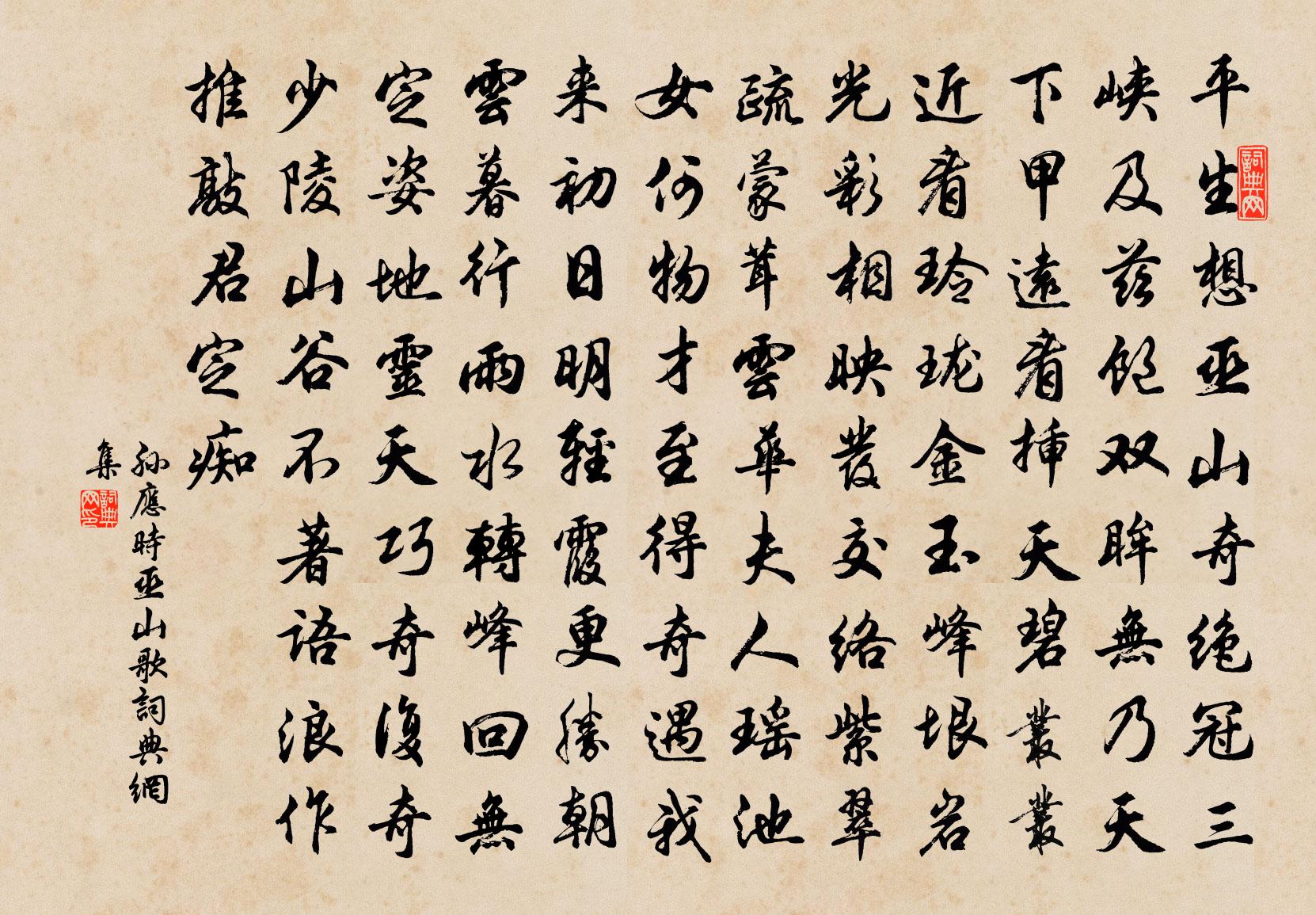 詩詞名句歷史字典書法欣賞書法字典國語詞典說文解字康熙字典古漢語字典標 題 作 者 詩 句 巫山歌作者:孫應時 朝代:宋代巫山歌原文平生想巫山,奇絕冠三峽。及茲飽雙眸,無乃天下甲。遠看插天碧叢叢,近看玲瓏金玉峰。垠岩光彩相映發,交絡紫翠疏蒙茸。雲華夫人瑤池女,何物才至得奇遇。我來初日明輕霞,更勝朝雲暮行雨。水轉峰迴無定姿,地靈天巧奇復奇。少陵山谷不著語,浪作推敲君定痴。詩詞問答問:巫山歌的作者是誰?答:孫應時問:巫山歌寫於哪個朝代?答:宋代孫應時巫山歌書法欣賞巫山歌書法作品詩詞推薦次韻答璧侍者五首陳造〔宋代〕獅子窟中獅子子,孤群懾怯更清孤。當場不作春雷吼,底用吟詩壓老夫。五月五日至京口周文璞〔宋代〕回回望秦淮,出語重煩喋。凱風初酸辛,靈雨更淒切。疇昔之所經,望見心已折。粵從世態換,轉見凡事別。緡錢芸隱提管詩來依韻奉答陳起〔宋代〕君詩如梅花,將盡春意函。一枝漏泄處,踏雪寒曾諳。肯踐桃李場,溪山還自甘。破玉暗香度,似親夷甫談。蝶戀花·別范南伯楊炎正〔宋代〕離恨做成春夜雨。添得春江,劃地東流去。弱柳繫船都不住。為君愁絕聽鳴櫓。君到南徐芳草渡。想得尋春,依舊天人閣端午帖子詞宋庠〔宋代〕越簟輕裁玉,齊紈巧縷冰。宮中雖命節,何處有炎蒸。奉和元丞侍從游南城別業李端〔唐代〕垂朱領孫子,從宴在池塘。獻壽回龜顧,和羹躍鯉香。高松先草晚,平石助泉涼。餘橘期相及,門生有陸郎。題馬當山魚望亭四首右陸魯望黃庭堅〔宋代〕笠澤道人高古,文章白髮蕭條。欲問勒銘遺墨,應書水府鮫綃。偈頌七十二首釋祖欽〔宋代〕道個爐中無火時,一團冷焰正騰輝。深深撥出一星子,未免翻成節外枝。牛渚王安石〔宋代〕歷陽之南有牛渚,一風微吹萬舟阻。華戎蠻蜀古百川,合為大江神所躔。山盤水怒不得泄,到此乃有無窮淵。朱衣游東禪院郭某〔宋代〕地去關城遠,無人□□□。泉流溪路窄,石顯洞門深。□□□□□,□□竹樹陰。□□□□□,□日解題襟。偈頌一百三十六首釋惟一〔宋代〕經誦三千部,曹溪一句忘。塵塵皆寶所,處處是家鄉。雲淨天如洗,潭清月愈光。須知遠煙浪,別有好商量。梅花十絕答石塘二林劉克莊〔宋代〕有香影處即追攀,豈必西湖水月間。若問何人傳此訣,後村翁授小孤山。洪長老惠藤杖姚勉〔宋代〕高僧挑月一枝藤,惠我登山腳便輕。澒洞風塵豺虎惡,從今險路穩支撐。金剛隨機無盡頌無得無說分第七釋印肅〔宋代〕菩提無定法,一體常周匝。個裹了無言,圓成無縫塔。逍遙詠宋太宗〔宋代〕誰知學道本來真,鉛汞噗媒最好親。非是虛傳經歲月,自緣無識探龍津。初凝白雲堪可貴,解點黃金妙入神。術數書事李流謙〔宋代〕唯有江郊發,能消畏日長。晚杯荷露重,竿枕竹風涼。溪鷺閒無敵,庭萱恨易忘。翩翩孤蝶意,只是托幽香。貧居自警三首劉克莊〔宋代〕赤粟黃虀味最深,此生不恨老雲林。鬼神每瞰高明室,天地皆知暮夜金。夸士燃臍猶殉貨,先賢覆首或無衾。一瓢次花翁冬日三詩杜范〔宋代〕悠然僧舍一柴扉,淡泊如君眼底稀。山澤肯為仙骨瘦,襟懷自得遁身肥。有詩盈帙遮空橐,無酒留賓辦典衣。一棹題王朝英歇驢圖章甫〔宋代〕天寒山路長,年荒蹇驢瘦。風松適相遭,金石方互奏。是中有佳趣,舍鞍聊杖藜。童奴難與言,得句忘吾飢。懷遠布袋贊釋師範〔宋代〕露胸坦腹,皺眉搭嘴。做個模樣,是何儀軌。謂渠惺未必惺,請渠睡未必睡,吽吽奉化子,我儂識得你。名句推薦俯視洛陽川,茫茫走胡兵。李白《古風·其十九》 不務天時,則財不生;不務地利,則倉廩不盈管仲《管子·牧民》 大家漸及消亡,難期其復振,勢成於因循也。王永彬《圍爐夜話·第三七則》 相攜及田家,童稚開荊扉。李白《下終南山過斛斯山人宿置酒》 蕭條亭障遠,悽慘風塵多庾信《擬詠懷二十七首·其二十六》 胡風吹代馬,北擁魯陽關。李白《豫章行》 吞舟之魚,陸處則不勝螻蟻呂不韋《呂氏春秋·覽·審分覽》 明月出天山,蒼茫雲海間。李白《關山月》 蜂須輕惹百花心,蕙風蘭思寄清琴。薛昭蘊《浣溪沙·握手河橋柳似金》 胡馬嘶風,漢旗翻雪,彤雲又吐,一竿殘照。時彥《青門飲·寄寵人》