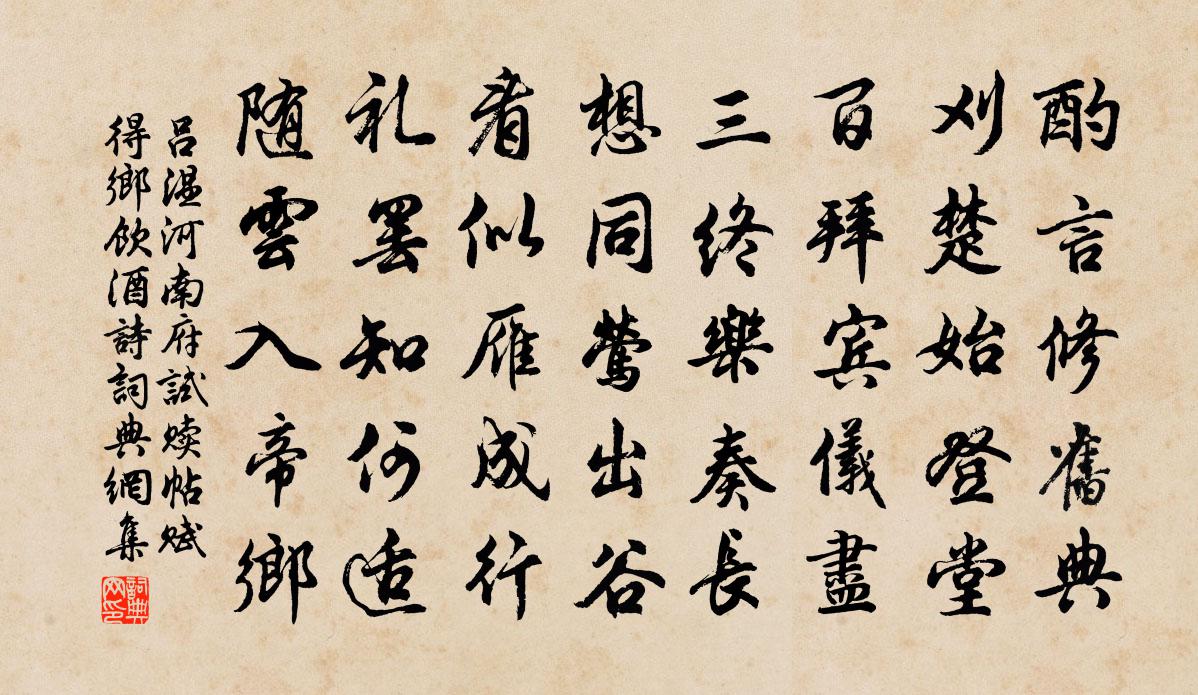詩詞名句歷史字典書法欣賞書法字典國語詞典說文解字康熙字典古漢語字典標 題 作 者 詩 句 河南府試贖帖,賦得鄉飲酒詩作者:呂溫 朝代:唐代原文酌言修舊典,刈楚始登堂。百拜賓儀盡,三終樂奏長。想同鶯出谷,看似雁成行。禮罷知何適,隨雲入帝鄉。詩詞問答問:《河南府試贖帖,賦得鄉飲酒詩》的作者是誰?答:呂溫問:該詩寫於哪個朝代?答:唐代書法欣賞河南府試贖帖,賦得鄉飲酒詩書法作品注釋全唐詩:卷371-38詩詞推薦答沈器之二首姜夔〔宋代〕涉遠身良苦,登高望欲迷。試吟青玉案,不似白銅鞮。露下秋蟲怨,風高北馬嘶。槎頭有新味,人在太湖西。王總領生日魏了翁〔宋代〕皇天覆后土,藐然中為人。職職萬同宇,何所非吾仁。一二指搐耳,動且關嚬呻。置之非害事,尚欲求其信。矧今芳儀怨晁補之〔宋代〕金陵宮殿春霏微,江南花發鷓鴣飛。風流國主家千口,十五 * 粉黛稀。滿堂侍酒皆詞客,拭汗爭看平叔白。後庭曉出郊過方秀才舍飲韓維〔宋代〕浮雲散朝陰,初日動晴煦。行隨風葉遠,去傍田家路。人間無遽色,馬緩有安步。遙識主人舍,青簾出霜樹。老學庵北窗雜書陸游〔宋代〕偶住人間遂許時,殘骸自笑尚支持。直須消破黃齏盡,始是浮生結局時。步蟾宮汪存〔宋代〕玉京此去春猶淺。正雪絮、馬頭零亂。姮娥剪就綠雲裳,待來步蟾宮與換。明年二月桃花岸。棹雙漿、浪平煙暖。首尾吟邵雍〔宋代〕堯夫非是愛吟詩,詩是堯夫春盡時。有意落花猶去住,無情流水任東西。鶯傳信處音聲切,燕訴冤時言語低。似此贈許季升五首趙蕃〔宋代〕清江人物推陳謝,不減當年孔與劉。肯為賦詩仍作序,要明吾子乃儒流。奉和濟川代書三十韻寄諸同舍司馬光〔宋代〕金馬延群俊,芸午聚眾書。杳疑神境絕,深與世塵疏。氣逼煙霄爽,光分日月余。不材叨誤選,故友幸聊居。雲蓋次韻謝夏自然見寄四首方回〔宋代〕士氣兼文脈,湮微復幾年。淺膚專徇俗,高亢類談禪。春動霆聲起,雲開月體全。古人方冊在,達者以心傳。送洛陽崔員外周繇〔唐代〕塞詔除嵩洛,觀圖見廢興。城遷周古鼎,地列漢諸陵。日送歸朝客,時招住岳僧。郡齋台閣滿,公退即吟登。鵲踏枝·叵耐靈鵲多謾語佚名〔五代〕叵耐靈鵲多謾語,送喜何曾有憑據?幾度飛來活捉取,鎖上金籠休共語。比擬好心來送喜,誰知鎖我在金籠里。欲夏日雨講郊行次韻劉春卿王之道〔宋代〕皇天久不雨,既雨晴亦好。食已得從容,偕行石城道。桑麻光似潑,山林淨如澡。蒼苔長綠髮,嫩竹搖翠葆。離離瀑布錢聞詩〔宋代〕河漢遙分一派輕,望中渺渺白蛇形。誰教來自半天上,穿破千尋碧玉屏。辭眾釋宗本〔宋代〕本是無家客,那堪任便游。順風加櫓棹,船子下揚州。賦得殘菊李世民〔唐代〕階蘭凝曙霜,岸菊照晨光。露濃晞晚笑,風勁淺殘香。細葉凋輕翠,圓花飛碎黃。還持今歲色,復結後年芳。慶春澤(丙申鄉人醵賞鳳花)陳著〔宋代〕翔鳳闌乾,啼鵑院宇,相逢似夢才醒。誰道無情,飛紅舞翠歡迎。青春綠髮花前飲,醉自歌、記那時曾。到如今,蝶戀花歐陽修〔宋代〕欲過清明煙雨細。小檻臨窗,點點殘花墜。梁燕語多驚曉睡。銀屏一半堆香被。新歲風光如舊歲。所恨征輪,漸漸雪中廖宣城寄酒梅堯臣〔宋代〕輕舟泛泛昭亭灣,春雪漫漫昭亭山。寒沙曲渚杳不辨,素鷗翔鷺空中還。宣城太守閔窮旅,雙壺貯醞兵吏頒。任從再賦劉筠〔宋代〕暮雨過湘渚,微涼滿楚宮。濺裙無限水,障袂幾多風。浪跡嫌萍實。塵勞笑菊叢。氣清防麝損,信密待魚通。游女名句推薦日日花前常病酒,敢辭鏡里朱顏瘦。馮延巳《鵲踏枝·誰道閒情拋擲久》 想得玉人情,也合思量我。孫光憲《生查子·窗雨阻佳期》 今夕何夕,見此良人?佚名《綢繆》 岳王祠畔,楊柳煙鎖古今愁。戴復古《水調歌頭·題李季允侍郎鄂州吞雲樓》 秋來愁更深,黛拂雙蛾淺楊無咎《生查子·秋來愁更深》 柳垂江上影,梅謝雪中枝。晏幾道《臨江仙·身外閒愁空滿》 盈盈一水間,脈脈不得語。佚名《迢迢牽牛星》 吏不治則亂,農事緩則貧。墨子《墨子·39章 非儒(下)》 重到故鄉交舊少,淒涼。卻恐它鄉勝故鄉。陸游《南鄉子·歸夢寄吳檣》 江上月明胡雁過,淮南木落楚山多。劉長卿《江州重別薛六柳八二員外》
