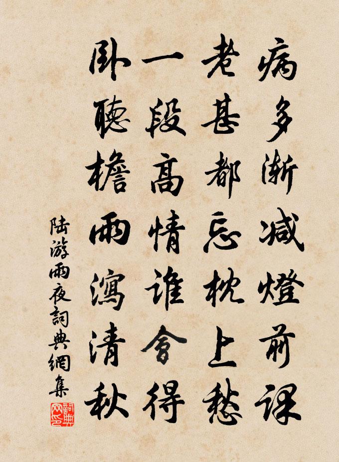 詩詞名句歷史字典書法欣賞書法字典國語詞典說文解字康熙字典古漢語字典標 題 作 者 詩 句 雨夜作者:陸游 朝代:宋代雨夜原文病多漸減燈前課,老甚都忘枕上愁。一段高情誰會得,臥聽檐雨瀉清秋。詩詞問答問:雨夜的作者是誰?答:陸游問:雨夜寫於哪個朝代?答:宋代問:陸游的名句有哪些?答:陸游名句大全陸游雨夜書法欣賞雨夜書法作品詩詞推薦簡彥沖兄弟李處權〔宋代〕過午時雲簇,豪春暝雨篵。石苔先受色,桃葉復含滋。客舍居難穩,家書到每遲。二公俱強飯,宗社要扶持。登高丘而望遠李白〔唐代〕登高丘而望遠海,六鰲骨已霜,三山流安在?扶桑半摧折,白日沉光彩。銀台金闕如夢中,秦皇漢武空相待。精衛贈丘先生賈島〔唐代〕常言吃藥全勝飯,華岳松邊采茯神。不遣髭鬚一莖白,擬為白日上升人。一斛珠晁端禮〔宋代〕相思最苦。別來有甚好情緒。夜間無限悽惶處。睡不著時,沒個人言語。所恨不能飛上路。書書直怪遲歸去。外邊泰山樑甫行曹植〔魏晉〕八方各異氣。千里殊風雨。劇哉邊海民。寄身於草墅。妻子象禽獸。行止依林阻。柴門何蕭條。狐兔翔我宇。十二月八日步至西村陸游〔宋代〕臘月風和意已春,時因散策過吾鄰。草煙漠漠柴門裡,牛跡重重野水濱。多病所須唯藥物,差科未動是閒人。今朝瑩禪師房觀山海圖李白〔唐代〕真僧閉精宇,滅跡含達觀。列嶂圖雲山,攢峰入霄漢。丹崖森在目,清晝疑卷幔。蓬壺來軒窗,瀛海入几案。煙濤觀秋潮徐集孫〔宋代〕八月西風噓沆瀣,長江協候肆澎湃。錢塘王氣天所鍾,非為子胥逞靈怪。海門三山縹緲青,雙練夾岸奔雷霆。蛟龍朝中措(三用韻)吳潛〔宋代〕楊花撩亂與雲乾,春事可悲酸。況是雨荒院落,江南但有春寒。鶯殘燕懶,蜂慵蝶褪,謾等閒看。不是無情描貌,九月十四日小會孔武仲〔宋代〕帶露葵花貯漆盤,周遭仍簇小雞冠。人生愛賞無時足,但作姚黃魏紫看。古陽關/陽關引晁補之〔宋代〕暮草書蛩吟噎。書暗柳螢飛書滅。空庭書雨過,西風緊,飄黃葉。卷書帷寂靜,對此傷離別。重感嘆、中秋數日又裴侍御見贈斑竹杖李嘉祐〔唐代〕騷人夸竹杖,贈我意何深。萬點湘妃淚,三年賈誼心。願持終白首,誰道貴黃金。他日歸愚谷,偏宜綠綺琴。山中聽子規(一作顧況詩)朱放〔唐代〕幽人自愛山中宿,又近葛洪丹井西。窗中有個長松樹,半夜子規來上啼。黃葉袁燮〔宋代〕黃葉紛紛舞勁風,反膏收液歲成功。明年滿眼春容好,卻在今時縈寞中。築長堤田晝〔宋代〕築長堤,白頭荷杵隨者妻。背肋供銷僂筋力微,以手置胸路旁啼。老夫七十嫗與齊,五尺就門生兩兒。夜來春雨深粹老使君前被召約往它山謁善政侯祠既不果以舒坦〔宋代〕長江滾滾西南流,秋水時至狂不收。大浪似屋山欲浮,王侯神智禹所啾。萬鬼琢石它山幽,梅梁贔屓臥龍虬。咄嗟去年一首蘇籀〔宋代〕去年胡來清水岩,黃河狹隘冬凌頑。戾如飄風速如鬼,犬豕 * 豺狼貪。探馬星奔汗流地,猛士眥裂發指冠。潼雍廖子晦以通書及龜山道鄉晦庵帖見惠曹彥約〔宋代〕文公垂憲墨淋浪,鼎立龜山更道鄉。家有一焉猶冠絕,寶茲三者見珍藏。來從疊嶂層巒里。置在光風霽月傍。收拾自潯陽泛舟經明海①孟浩然〔唐代〕大江分九派,淼漫成水鄉。②舟子乘利涉,往來至潯陽。③因之泛五湖,流浪經三湘。④觀濤壯枚發,吊屈痛沉湘奉和九月九日登慈恩寺浮圖應制李恆〔唐代〕寶地鄰丹掖,香台瞰碧雲。河山天外出,城闕樹中分。睿藻蘭英秀,仙杯菊蕊薰。願將今日樂,長奉聖明君。名句推薦小娃撐小艇,偷采白蓮回。白居易《池上》 休說鱸魚堪膾,盡西風,季鷹歸未?辛棄疾《水龍吟·登建康賞心亭》 故父母、學、君三者,莫可以為治法。墨子《墨子·04章 法儀》 昨夜笙歌容易散,酒醒添得愁無限馮延巳《鵲踏枝·梅落繁枝千萬片》 賈傅松醪酒,秋來美更香。杜牧《送薛種游湖南》 老吾老,以及人之老;幼吾幼,以及人之幼。孟子《孟子·梁惠王章句上·第八節》 柳花驚雪浦,麥雨漲溪田。李賀《南園十三首》 多情自古傷離別,更那堪冷落清秋節!柳永《雨霖鈴·寒蟬淒切》 殘燈孤枕夢,輕浪五更風。徐昌圖《臨江仙·飲散離亭西去》 後庭花一曲,幽怨不堪聽。劉禹錫《金陵懷古》