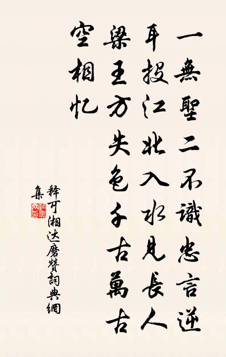詩詞名句歷史字典書法欣賞書法字典國語詞典說文解字康熙字典古漢語字典標 題 作 者 詩 句 達磨贊作者:釋可湘 朝代:宋代達磨贊原文一無聖,二不識,忠言逆耳投江北。入水見長人,梁王方失色。千古萬古空相憶。詩詞問答問:達磨贊的作者是誰?答:釋可湘問:達磨贊寫於哪個朝代?答:宋代釋可湘達磨贊書法欣賞達磨贊書法作品詩詞推薦題高氏煙雨館趙孟堅〔宋代〕人多晴晝至,此趣未應知。我獨身常寓,煙霏雨暗時。噎添波面闊,綠壓柳絲垂。忽有片帆過,驚飛雙鷺鷥。寶應寺曾季貍〔宋代〕檀心素麵水沉香,一架清陰滿院涼。莫道春歸無覓處,春歸卻在贊公房。曉意林景熙〔宋代〕僧鍾覺曙鳥,紛飛弄林光。宿雲漸離石,我起開秋房。南山忽入幾,相對各老蒼。我老幾何年,山曾見鴻荒。流泉垂虹別意圖唐寅〔明代〕垂虹不是壩陵橋,送客能來路亦遙。西望太湖山閣月,東連淪海地通潮。酒波汨汨翻荷葉,別思茫茫在柳條。更欲家居陸游〔宋代〕清世念遺民,常情重老人。饋漿煩郡府,分胙媿鄉鄰。獲稻黃雲卷,舂粳玉粒新。膨脝自摩腹,一笑欲忘貧。依韻和孫之翰對雪范仲淹〔宋代〕江乾往往臘不雪,今喜紛紛才孟冬。乃知王澤寢及遠,益明天意先在農。有年預可慰四海,大瑞且當聞九重。況此述懷商山客死〔唐代〕家住驛北路,百里無四鄰。往來不相問,寂寂山家春。南岡夜蕭蕭,青松與白楊。家人應有夢,遠客已無腸。白草和陳州田舍人留別王禹偁〔宋代〕淮陽冰綻柳條新,風物暄妍土俗淳。捧詔暫辭雙闕路,勸農深入四郊春。茶煙靜拂聽琴鶴,穀雨輕籠鋤麥人。羸得萱草張良臣〔宋代〕雪色侵凌綠剪芽,枝抽寒玉帶金葩。北堂回首傷心處,卻復令人恨此花。峽山詩李昴英〔宋代〕山通一水逕皇者,多少英豪出此途。傳我飛來元羽翼,好風吹送過天衢。寄楊公閒修撰郭知運〔宋代〕秀翮翩翩五采鸞,乘雲飛傍玉闌乾。天開金馬文章署,詔選銀魚侍從官。念我羈棲三澨水,憐君出入五雲端。從容喜夏雨齊己〔唐代〕四郊雲影合,千里雨聲來。盡洗紅埃去,並將清氣回。潺湲浮楚甸,蕭散露荊台。欲賦隨車瑞,濡毫渴謏才。岳陽樓晚望崔珏〔唐代〕乾坤千里水雲間,釣艇如萍去復還。樓上北風斜卷席,湖中西日倒銜山。懷沙有恨騷人往,鼓瑟無聲帝子閒。何事潁橋路中別曼叔韓維〔宋代〕磷磷清潁流,中截兩崖斷。架橋在城底,斗出曠平漫。陰風無邊來,左右篷驚轉。我得感時節,跋馬重為戀。雖非隔浦蓮(詠白蓮)曾覿〔宋代〕涼秋湖上過雨。作意回商素。暗綠翻輕蓋,蕭然姑射儔侶。妝臉宜淡佇。紅衣妒。步襪凌波去。異香度。天教占斷古交行鄭俠〔宋代〕大海有時竭,此心瀝不乾。厚地有時坼,此心無裂文。持此以相照,百練青銅昏。用此心相惠,貝璧黃金盤。覿面聞錢道士與越守穆父飲酒,送二壺蘇軾〔宋代〕龍根為脯玉為漿,下界寒醅亦漫嘗。一紙鵝經逸少醉,他年鵬賦謫仙狂。金丹自足留衰鬢,苦淚何須點別腸。吳越庭橘孟浩然〔唐代〕明發覽群物,萬木何陰森。凝霜漸漸水,庭橘似懸金。女伴爭攀摘,摘窺礙葉深。並生憐共蒂,相示感同心。骨刺小春天邵雍〔宋代〕八月小春天,如人強少年。偷生誠有謂,卻老固無緣。既有神仙術,能回草木妍。安知太平日,不得似堯夫。十二時/憶少年佚名〔宋代〕千年運,五葉昇平。法扆坐中盈。天高日潤,雷動風行。三萬里聲明。靈台偃伯仆邊兵。事農耕。一氣重滋萌。萬名句推薦嗟險阻,嘆飄零。關山萬里作雄行。劉克莊《玉樓春·戲林推》 心無備慮,不可以應卒。墨子《墨子·05章 七患》 朱門酒肉臭,路有凍死骨。杜甫《自京赴奉先縣詠懷五百字 / 自京赴奉先詠懷五百字》 笑指吾廬何處是?一池荷葉小橋橫。陳繼儒《浣溪沙·初夏夜飲歸》 欲寄書如天遠,難銷夜似年長。賀鑄《西江月·攜手看花深徑》 此路無知己,明珠莫暗投。高適《送魏八》 風雨滿城,何幸兩重陽之近;文天祥《回董提舉中秋請宴啟》 近來攀折苦,應為別離多王之渙《送別》 君在天一涯,妾身長別離。江淹《古離別》 煙蘿翠竹,欠羅袖、為倚天寒日暮。吳文英《絳都春·余往來清華池館六年賦詠屢矣感昔傷今益不堪懷乃復作此解》