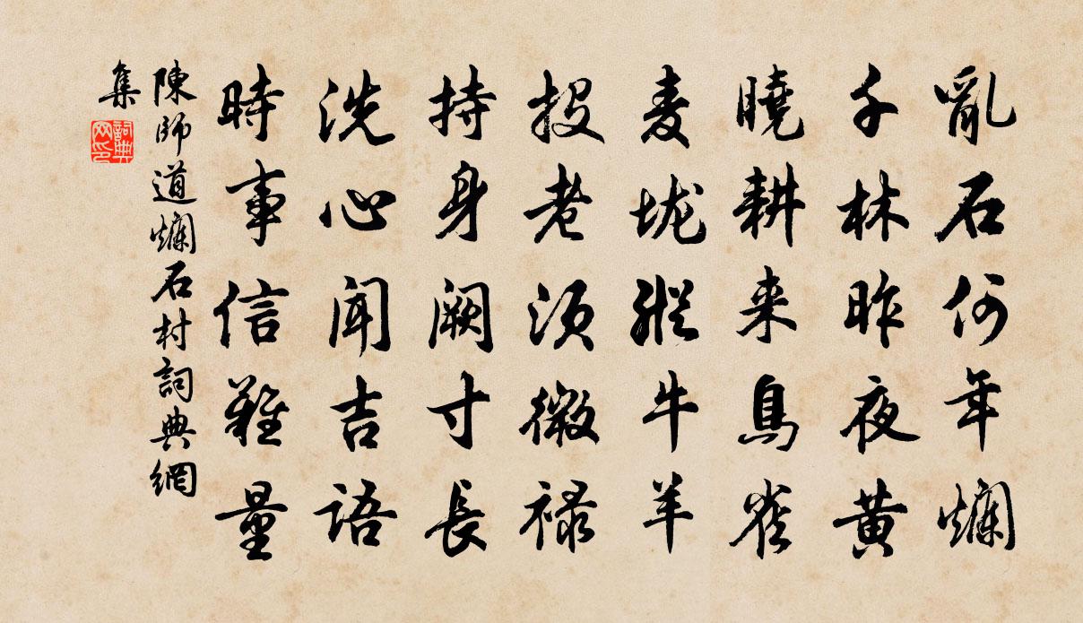 詩詞名句歷史字典書法欣賞書法字典國語詞典說文解字康熙字典古漢語字典標 題 作 者 詩 句 爛石村作者:陳師道 朝代:宋代爛石村原文亂石何年爛,千林昨夜黃。曉耕來鳥雀,麥壠縱牛羊。投老須微祿,持身闕寸長。洗心聞吉語,時事信難量。詩詞問答問:爛石村的作者是誰?答:陳師道問:爛石村寫於哪個朝代?答:宋代問:陳師道的名句有哪些?答:陳師道名句大全陳師道爛石村書法欣賞爛石村書法作品詩詞推薦和胡秉彝敷文岩桂四首蔡戡〔宋代〕秋入東山景物奇,花開亦遣野人知。二難佳句真連璧,顧我深慚嫫與施。偈頌六十首釋曇華〔宋代〕心佛及眾生,笑而還復喜。笑喜本無根,緇素誠有旨。千古萬古人,幾個識道理。道理深,何處尋。海枯終見底,懷舊二首劉克莊〔宋代〕陌上傳宣學士聲,旋施席帽拂華纓。催謄制草依時進,多點宮蓮徹夜明。五相一翁真薄命,三君八俊總虛名。世間涵虛亭文同〔宋代〕雲外眾峰檐際橫,竹間飛泉窗下鳴。欲往二樂即歇此,胸懷已自如冰清。贈畫士龔子陳造〔宋代〕古人論畫索畫外,世俗區區較形似。眼明亦有可人者,龔子畫形兼畫意。秋蘭春蕙相與芳,梅花照景勝暗香。倚煙題趙希遠案鷹圖范成大〔宋代〕學射春山萬歲湖,牙門列騎卷平蕪。如今黃土原邊夢,猶識呼鷹嗾犬圖。壽嫩庵趙先生十首陳元晉〔宋代〕楚望環宗岳,湘源遠派浯。山種鍾氣異,宇宙要賢扶。晚遍朱軒轍,春饒綠野腴。遙知初度日,歌舞沸重湖。漁父岑參〔唐代〕扁舟滄浪叟,心與滄浪清。不自道鄉里,無人知姓名。朝從灘上飯,暮向蘆中宿。歌竟還復歌,手持一竿竹。竿頭本善上人釋祖欽〔宋代〕本來面日,善自參詳。六般神用,晝夜放光。不須擬議,切忌承當。風前一陣木犀香,金粟花黃。覽陸龜蒙舊集殷文圭〔唐代〕先生文價沸三吳,白雪千編酒一壺。吟去星辰筆下動,醉來嵩華眼中無。峭如謝檜虬蟠活,清似緱山鳳路孤。身後頌古十九首釋慧暉〔宋代〕不打飛鳶便到來,大圓鏡里絕塵埃。東君節令分明也,桃李年年二月開。減字木蘭花 庚申六月三日,同耶律君璋、趙陸文圭〔元代〕璋不飲,命歌者歌以勸之雙鬟聳翠。低護金蓮裙*地。鐵石心腸。無奈梅花一點香。歌聲梁繞。流水泠泠雲杳杳。生查子洪适〔宋代〕三月到盤洲,九曲清波聚。修竹蔭流觴,秀葉題佳句。紅紫漸闌珊,戀戀鶯花主。芍藥擁芳蹊,未放春歸去。黃鶴樓崔顥〔唐代〕昔人已乘白雲去,此地空餘黃鶴樓。黃鶴一去不復返,白雲千載空悠悠。晴川歷歷漢陽樹,芳草萋萋鸚鵡洲。日暮與諸公同出城觀稼白居易〔唐代〕老尹醉醺醺,來隨年少群。不憂頭似雪,但喜稼如雲。歲望千箱積,秋憐五穀分。何人知帝力,堯舜正為君。後天易吟三十首方回〔宋代〕位須分對待,氣即驗流行。羲體兼文用,俱由造化生。賦椿楸二樹鄧深〔宋代〕愛均召伯棠,名殊諸葛菜。軒檻頓輝光,東西相映帶。此意存千年,其勢當兩大。梨棗況久生,於焉稱內外。鷓鴣天吳則禮〔宋代〕作賦丁年厭兔園。紫微深鎖九重關。花墩屢賜清閒燕,文石難忘咫尺顏。煙外屐,水邊山。綸巾羽扇五湖間。自憐燕鄭谷〔唐代〕年去年來來去忙,春寒煙暝渡瀟湘。低飛綠岸和梅雨,亂入紅樓揀杏梁。閒幾硯中窺水淺,落花徑里得泥香。千言和潘接伴韻虞儔〔宋代〕久矣聞名忻識面,喔詩一字果何難。筆端風月窺天巧,句里冰霜飽歲寒。自昔登壇須老將,只今握節愧粗官。相逢名句推薦嚴妝欲罷囀黃鸝,飛上萬年枝。和凝《喜遷鶯·曉月墜》 鈍學累功,不妨精熟顏之推《顏氏家訓·文章篇》 當時相候赤欄橋,今日獨尋黃葉路。周邦彥《玉樓春·桃溪不作從容住》 鴻雁向西北,因書報天涯。李白《千里思》 地下千年骨,誰為輔佐臣。戎昱《詠史 / 和蕃》 坐到三更盡,歸仍萬里賒。戎昱《桂州臘夜》 便覺眼前生意滿,東風吹水綠參差。張栻《立春偶成》 征人去日殷勤囑,歸雁來時數附書。王維《伊州歌》 林花謝了春紅,太匆匆。無奈朝來寒雨晚來風。李煜《相見歡·林花謝了春紅》 行到水窮處,坐看雲起時。王維《終南別業 / 初至山中 / 入山寄城中故人》