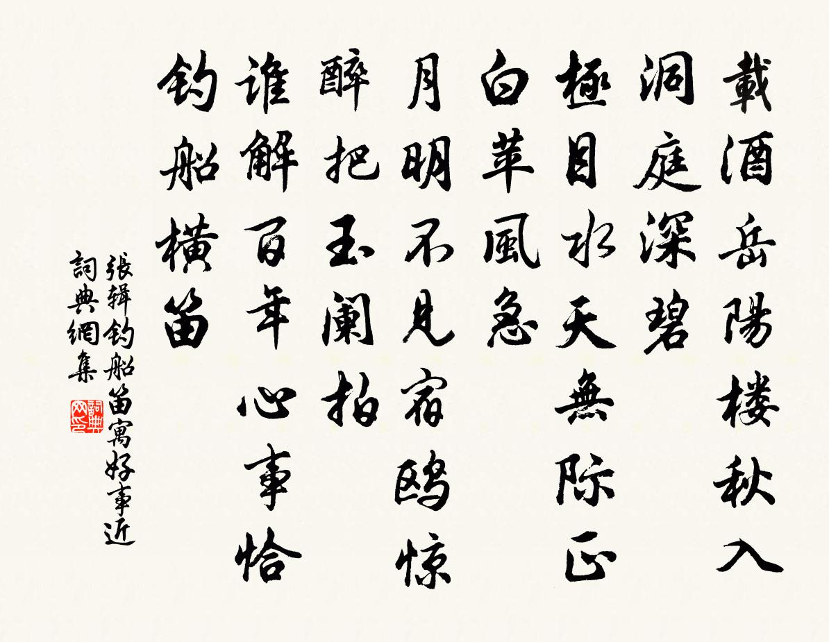 詩詞名句歷史字典書法欣賞書法字典國語詞典說文解字康熙字典古漢語字典標 題 作 者 詩 句 釣船笛(寓好事近)作者:張輯 朝代:宋代釣船笛(寓好事近)原文載酒岳陽樓,秋入洞庭深碧。極目水天無際,正白苹風急。月明不見宿鷗驚,醉把玉闌拍。誰解百年心事,恰釣船橫笛。詩詞問答問:釣船笛(寓好事近)的作者是誰?答:張輯問:釣船笛(寓好事近)寫於哪個朝代?答:宋代問:釣船笛(寓好事近)是什麼體裁?答:詞張輯釣船笛(寓好事近)書法欣賞釣船笛(寓好事近)書法作品詩詞推薦次繆仲右韻二首洪咨夔〔宋代〕心緒千絲結,年華一鳥過。可人元自少,知已不須多。咄咄君休怪,鳴鳴我亦歌。將軍渾健在,醉尉莫誰體。奉和元日應制許敬宗〔唐代〕天正開初節,日觀上重輪。百靈滋景祚,萬玉慶惟新。待旦敷玄造,韜旒御紫宸。武帳臨光宅,文衛象鉤陳。廣庭和永頻出省有日書事王珪〔唐代〕青蔥嘉樹鎖連甍,間憶東樓望遠情。禁壘曉煙浮舊色,御溝春水漱新聲。杯盤冷落留芳草,簾幕陰沈聽亂鶯。漢殿雜曲歌辭古離別王適適〔唐代〕昔歲驚楊柳,高樓悲獨守。今年芳樹枝,孤棲怨別離。珠簾晝不捲,羅幔曉長垂。苦調琴先覺,愁容鏡獨知。頻來和用之題剡雪舒岳祥〔宋代〕鱸魚未上夜潮回,吹備蓬窗古岸隈。誰遣戴公山上住,兩回牽帥子猷來。送曹大夫歸家韓維〔宋代〕飛盡楊花見綠陰,飄然輕蓋返家林。野堂泥落歸雙燕,紋簟風清戲一禽。秀麥柔桑皆有望,高軒華袞久無心。知君龍翔寺閣夜懷渭南張少府喻鳧〔唐代〕春城帶病別,秋塞見除書。況是神仙吏,仍非塵土居。河風吹鳥迥,岳雨滴桐疏。坐閣馳思夕,沙東涼月虛。感事陳與義〔宋代〕喪亂那堪說,干戈竟未休。公卿危左衽,江漢故東流。風斷黃龍府,雲移白鷺洲。云何舒國步,持底副君憂。世事以嗜酒愛風竹卜居此林泉為韻作十小詩方岳〔宋代〕東坡真天人,落筆蓬萊宮。何如赤壁笛,一鶴橫秋風。夏日小集池上韻明甫之作李彌遜〔宋代〕生怕微雲點太清,籜龍莫作斷腸聲。餘霞到晚銖衣薄,滿月當空玉斧成。已結松筠為老伴,不緣蛙黽喚愁生。但令元符二年十一月十六日趙德麟檢校諸邑……寄晁說之〔宋代〕大夫既授玦,捐之湘江中。彼波到此潭,寂寂睡蛟龍。奉和御製筆歌夏竦〔宋代〕製之精兮漢宮之雙管,鋒之妙兮趙國之修毫。自承掌握濟群用,觚與槧兮難施勞。古今岡不達,淑慝將何逃。深仰望書歸/搗練子賀鑄〔宋代〕邊堠遠,置郵稀。附與征衣襯鐵衣。連夜不妨頻夢見,過年惟望得書歸。和王介甫寄安豐知縣修芍陂陳舜俞〔宋代〕雩婁陂水舊風煙,可喜斯民得繼傳。萬頃稻粱追漢日,五門疏鑿似齊年。才高欲獻營田策,公暇還來泛酒船。稱與長安春日感懷強至〔宋代〕誰道關中節候遲,晴川二月繡參差。有期去燕尋歸棟,不改新花發舊枝。宦路飄颻無定所,客顏憔悴異當時。林花祈晴行西湖上呈館中一二同官鄭清之〔宋代〕踏盡紅塵挹翠巒,江湖清夢入雕鞍。蒙蒙蒲霧渾疑雨,惻惻疏風不是寒。野菊頻催花事早,老楓初試葉聲乾。恰知過圓覺院簡照上人晁公溯〔宋代〕一洗糟粕地,再聞鍾梵音。前身老東院,具體小西林。自昔知味少,於今無巷深。是中有妙理,直下試叅尋。秋陰艾性夫〔宋代〕老蟬吟漸懶,愁蚓思無窮。數點菊花雨,一溪茅屋風。苔衣秋井綠,楓纈曉山紅。急索鶉裘補,寒先及老翁。送友人游蜀賈島〔唐代〕萬岑深積翠,路向此中難。欲暮多羈思,因高莫遠看。卓家人寂寞,揚子業凋殘。唯有岷江水,悠悠帶月寒。依韻和邵太子文兄八月總章朝歸長句晁說之〔宋代〕東皇受籙增嘉運,曉坐明堂夜拜章。玉燭千年承瑞露,金龍萬國鎮青霜。風來紫極簫聲靜,人在丹台佩影涼。與子名句推薦雖使鬼神請亡,此猶可以合歡聚眾,取親於鄉里。墨子《墨子·31章 明鬼(下)》 空將漢月出宮門,憶君清淚如鉛水。李賀《金銅仙人辭漢歌》 月色穿簾風入竹,倚屏雙黛愁時。顧敻《臨江仙·月色穿簾風入竹》 世所相信,在能行,不在能言。王永彬《圍爐夜話·第九九則》 好問則裕,自用則小佚名《尚書·商書·仲虺之誥》 村北村南,穀雨才耕遍。秀麥連岡桑葉賤。范成大《蝶戀花·春漲一篙添水面》 青山欲共高人語。聯翩萬馬來無數。辛棄疾《菩薩蠻·金陵賞心亭為葉丞相賦》 讀書破萬卷,下筆如有神。杜甫《奉贈韋左丞丈二十二韻》 有過則改之,未萌則戒之馮夢龍《警世通言·卷三十八》 尋尋覓覓,冷冷清清,淒悽慘慘戚戚。李清照《聲聲慢·尋尋覓覓》