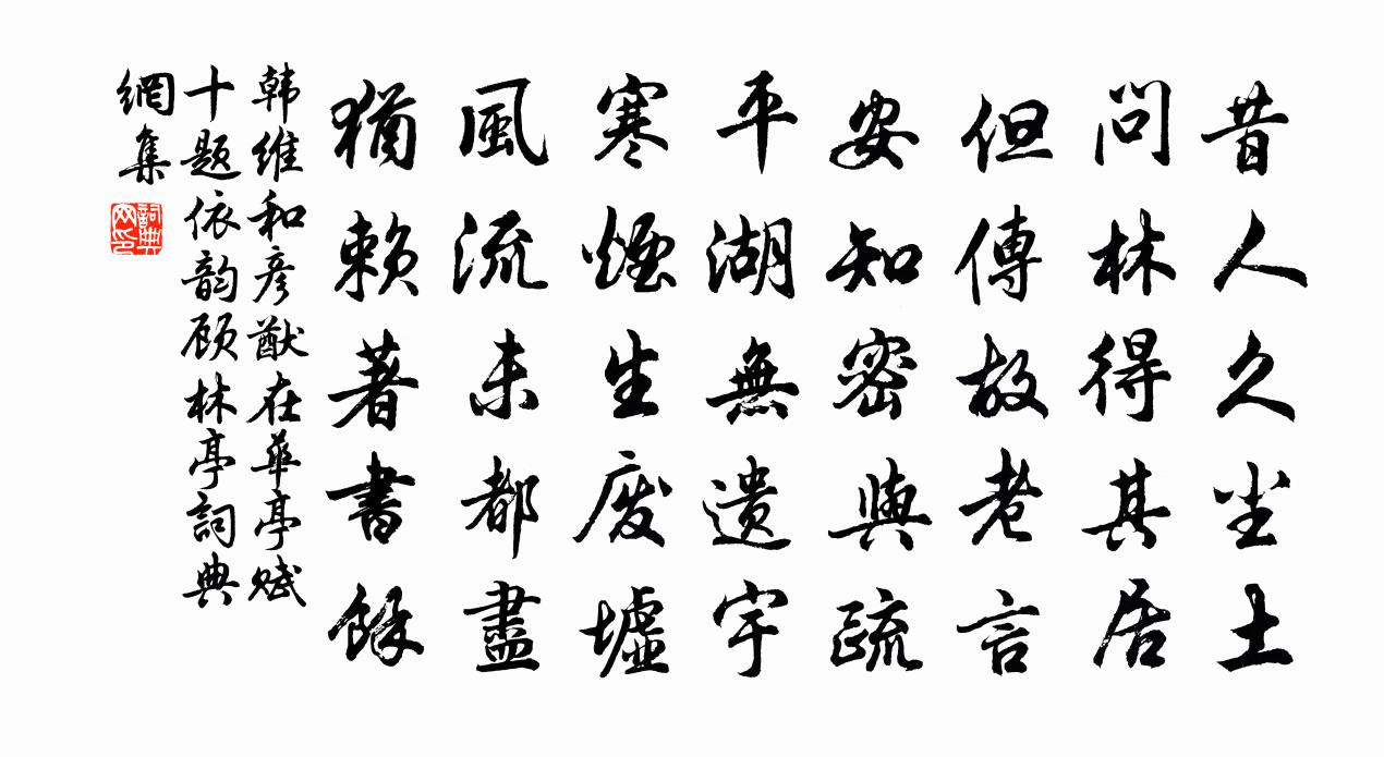 詩詞名句歷史字典書法欣賞書法字典國語詞典說文解字康熙字典古漢語字典標 題 作 者 詩 句 和彥猷在華亭賦十題依韻顧林亭作者:韓維 朝代:宋代原文昔人久塵土,問林得其居。但傳故老言,安知密與疏。平湖無遺宇,寒煙生廢墟。風流未都盡,猶賴著書余。詩詞問答問:《和彥猷在華亭賦十題依韻顧林亭》的作者是誰?答:韓維問:該詩寫於哪個朝代?答:宋代書法欣賞和彥猷在華亭賦十題依韻顧林亭書法作品詩詞推薦滿江紅(赴玉山之謫,與諸父泛舟大澤,分題為別)晁補之〔宋代〕莫話南征,船頭轉、三千餘里。未嘆此、浮生飄蕩,但傷佳會。滿眼青山芳草外,半篙碧水斜陽里。問此中、何處唐合門輓詩三首方回〔宋代〕除布何飄驟,僨亡足敗傷。寧歌紫芝曲,自老白雲鄉。兵息潢池弄,書全屋壁藏。銘碑端不愧,今代蔡中郎。詠鶴五首張嵲〔宋代〕非乾位置異雞群,自是昂藏絕世紛。若使風標公子見,亦應慚恨不如君。聞胡明遠記室將至宋庠〔宋代〕昔嘆都門別,今聞隴坂還。風煙背秦塞,陵邑過時周關。松老忘年契,朱衰玩日顏。須君述征賦,方驗此塗艱。晚春釋守璋〔宋代〕草深煙景重,林茂夕陽微。不雨花猶落,無風絮自飛。蝶戀花陳允平〔宋代〕謝了梨花寒食後。翦翦輕寒,曉色侵書牖。寂寞幽齋惟酌酒。柔條恨結東風手。淺黛嬌黃春色透。薄霧輕煙,遠映燕歸梁杜安世〔宋代〕風擺紅絛卷畫簾。寶鑑慵拈。日高梳洗幾時忺。金盆水,弄纖纖。髻雲松嚲衣斜褪,和嬌懶、瘦岩岩。離愁更被宿由真隱至枕峰寺喻良能〔宋代〕南國清秋杪,長林翠靄重。嬾黃千頃稻,深碧萬株榕。峽水風前急,方山雨後濃。征鞍何所憩,蕭寺枕孤峰。八月十二日夜偕客賞木犀八首陳造〔宋代〕朋來濟濟盡嘉賓,飲興翩翩笑語真。絕勝謫仙邀月醉,當時和影只三人。春暮吟邵雍〔宋代〕春來蝴蝶亂,春去子規啼。安得如前日,和風初扇時。至後承元煇見和複次韻書病中近況十首方回〔宋代〕千金營可致,一句得應難。積債真無奈,成詩且自寬。冰皸窮朔漠,火瘴度甌蠻。不似山中好,歸歟遂掛冠。西江月(賞梅)王之道〔宋代〕雪後千林尚凍,城邊一徑微通。柳梢搖曳轉東風。來看梅花應夢。酒面初潮蟻綠,歌唇半啟櫻紅。冰肌綽約月朦朧曉聞長樂鐘聲戴叔倫〔唐代〕漢苑鐘聲早,秦郊曙色分。霜凌萬戶徹,風散一城聞。已啟蓬萊殿,初朝鴛鷺群。虛心方應物,大扣欲乾雲。近雜菜花乾隆〔清代〕黃萼裳裳綠葉稠,千村欣卜榨新油。愛他生計資民用,不是閒花野草流。送倪正父尚書守南徐樓鑰〔宋代〕君如春柳我如松,晚歲重逢意愈通。日日公餘搜理窟,時時史暇樂談叢。友朋罕有心相照,兄弟惟應姓不同。此別改唱佚名〔唐代〕張公吃酒李公顛,盛六生兒鄭九憐。舍下雄雞失一足,街頭小福拉三拳。風入松侯置〔宋代〕東樓煙重暗山光。春意墮微茫。小紅嫩綠勻如剪,黯無言、雲渡澄江。沒處與人消遣,倚闌情寄斜陽。共君今夜舉下第羅鄴〔唐代〕謾把青春酒一杯,愁襟未信酒能開。江邊依舊空歸去,帝里還如不到來。門掩殘陽鳴鳥雀,花飛何處好池台。此時登楚望北樓張耒〔宋代〕裊裊危樓百尺梯,秋風有客獨攀躋。路窮流水遠更遠,目斷夕陽西復西。簾卷似迎輕燕入,柳深時有暗蟬嘶。洞庭句韓泰〔唐代〕?庾嶺東邊吏隱州,溪山竹樹亦清幽。名句推薦高築牆,廣積糧張廷玉《明史·列傳·卷二十四》 一年好景君須記,最是橙黃橘綠時。蘇軾《贈劉景文 / 冬景》 明月出海底,一朝開光曜。李白《古風·齊有倜儻生》 龍蛇四海歸無所,寒食年年愴客心。屈大均《壬戌清明作》 眾人助之以力,近者結之以成,遠者譽之以名,尊者載之以勢。韓非及後人《韓非子·功名》 雨過一蟬噪,飄蕭松桂秋。杜牧《題揚州禪智寺》 江上往來人,但愛鱸魚美范仲淹《江上漁者》 侵夜鸞開鏡,迎冬雉獻裘。李商隱《陳後宮》 心能辨事非,處事方能決斷;人不忘廉恥,立身自不卑污。王永彬《圍爐夜話·第二十則》 莫避春陰上馬遲。春來未有不陰時。辛棄疾《鷓鴣天·送歐陽國瑞入吳中》