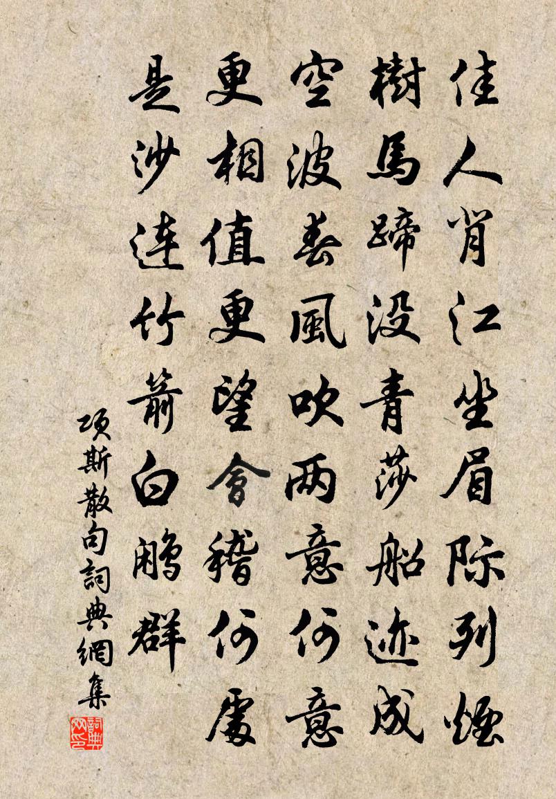 詩詞名句歷史字典書法欣賞書法字典國語詞典說文解字康熙字典古漢語字典標 題 作 者 詩 句 句作者:項斯 朝代:唐代句原文佳人背江坐,眉際列煙樹。馬蹄沒青莎,船跡成空波。春風吹兩意,何意更相值。更望會稽何處是,沙連竹箭白鷳群。詩詞問答問:句的作者是誰?答:項斯問:句寫於哪個朝代?答:唐代問:句是什麼體裁?答:句項斯句書法欣賞句書法作品注釋全唐詩:卷554-98詩詞推薦題李公麟山莊圖其十延華洞蘇轍〔宋代〕共恨春不長,逡巡就搖落。一見洞中天,真知世間惡。道無情尹志平〔元代〕九九嚴凝冰結。山後朔風凜冽。西去意如何。***。道友一聲珍重。慎勿使他心動。志氣要平和。道無魔。過三衢,徐載叔採菊載酒,夜酌走筆二首楊萬里〔宋代〕征塗半月客塵黃,今夕初逢一雨涼。冷笑菊花堪計會,為君八月作重陽。冬至日陪裴端公使君清水堂集皎然〔唐代〕亞歲崇佳宴,華軒照淥波。渚芳迎氣早,山翠向晴多。推往知時訓,書祥辨政和。從公惜日短,留賞夜如何。風幡堂方信孺〔宋代〕確頭一語便投機,若說風幡是落遲。今日堂中容百眾,不知那個可傳衣。菩薩蠻(青陽道中)韓元吉〔宋代〕春殘日日風和雨。煙江目斷春無處。山路有黃鸝。背人相喚飛。解鞍宿酒醒。敧枕殘香冷。夢想小亭東。薔薇何似呈歐陽伯威趙蕃〔宋代〕傳得新詩字字驚,佛廊驟識病身輕。李邕昔已求工部,文舉今宜薦禰衡。只道迷邦尚藍縷,試令吐氣即崢嶸。一官贈道人(一作贈李道士)周賀〔唐代〕布褐高眠石竇春,迸泉多濺黑紗巾。搖頭說易當朝客,落手圍棋對俗人。自算天年窮甲子,誰同雨夜守庚申。擬歸藥軒邵雍〔宋代〕山里藥多人不識,夫君移植更標名。果能醫得人間病,紅紫何妨好近楹。朱買臣徐鈞〔宋代〕長歌負擔久棲棲,一旦高車守會稽。衣錦還鄉成底事,只將富遺耀前妻。和沈潛誠崔氏園九尾龜李復〔宋代〕天生神物非偶然,此龜不知今幾年。世傳一尾直百歲,計應生在晉魏前。長江不掛豫且網,得來佳處游林泉。穹然覽梅聖俞詩編韓維〔宋代〕夙昔誦佳句,跂予慕高風。何意憂艱餘,邂逅此相逢。群初應府辟,捧檄來自東。引車窮檐下,眷然顧微躬。姿表武擔山感事孫應時〔宋代〕襟懷能坦坦,色笑更欣欣。似道黃叔度,草玄揚子云。歸舟真已具,別袂不能分。歲月愁邊雁,飛鳴報客聞。送呈班叔大名司戶司馬光〔宋代〕致遠必自近,如君豈掾曹。魚龍試春浪,松栝露秋毫。錯落辭華富,{左石右堅}{肱月換石}氣節高。垂天起膚正月十五夜蘇味道〔唐代〕火樹銀花合,星橋鐵鎖開。暗塵隨馬去,明月逐人來。游伎皆穠李,行歌徑落梅。金吾夜不禁,玉漏莫相催。詠懷白居易〔唐代〕冉牛與顏淵,卞和與馬遷。或罹天六極,或被人刑殘。顧我信為幸,百骸且完全。五十不為夭,吾今欠數年。知分寄趙慶御陳允平〔宋代〕十年一別雙溪路,君自江南我浙東。彼此有書無雁寄,只應清夢與君同。鳥夜啼 閒適劉敏中〔元代〕日長誰伴中庵。太初*。靜掃閒庭,獨自看晴嵐。嵐翠滴。雲影濕。雨聲酣。欲借昌黎老筆,賦終南。有嘆楊萬里〔宋代〕飽喜飢嗔笑殺儂,鳳皇未可笑狙公。盡逃暮四朝三外,猶在桐花竹實中。夏日陳應求見訪黃公度〔宋代〕酷暑避修竹,繁陰侵短楹。形骸方枕簟,車馬忽柴荊。對酒情無極,喔詩韻更清。昏鴉催別急,天末片雲橫。名句推薦怎不思量,除夢裡、有時曾去趙佶《宴山亭·北行見杏花》 故大國之攻小國也,是交相賊也,過必反於國。墨子《墨子·49章 魯問》 蠟炬風搖簾不下,竹影半牆如畫。項鴻祚《清平樂·池上納涼》 賞賜不能喜,誅罰不能威。墨子《墨子·05章 七患》 迢遞嵩高下,歸來且閉關。王維《歸嵩山作》 威宜自嚴而寬,先寬後嚴者人怨其酷。洪應明《菜根譚·概論》 巧笑東鄰女伴,採桑徑里逢迎。晏殊《破陣子·春景》 關山多雨雪,風水損毛衣。李遠《詠雁》 還與去年人,共藉西湖草。蘇軾《卜運算元·感舊》 掛席幾千里,名山都未逢。孟浩然《晚泊潯陽望廬山》