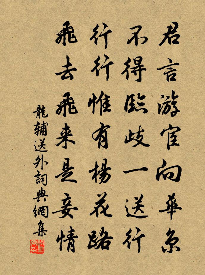 詩詞名句歷史字典書法欣賞書法字典國語詞典說文解字康熙字典古漢語字典標 題 作 者 詩 句 送外作者:龍輔 朝代:宋代送外原文君言遊宦向華京,不得臨歧一送行。行行惟有楊花路,飛去飛來是妾情。詩詞問答問:送外的作者是誰?答:龍輔問:送外寫於哪個朝代?答:宋代龍輔送外書法欣賞送外書法作品詩詞推薦和陶讀山海經十三首韻送機簡堂自景星岩再住吳芾〔宋代〕紛紛學禪者,腰包競奔走。才能脫葛藤,痴意便自負。求其道德尊,如師蓋希有。願傅上乘人,永光臨濟後。訴衷情晏殊〔宋代〕數枝金菊對芙蓉。搖落意重重。不知多少幽怨,和露泣西風。人散後,月明中。夜寒濃。謝娘愁臥,潘令閒眠,心新秋雜題六首坐陸龜蒙〔唐代〕偶避蟬聲來隙地,忽隨鴻影入遼天。閒僧不會寂寥意,道學西方人坐禪。賀洪景茂葉舍試平奏仍勉為南宮之行王邁〔宋代〕喜篋天庠正妙齡,同時行輩半先登。如今纏喜紅心中。當日幾成變腳升。冀北群空看走馬,溟南路闊快摶鵬。歸來下蔡春偶作李中〔唐代〕旅館飄飄類斷蓬,悠悠心緒有誰同。一宵風雨花飛後,萬里鄉關夢自通。多難不堪容鬢改,沃愁惟怕酒杯空。采蘭舟行潘鹹〔唐代〕平沙極浦無人度,猶系孤舟寒草西。半夜起看潮上月,萬山中有一猿啼。南歌子毛滂〔宋代〕暮霰寒依樹,嬌雲冷傍人。江南誰寄一枝春。何似瓏璁十里、更無塵。雨萼胭脂淡,香須蝶子輕。碧山歸路小橋橫渡江司空圖〔唐代〕秋江共僧渡,鄉淚滴船回。一夜吳船夢,家書立馬開。贈益府群官盧照鄰〔唐代〕一鳥自北燕,飛來向西蜀。單棲劍門上,獨舞岷山足。昂藏多古貌,哀怨有新曲。群鳳從之游,問之何所欲。答言雨過行視舍北菜圃因望北村久之陸游〔宋代〕吳牛齧草臥斜陽,烏臼青紅未飽霜。急趁路乾來寓目,十分閒事卻成忙。題薛公肅問梅圖李石〔宋代〕湖風吹衣筇九節,瘦如梅花骨欲折。詩魂別後誰與招,獨立西湖樹邊月。冥漠君墓馬之純〔宋代〕經營東府役紛紛,掘土城壕得古墳。便見雙棺垂欲朽,不知何世了無聞。遂令移殯北墉上,仍與號為冥漠君。萬事劉弟示詩一軸走筆答之梅堯臣〔宋代〕昔與伯氏吟,青銅照人發。今又讀君讀,寒冰徹人骨。時時探古趣,往往到月窟。清濟流不休,終期至溟渤。新茶項安世〔宋代〕夭夭雀舌變槍旗,旟旆旃旌忽四馳。槐火已登新鼎味,松風猶動故園思。森森苦口難追俗,脈脈甘津恐後時。何似蝶戀花(和王廉訪)葛勝仲〔宋代〕風過漣漪紋縠細。十指香檀,驚破交禽睡。野蔌溪毛真易致。風流未減蘭亭會。擊汰千艘供洛禊。映水垂楊,萬縷立春內中帖子詞夫人閣王珪〔唐代〕月殘鳷鵲雪離離,禁里春風自有期。曉憶梅花誰為折,從來不許下瑤墀。南國有佳人鄧林〔宋代〕南國有佳人,仙姿自蓬島。龍綃照明璫,鳳釵橫貴寶。新妝試鸞鏡,皎皎顏色好。芳年倏已笄,君子可偕老。奈何頌古五首釋原妙〔宋代〕出的高原浪拍天,四維上下絕塵煙。分明好個真訊息,未必時人到那邊。水調歌頭朱熹〔宋代〕富貴有餘樂,貧賤不堪憂。誰知天路幽險,倚伏互相酬。請看東門黃犬,更聽華亭清唳,千古恨難收。何似鴟夷子至濟南,李公擇以詩相迎,次其韻二首蘇軾〔宋代〕夜擁笙歌霅水濱,回頭樂事總成塵。今年送汝作太守,到處逢君是主人。聚散細思都是夢,身名漸覺兩非親。相從名句推薦獨有宦遊人,偏驚物候新。杜審言《和晉陵陸丞早春遊望》 明月出天山,蒼茫雲海間。李白《關山月》 雁行緣石徑,魚貫度飛梁。鮑照《代出自薊北門行》 黃鶯百舌正相呼,玉樹後庭花帶雨。牛殳《琵琶行》 善御性者,不違金水之質;善為器者,不易方圓之用。姚察、姚思廉《梁書·列傳·卷二十一》 文死諫,武死戰。曹雪芹《紅樓夢·第三十六回》 有花堪折直須折,莫待無花空折枝。無名氏《雜詩》 人之命在天,國之命在禮荀子《荀子·強國》 月華如練,長是人千里。范仲淹《御街行·秋日懷舊》 凡流言、流說、流事、流謀、流譽、流愬,不官而衡至者,君子慎之荀子《荀子·致士》