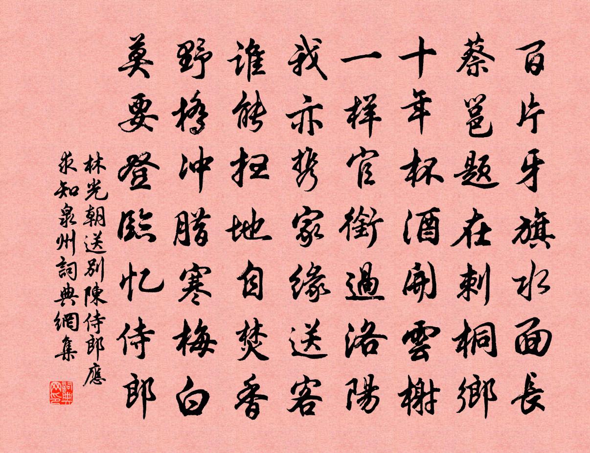 詩詞名句歷史字典書法欣賞書法字典國語詞典說文解字康熙字典古漢語字典標 題 作 者 詩 句 送別陳侍郎應求知泉州作者:林光朝 朝代:宋代送別陳侍郎應求知泉州原文百片牙旗水面長,蔡邕題在刺桐鄉。十年杯酒開雲榭,一樣官銜過洛陽。我亦攜家緣送客,誰能掃地自1*1焚香。野橋沖臘寒梅白,莫要登臨憶侍郎。詩詞問答問:送別陳侍郎應求知泉州的作者是誰?答:林光朝問:送別陳侍郎應求知泉州寫於哪個朝代?答:宋代林光朝送別陳侍郎應求知泉州書法欣賞送別陳侍郎應求知泉州書法作品詩詞推薦歲在鍛丑年始七十年正旦日書事富弼〔宋代〕親賓何用舉椒觸,已覺閒中歲月長。不學香山醉歌舞,只將吟嘯敵流光。許子儒寺丞輓詩二首李彌遜〔宋代〕陰德仙官裔,殊勛輔相家。山川鍾秀麗,人物見雄夸。小試丞卿月,卑棲屬使華。蓋棺何太早,行路亦興嗟。榮華樂(一作東洛梁家謠)李賀〔唐代〕鳶肩公子二十餘,齒編貝,唇激朱。氣如虹霓,飲如建瓴,走馬夜歸叫嚴更。徑穿復道游椒房,龍裘金玦雜花光。秘書弟牽玉羔為壽將以唐律次韻一首劉克莊〔宋代〕玉羔直歲詎能神,羝觸堪嗟命不辰。昔比素絲曾著節,今為白石且眠春。同人挾策安能牧,小弟磨刀恐未仁。六日壽州十詠齋雲亭宋祁〔宋代〕肇允締層宇,岧岧少城隈。憑軒肄師孑,中坐合賓罍。白日披霞上,蒼山障霧回。眷言西北道,吾師安在哉。周尹潛以仆有郢州之命作詩見贈有橫槊之句次陳與義〔宋代〕一歲憂兵四閱時,偷生不恨隙駒馳。如何南紀持竿手,卻把西州破賊旗。儻有青油盛快士,何妨畫戟入新詩。因君雜曲歌辭。壯士行鮑溶〔唐代〕西方太白高,壯士羞病死。心知報恩處,對酒歌易水。砂鴻嗥天末,橫劍別妻子。蘇武執節歸,班超束書起。山河句王隨〔宋代〕事簡曉花香落硯,訟稀晴蘚綠生庭。六言三首劉克莊〔宋代〕南塘登極數袁,平園冊後尾聯。已矣諸老絕筆,勉哉吾子著鞭。贈郭五星若水叔清二首王邁〔宋代〕淮蜀年來殺氣深,中州兵革亦相尋。命懸逆賊狂夫手,憤激孤臣孽子心。人物眇然難倚仗,風濤如此恐胥沉。煩君少年游(壽雲谷謝右司)陳允平〔宋代〕光風懷抱玉精神。不染世間塵。香暖衣篝,歌題彩扇,清似晉時人。柳邊小駐朝天馬,一笑領佳賓。簾卷湖山,花挽羅榷院子遠二章劉鑒〔宋代〕不謂懸弧旦,翻成屬纊期。死同生一視,吊與賀相隨。靈運先成佛,劉叉懶說詩。西風吹獨樹,誰譜鳳鳴枝。洪景伯正字分繡閣謝伋〔宋代〕層屋周遭列岫圍,碧滋紅彩眩睛暉。境中一段明綾出,望外千春碎縷歸。疊嶂分留女媧練,飛流不雜衛文衣。主人雙廟劉子翬〔宋代〕無復連雲戰鼓悲,英風凜凜在雙祠。氣吞驕虜方張日,恨滿孤城欲破時。幽鳥自啼檐際樹,夕陽空照路傍碑。平生偈釋善清〔宋代〕隨隨隨,昔昔昔,隨隨隨後無人識。夜來明月上高峰,元來只是這個賊。丁端公北使梅堯臣〔宋代〕出聘天王使,來乘御史驄。馳車看燕婦,貂扇御胡風。俗與華人似,言從左衽通。罽庭觀拜舞,不以未央中。縣齋有懷(陽山縣齋作,時貞元二十一年順宗新即位)韓愈〔唐代〕少小尚奇偉,平生足悲吒。猶嫌子夏儒,肯學樊遲稼。事業窺皋稷,文章蔑曹謝。濯纓起江湖,綴佩雜蘭麝。悠悠早下蓬嶺陳藻〔宋代〕煙雲深里日攀躋,嶺上宵眠雨電低。清曉攜筇遵下路,高峰對面與胸齊。表兄劉東玉提乾輓詩二首張鎡〔宋代〕襁褓予多疾,三年托謂陽。未能看擊罋,常是戲登床。轉首塵埃里,驚心歲月長。挽兄齎志去,傾淚人詩章。玉樓春辛棄疾〔宋代〕少年才把笙歌。夏日非長秋夜短。因他老病不相饒,把好心情都做懶。故人別後書來勸。乍可停杯強吃飯。云何名句推薦秋來相顧尚飄蓬,未就丹砂愧葛洪。杜甫《贈李白》 花光濃爛柳輕明,酌酒花前送我行。歐陽修《別滁》 驛外斷橋邊,寂寞開無主。陸游《卜運算元·詠梅》 對菊難逢元亮酒,登樓愧乏仲宣才。秋瑾《九日感賦》 偶應非熊兆,尊為帝者師。劉基《題太公釣渭圖》 蛛絲暗鎖紅樓,燕子穿簾處。吳文英《荔枝香近·七夕》 巧偽不如拙誠顏之推《顏氏家訓·名實篇》 烈士暮年,壯心不已。曹操《龜雖壽》 私視使目盲,私聽使耳聾,私慮使心狂。呂不韋《呂氏春秋·紀·季冬紀》 只有精忠能報國,更無樂土可為家。 * 《元旦口占用柳亞子懷人韻》