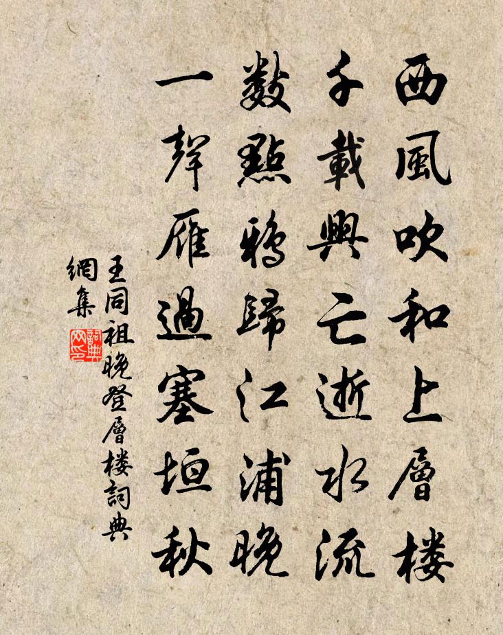 詩詞名句歷史字典書法欣賞書法字典國語詞典說文解字康熙字典古漢語字典標 題 作 者 詩 句 晚登層樓作者:王同祖 朝代:宋代晚登層樓原文西風吹和上層樓,千載興亡逝水流。數點鴉歸江浦晚,一聲雁過塞垣秋。詩詞問答問:晚登層樓的作者是誰?答:王同祖問:晚登層樓寫於哪個朝代?答:宋代王同祖晚登層樓書法欣賞晚登層樓書法作品詩詞推薦臧哀伯諫納郜鼎左丘明〔先秦〕夏四月,取郜大鼎於宋,納於大廟,非禮也。 臧哀伯諫曰:“君人者,將昭德塞違,以臨照百官;猶懼或失之殘臘二首陸游〔宋代〕破臘春先到,微陰日易醺。鳥聲猶寂寂,木意已欣欣。雲起山分疊,風生水蹙紋。斷腸何處笛,偏向醉中聞?以詩句詠梅朔云為斷蜂蝶信方蒙仲〔宋代〕風月本無窮,台觀亦□惡。妙處吾能言,卻恐兒輩覺。高南仲自雲間歸退軒蓋明府以四詩送之末章專孫應時〔宋代〕麗澤存相益,和羹忌敬同。別懷長耿耿,見日苦匆匆。經派懲燕說,詞源味國風。平生子陳了,一瓣記南豐。十六觀經頌上品中生釋遵式〔宋代〕不必受持方等經,解第一義明因果。紫金台現命終時,自見身於台上坐。晚步溪旁示周次顏趙蕃〔宋代〕村醉不能醒,徐行得蹔停。路收泥活活,田擁麥青青。放意知予獨,喔詩賴子聽。要觀溪潦暴,卻畏晚風泠。王將軍墓張玉孃〔宋代〕嶺上松如旗,抉收欠石姿。下有烈乾魂,上有青菟絲。烈士節不改,青松色愈滋。欲識烈士心,千里相思共明月。十八夜宿秀城外趙蕃〔宋代〕月子彎彎四面歌,扁舟今夜泊嘉禾。頗欲歌呼起相和,一聲軋軋又前波。碧潤亭楊塤〔宋代〕妙筆王維圖莫就,多才康樂詠難窮。樓台一族出雲杪,激雪浪生寒澗風。【黃鐘】人月圓 中秋小酌宋褧〔元代〕紅螺香灩金莖露,清興溢璇霄。玉盤光冷,雲鬢霧濕,丹闕煙銷。□□此夜,明年明月,何似今宵。西風喚我,瑤妙智寺明上人他適因得一游董嗣杲〔宋代〕主僧何所往,閒客自來游。山阜秋棱勁,村塍稻把稠。落烏攢梵廡,腥鴿墮經樓。借鼎烹茶去,無人說趙州。遣懷陸游〔宋代〕暮年世事轉悠悠,攬涕悽然類楚囚。不道渾無排遣處,病觀周易悶梳頭。張文忠奉告晴快二帖贊岳珂〔宋代〕上嗣服之初載,首以忠之一字,褒顯邦之臥二人。亦既表百年之宗儒,遂復開千社之舊勛。嗚呼,英衛善用兵,房梁三朝雅樂歌 需雅 七沈約〔南北朝〕備味斯饗惟至聖。鹹降人神禮為盛。或風或雅流歌詠。負鼎言歸啟殷命。悠悠四海同茲慶。菩薩蠻·渚蓮紅亂風翻張孝祥〔宋代〕渚蓮紅亂風翻雨。雨翻風亂紅蓮渚。深處宿幽禽。禽幽宿處深。澹妝秋水鑒。鑒水秋妝澹。明月思情人。情人思月端午帖子皇后閣周必大〔宋代〕寶典推重五,歡聲沸六宮。等閒調玉瑟,聊助舜琴風。送錢規判官歸蜀覲遂之岳陽文同〔宋代〕嚴風吹玉柱,有客動歸裝。古道轉危孤,全家行曉霜。休嗟游薄宦,且喜拜高堂。會合知何所,春江泛楚艎。上元夜效小庾體陳子昂〔唐代〕三五月華新。遨遊逐上春。相邀洛城曲。追宴小平津。樓上看珠妓。車中見玉人。芳宵殊未極。隨意守燈輪。( 滿江紅楊炎正〔宋代〕典盡春衣,也應是、京華倦客。都不記,麴塵香霧,西湖南陌。兒女別時和淚拜,牽衣曾問歸時節。到歸來、稚子孺子歌先秦無名〔先秦〕滄浪之水清兮,可以濯我纓。滄浪之水濁兮,可以濯我足。名句推薦下馬登鄴城,城空復何見。岑參《登古鄴城》 幾度思歸還把酒,拂雲堆上祝明妃。杜牧《題木蘭廟》 亂離何處見,訊息苦難真。吳偉業《遇舊友》 凡兵有四機:一曰氣機,二曰地機,三曰事機,四曰力機。吳起《吳子·論將》 鳥向平蕪遠近,人隨流水東西。劉長卿《謫仙怨·晴川落日初低》 學然後知不足,教然後知困。戴聖《禮記·學記》 三月三日天氣新,長安水邊多麗人。杜甫《麗人行》 烏啼鵲噪昏喬木,清明寒食誰家哭。白居易《寒食野望吟》 寒蟬淒切,對長亭晚,驟雨初歇。柳永《雨霖鈴·寒蟬淒切》 今又重陽,戰地黃花分外香。 * 《採桑子·重陽》