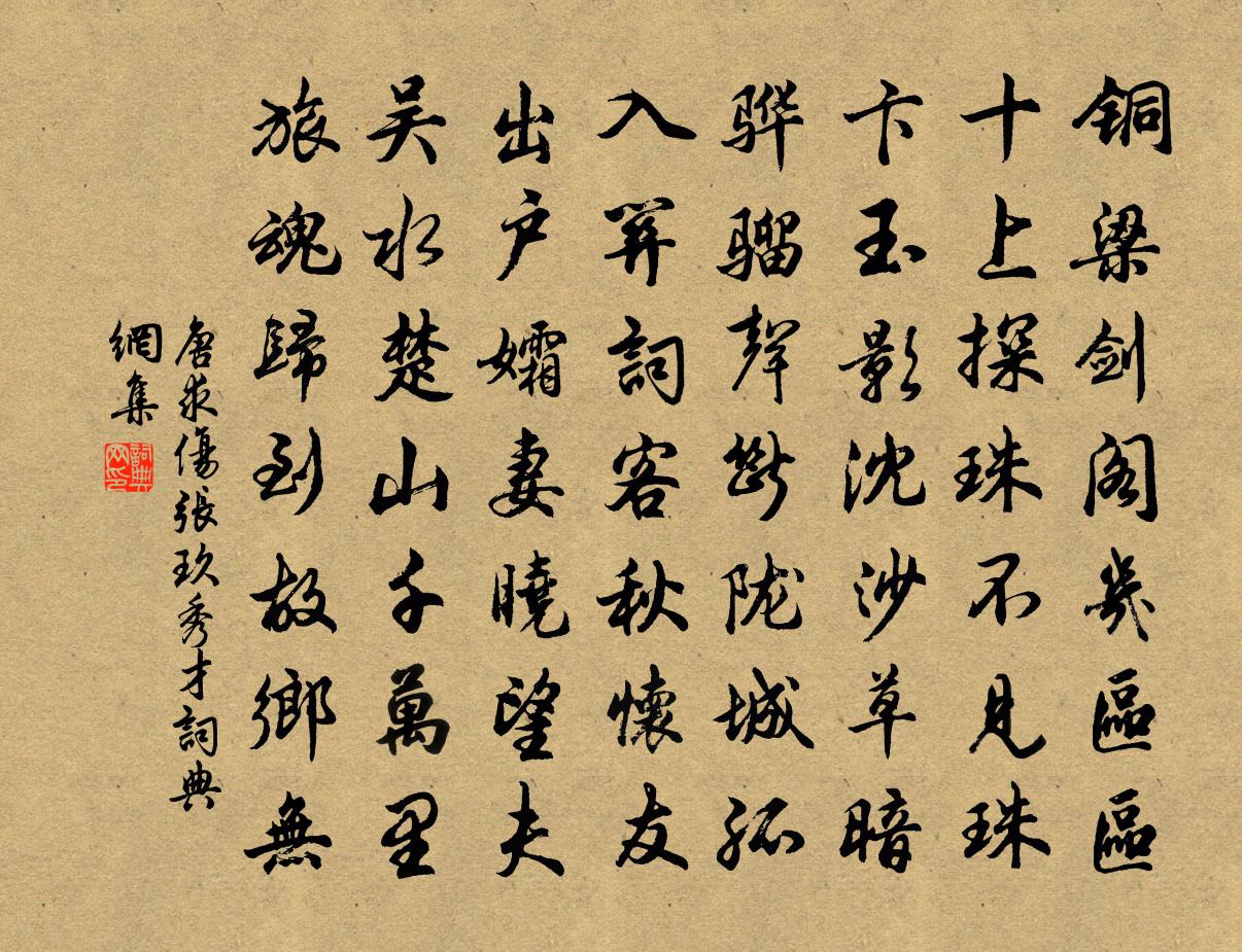 詩詞名句歷史字典書法欣賞書法字典國語詞典說文解字康熙字典古漢語字典標 題 作 者 詩 句 傷張玖秀才作者:唐求 朝代:唐代傷張玖秀才原文銅梁劍閣幾區區,十上探珠不見珠。卞玉影沈沙草暗,驊騮聲斷隴城孤。入關詞客秋懷友,出戶孀妻曉望夫。吳水楚山千萬里,旅魂歸到故鄉無。詩詞問答問:傷張玖秀才的作者是誰?答:唐求問:傷張玖秀才寫於哪個朝代?答:唐代問:傷張玖秀才是什麼體裁?答:七律唐求傷張玖秀才書法欣賞傷張玖秀才書法作品注釋全唐詩:卷724-27詩詞推薦鵲橋仙(和蔡子周)侯置〔宋代〕鶴髮蕭森,玉顏腴潤,養就黃芽金鼎。一區松菊老湘濱,但心遠、何妨人境。袞衣家世,鳴鸞歌舞,到了春冰消盡漫興艾性夫〔宋代〕支離矮屋護松陰,半刻清閒直萬金。蟋蟀叫回秋夢薄,一方涼月道人心。過曾季永見壁間張安國所書天下第一真仙之岩趙蕃〔宋代〕見井渴已止,投林心更欣。行方觸炎熱,坐覺遠塵紛。誰滿鵷鷺集,子猶麋鹿群。融州在何處,壁字帶岩雲。明叔以仆護筍不除作長句為調次韻趙蕃〔宋代〕春風逞夭邪,爛漫吹已足。維暮筍乃生,如亂更約束。吾人為之寄,詎可謾弗錄。況其耿介姿,政已不可辱。去雲壽州李定少卿出餞城東龍潭上蘇軾〔宋代〕山鴉噪處古靈湫,亂沫浮涎繞客舟。未暇燃犀照奇鬼,欲將燒燕出潛虬。使君惜別催歌管,村巷驚呼聚玃猴。此地重登寶公塔復用前韻二首王安石〔宋代〕碧玉旋螺恍隔霄,冠山仙冢亦寥寥。空餘華構延風月,無復靈蹤落市朝。帳座追嚴多獻寶,供盤隨施有操瓢。他方福州內檗送廣州化主釋崇岳〔宋代〕不住煙蘿第一層,翻身要勘嶺南能。謂言檗嶠三千指,不比黃梅七百僧。道中即事方岳〔宋代〕春泥滑滑欲濺裾,肯為梅花顧草廬。喚作詩人看得未,雨笞笠雪一肩輿。贈小窗黃君方回〔宋代〕渾天星斗胸中轉,動地風雷舌上生。想見少年讀書夜,短檠膏盡小窗明。病中得晁應之秋懷詩張耒〔宋代〕西風堂下飛黃葉,病臥空床白日高。疲薾扶行孤竹杖,蕭條隱几兩霜毛。散花有客談真實,燒藥無人過寂寥。怪得送劉司勛奉使梅堯臣〔宋代〕授命出絕域,北至單于庭。馳鳴沙磧遙,馬倦朔雪零。幽州古道上,胡笳應夜聽。嘗聞昔時語,南看北辰星。使回陸君實哀輓方回〔宋代〕亘古無斯事,於今有若人。龍綃同把手,鮫室共沉身。蹈海言能踐,憂天志不伸。曾微一壞土,魚腹瘞君臣。送會侍者開應庵塔銘釋鹹傑〔宋代〕三十餘年沙魘,一十五處脫空。欲彰從前家醜,何妨刻石流通。送羅著作奉使湖湘王禹偁〔宋代〕使星躔次入長沙,曉別延英去路賒。數刻漏中承密旨,幾重湖外奉皇華。山行馬拂湘川石,寺宿僧供嶽麓茶。回日予初謫嶺南過田氏水閣東南一峰豐下銳上俚人蘇軾〔宋代〕倚天巉絕玉浮屠,肯與彭郎作小姑。獨秀江南知有意,要三二別四三壺。新灣劉子翬〔宋代〕苒苒寒生水面煙,吳歌唱罷月微偏。停橈又向灣前宿,一夜西風浪打船。金蓮步羅必元〔宋代〕金陵佳麗不虛傳,浦浦荷花水上仙。未會與民同樂意,卻於宮裹看金蓮。春曉李中〔唐代〕殘燭猶存月尚明,幾家幃幌夢魂驚。星河漸沒行人動,歷歷林梢百舌聲。舊愁朱淑真〔宋代〕銀屏屈曲障春風,獨抱寒衾睡正濃。啼鳥一聲驚破夢,亂愁依舊鎖眉峰。樂隱蘇泂〔宋代〕橘隱仙人是乃翁,幾年涵養在其中。商顏不出渾無事,安得開禧第一功。名句推薦青山相待,白雲相愛,夢不到紫羅袍共黃金帶宋方壺《山坡羊·道情》 天時懟兮威靈怒,嚴殺盡兮棄原野。屈原《國殤》 竹色溪下綠,荷花鏡里香。李白《別儲邕之剡中》 青山欲共高人語。聯翩萬馬來無數。辛棄疾《菩薩蠻·金陵賞心亭為葉丞相賦》 望斷行雲無覓處,夢回明月生南浦。司馬槱《黃金縷·妾本錢塘江上住》 獨立揚新令,千營共一呼。盧綸《和張僕射塞下曲·其一》 不成拋擲,夢裡終相覓。王國維《點絳唇·屏卻相思》 欸乃一聲山水綠。回看天際下中流,岩上無心雲相逐柳宗元《漁翁》 誰向若耶溪上,倩美人西去,麋鹿姑蘇。辛棄疾《漢宮春·會稽蓬萊閣懷古》 笑拈芳草不知名,乍凌波、斷橋西堍。吳文英《西子妝慢·湖上清明薄游》