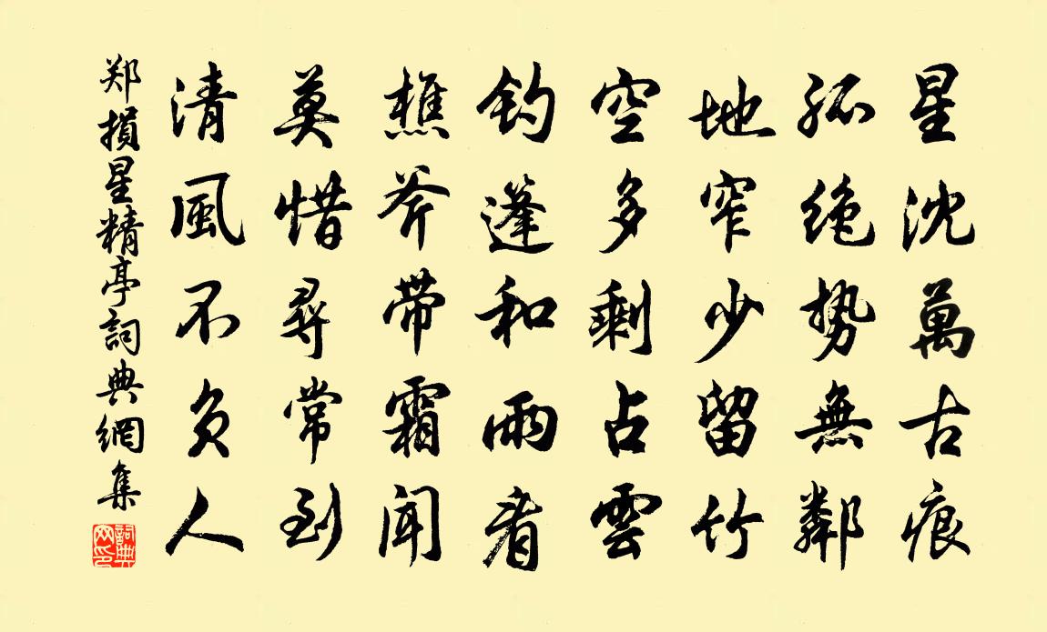 詩詞名句歷史字典書法欣賞書法字典國語詞典說文解字康熙字典古漢語字典標 題 作 者 詩 句 星精亭作者:鄭損 朝代:唐代星精亭原文星沈萬古痕,孤絕勢無鄰。地窄少留竹,空多剩占雲。釣篷和雨看,樵斧帶霜聞。莫惜尋常到,清風不負人。詩詞問答問:星精亭的作者是誰?答:鄭損問:星精亭寫於哪個朝代?答:唐代問:星精亭是什麼體裁?答:五律鄭損星精亭書法欣賞星精亭書法作品注釋全唐詩:卷667-1詩詞推薦蘇稽鎮客舍范成大〔宋代〕送客都回我獨前,何人開此竹間軒?灘聲悲壯夜蟬咽,併入小窗供不眠智子疑鄰韓非〔先秦〕宋有富人,天雨牆壞。其子曰:“不築,必將有盜。”其鄰人之父亦云。暮而果大亡其財,其家甚智其子,而疑鄰舍侄來高翥〔宋代〕自從清曉至黃昏,閒坐閒眠深閉門。猶子雨中來息擔,老夫鐙下起開樽。故山墳墓何人守,舊宅園亭幾處存。問答吉祥草王相〔宋代〕得名良不惡,蕭灑在山房。生意無休息,存心固久長。風霜徒自老,蜂蝶為誰忙。歲晚何人問,山空暮雨荒。月河袁說友〔宋代〕路轉雙溪曲,河灣一逕通。清秋楊柳月,落日芰荷風。直抵濯纓水,當前文筆峰。滿城佳氣聚,擢秀美群公。讀改元詔口號戴復古〔宋代〕國以人為重,人惟德可招。九重方厲政,諸老盡歸朝。盛事追三代,清風動百僚。切聞天上語,歡喜到漁樵。戲題林靈素書像佚名〔宋代〕當日先生在市塵,世人那識是真仙。只因學得飛升後,難犬隨也上天。經史閣李廌〔宋代〕隱君扁舟離五湖,初聞邑子驚陶朱。多金不用五{左牛右孛}術,高閣惟藏萬卷書。牙籤玉軸比四庫,縹帙錦囊過第一溪山陳宓〔宋代〕萬家樓觀巧迴環,紫翠泓澄俯仰間。莫道七閩無好境,東南第一此家山。葛仙茗園胡融〔宋代〕絕巘匿精廬,蒼煙路孤迥。草秀仙翁園,春風坼幽茗。野僧四五人,腦紺瞳子炯。攜壺汲飛瀑,呼我烹石鼎。風濤別袁州司戶司馬行二首彭龜年〔宋代〕四海司馬氏,大州從事賢。剸裁無劇務,抑鬱已三年。人在甘棠里,夢回春草邊。知音有當路,何日踐英躔。鸚鵡螺歐陽修〔宋代〕大哉滄海何茫茫,天地百寶皆中藏。牙須甲角爭光鋩,腥風怪雨灑幽荒。珊瑚玲瓏巧綴裝,珠宮貝闕爛煌煌。泥居浣溪沙蘇軾〔宋代〕明日酒醒,雪大作,又作二首覆塊青青麥未蘇。江南雲葉暗隨車。臨皋煙景世間無。雨腳半收檐斷線,雪林初下瓦紹興二十八年祀圜丘學士院〔宋代〕丕鑠帝皇,復受天命。群陰獨黷,一武大定。奠引斯聲,功歌在詠。佑記後人,文軌蚤正。過黃園趙汝鐩〔宋代〕黃家亭館人稱好,杖屨春風領客行。開放園門千嶂入,愛他山閣一溪橫。花 * 翅雙飛蝶,柳露金衣百囀鶯。酒後雨中覓句史彌寧〔宋代〕春鋤似厭覓詩材,飛向溪心喚不回。賴有漁翁相尉薦,雨中撐得篇來。挽莫子晉丈孫應時〔宋代〕少日從諸老,丁年重一鄉。塤篪鳴正樂,蘭玉秀成行。坐客多匡鼎,途人說鄭莊。哀哀晚何事,衰病訖淒涼。徑山晁補之〔宋代〕盤崖繞壑步步高,仆痡馬乏遊人勞。五峰崛起乾雲霄,眾山奔走爭來朝。我行直欲犯星杓,意徹絕頂才山腰。松間寄許下前管記王侍御譚用之〔唐代〕昔年南去得娛賓,頓遜杯前共好春。蟻泛羽觴蠻酒膩,鳳銜瑤句蜀箋新。花憐游騎紅隨轡,草戀徵車碧繞輪。別後寄玉澗王偘〔宋代〕山中之樂屬高人,風月無邊取次吟。但使胸中飽丘壑,莫將片點著埃塵。名句推薦離情被橫笛,吹過亂山東。王安石《江上》 欸乃一聲山水綠。回看天際下中流,岩上無心雲相逐柳宗元《漁翁》 幽徑無人獨自芳,此恨憑誰訴。曹組《卜運算元·蘭》 乍咽涼柯,還移暗葉,重把離愁深訴王沂孫《齊天樂·蟬》 銀燭秋光冷畫屏,輕羅小扇撲流螢。杜牧《秋夕》 悲歌可以當泣,遠望可以當歸。佚名《悲歌》 風暖鳥聲碎,日高花影重。杜荀鶴《 * 怨》 執手相看淚眼,竟無語凝噎。柳永《雨霖鈴·寒蟬淒切》 增冰峨峨,飛雪千里些。屈原《招魂》 兩岸人家微雨後,收紅豆,樹底纖纖抬素手。歐陽炯《南鄉子·路入南中》