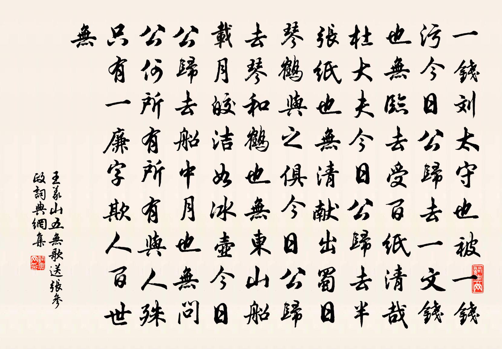 詩詞名句歷史字典書法欣賞書法字典國語詞典說文解字康熙字典古漢語字典標 題 作 者 詩 句 五無歌送張參政作者:王義山 朝代:宋代五無歌送張參政原文一錢劉太守,也被一錢污。今日公歸去,一文錢也無。臨去受百紙,清哉杜大夫。今日公歸去,半張紙也無。清獻出蜀日,琴鶴與之俱。今日公歸去,琴和鶴也無。東山船載月,皎潔如冰壺。今日公歸去,船中月也無。問公何所有,所有與人殊。只有一廉字,欺人百世無。詩詞問答問:五無歌送張參政的作者是誰?答:王義山問:五無歌送張參政寫於哪個朝代?答:宋代王義山五無歌送張參政書法欣賞五無歌送張參政書法作品詩詞推薦梅張鎡〔宋代〕冒寒崗路透溪橋,驢仆翩翩葉亂飄。還是去年初見處,青旗茅店恰相招。聲聲慢郭居安〔宋代〕捷書連晝,甘灑通宵,新來喜沁堯眉。許大擔當,人間佛力須彌。年年八月八日,長記他、三月三時。平生事,想山茶王之道〔宋代〕開花不與眾芳期,先得江梅破白時。犀甲鶴頭微帶雪,畫屏曾見兩三枝。偶題喻良能〔宋代〕少陵五十六,負暄候樵牧。我今年與齊,而亦處幽獨。小亭數椽淨,新月半鉤曲。聊將萬斛愁,付與一杯綠。次韻張君倚春郊且速東山之游衛博〔宋代〕瀲色嵐光暖更妍,陰晴恰稱養花天。惱人春事濃於酒,得意莎茵軟勝綿。欲把風光供翰墨,直須仗屨躡雲煙。知君丁卯元日十首劉克莊〔宋代〕禮成雖曰非常慶,聖敬居然不已純。玉女宓妃猶屏欲,先開梅廈訪儒臣。聽子善琴釋行海〔宋代〕青松宿鶴磵泉流,雲意遲遲山意秋。一曲廣陵休盡奏,月寒天地古人愁。野飲呈祝山甫華岳〔宋代〕野影何須買,山花不待培。幕天分古木,裀地得蒼苔。酒上鶯調曲,餚空鵲墮梅。一壺隨所適,何處問蓬萊。木蘭花庾傳素〔唐代〕木蘭紅艷多情態,不似凡花人不愛。移來孔雀檻邊栽,折向鳳凰釵上戴。是何芍藥爭風彩,自共牡丹長作對。若教極相思呂渭老〔宋代〕拂牆花影飄紅。微月辨簾櫳。香風滿袖,金蓮印步,狹逕迎逢。笑面乍開遠斂翠,正花時、卻恁西東。別房初睡,酬張三十秀才見贈司馬光〔宋代〕樸學居人後,清塗忝從先。瓠因無用棄,木為不才全。比得林泉趣,仍衣邑里賢。自慚頭半白,方解賦歸田。陂麥王安石〔宋代〕陂麥連雲慘澹黃,綠 * 巷不多涼。更無一片桃花在,借問春歸有底忙。春遊元稹〔唐代〕酒戶年年減,山行漸漸難。欲終心懶慢,轉恐興闌散。鏡水波猶冷,稽峰雪尚殘。不能辜物色,乍可 * 。遠目高司業二首張嵲〔宋代〕旌頭落盡少微明,追復成均雅頌聲。詔起儒宗高一代,禮隆師範表諸生。拾遺柱史當螭立,潤色綸言倚馬成。行氫聞胡少汲再入省晁說之〔宋代〕南宮妙極天下選,雞舌喜君重得香。既自能詩似前輩,何為不作水曹郎。贈張琪君章晃沖之〔宋代〕春風頗清識,評議登草木。燕麥與菟葵,種種承標目。如何桃李姿,結根滯空谷。我將俎豆之,折泄恐不欲。君且龍興客旅效子美寓居同谷七歌李新〔宋代〕蕭蕭角聲疊疊鼓,招提曠蕩漾無環堵。編蓬懸席不遮攔,西面透風東面雨。官歸庇身無一瓦,反更罹此百憂苦。嗚次韻張當進題神君廟李石〔宋代〕桂楫方東泛,荷衣已出塵。曲江尋相業,猶是姓張人。久過重陽菊英粲然即事十首方回〔宋代〕早伴茱萸插帽紗,尚堪薦酒更堪茶。花邊行立花邊坐,不是閒花是菊花。贈筆工周永年二首曾豐〔宋代〕豈無毫忽補於時,用盡初心卒見遺。不拔一毛徒自利,楊朱作計未為痴。名句推薦當時相候赤欄橋,今日獨尋黃葉路。周邦彥《玉樓春·桃溪不作從容住》 何事非相思,江上葳蕤竹。吳均《登二妃廟》 正己而不求於人則無怨。上不怨天,下不尤人。子思《中庸·第十四章》 漫惹爐煙雙袖紫,空將酒暈一衫青。納蘭性德《浣溪沙·伏雨朝寒愁不勝》 不仁而富,謂之不幸。牆隙而高,其崩必疾也。范曄《後漢書·列傳·方術列傳上》 雨過橫塘水滿堤,亂山高下路東西。曾鞏《城南·雨過橫塘水滿堤》 物莫非指,而指非指。公孫龍《公孫龍子·指物論》 松江上,念故人老矣,甘臥閒雲。吳文英《沁園春·送翁賓暘游鄂渚》 野店垂楊步,荒祠苦竹叢。范成大《寒食郊行書事》 疑人勿使,使人勿疑脫脫《金史·本紀·卷四》
