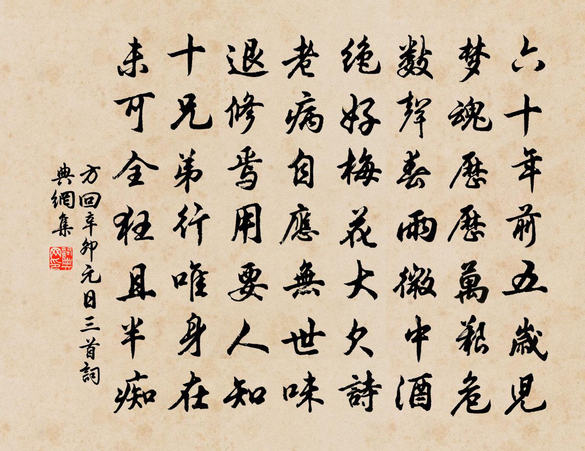 詩詞名句歷史字典書法欣賞書法字典國語詞典說文解字康熙字典古漢語字典標 題 作 者 詩 句 辛卯元日三首作者:方回 朝代:宋代辛卯元日三首原文六十年前五歲兒,夢魂歷歷萬艱危。數聲春雨微中酒,絕好梅花大欠詩。老病自應無世味,退修焉用要人知。十兄弟行唯身在,未可全狂且半痴。詩詞問答問:辛卯元日三首的作者是誰?答:方回問:辛卯元日三首寫於哪個朝代?答:宋代方回辛卯元日三首書法欣賞辛卯元日三首書法作品詩詞推薦種梅史文卿〔宋代〕呼僮耕雲種瑤樹,斗掛青冥下風露。隔林野鶴不知寒,為我飛來復飛去。風流子陳允平〔宋代〕殘夢繞林塘。詩添瘦、瘦不似東陽。正流水盪紅,暗通幽徑,嫩篁翻翠,斜映回牆。對握寶箏低度曲,銷蠟靚新簧孟子天爵陳普〔宋代〕天爵在人非我有,重輕取予系於人。要知良貴人難奪,德義尊榮本自身。表侄趙文鼎監稅傳才拙所定九品杜詩說正宗作龐謙孺〔宋代〕平生竭力參時句,久矣冥搜見機杼。豈惟蘊蓄徹遮欄,要使幽深盡呈露。君今學詩叩妙理,頗已具眼識精粗。他年偈頌一百零一首釋慧性〔宋代〕獨標萬象,物外宣揚。天長地久,地久天長。木蘭花慢 斷橋殘雪周密〔宋代〕覓梅花信息,擁吟袖、暮鞭寒。自放鶴人歸,月香水影,詩冷孤山。等閒。冸寒睍暖,看融城、御水到人間。瓦隴偈二十二首釋洵〔宋代〕髑髏捻碎眼睛寒,便把南辰對北看。無限風流慵賣弄,乘時推倒鐵圍山。金陵雜興二百首蘇泂〔宋代〕青山渺渺水迢迢,王氣千年久未消。獨客重來睹風景,江頭猶有女 * 。又戲答絕句白居易〔唐代〕狂夫與我兩相忘,故態些些亦不妨。縱酒放歌聊自樂,接輿爭解教人狂。九日趙蕃〔宋代〕今年重九日,舟楫次蘭谿。懷古心雖壯,登高思卻迷。山空分向背,木落盡高低。多少覉棲恨,寒猿斷續啼。和方有懷孤鴛鴦詩錢秉鐙〔清代〕十首詩成盡可憐,憐他隻影小窗前。也知嶺外歸來客,獨宿松間十七年。又范祖禹〔宋代〕奕世登公袞,群生入化鈞。須知盛德後,宜有正家人。令日垂門帨,清風采澗苹。兒孫環坐側,歲歲祝千春。有懷介然偶作因記之吳則禮〔宋代〕介然平生三隻襪,意行跛跛復挈挈。上懶把椎拂拿卻,過淮來昔伴僧伽。長命女·春日宴馮延巳〔唐代〕春日宴,綠酒一杯歌一遍。再拜陳三願:一願郎君千歲,二願妾身常健,三願如同樑上燕,歲歲長相見。游洞霄韓松〔宋代〕去城十里蔚山川,欲界仙都自古傳。一□孤掌青突兀,群峰九鎖翠盤旋。能通玄蓋分精路,未數仇池小有天。欲洗句張釜〔宋代〕登臨思渺然。送靈石齊物長老釋如珙〔宋代〕方丈守職莫輕忽,自然久久見全功。楊岐只是會監寺,踢出驢兒振祖風。閱城壁吳潛〔宋代〕內江外海四周圍,正是綢繆戶牖時。北瞰登萊山不礙,東漸倭麗汛難期。未須鷂鷁增威勢,已覺狂鼯受指麾。敢謂落第西還別魏四懍陳子昂〔唐代〕轉蓬方不定。落羽自驚弦。山水一為別。歡娛復幾年。離亭暗風雨。征路入雲煙。還因北山逕。歸守東陂田。頌古三十九首釋道樞〔宋代〕舊歲新年作問端,同安從此放顢頇。憑杖高樓莫吹笛,大家留取倚蘭乾。名句推薦山不在高,有仙則名水不在深,有龍則靈劉禹錫《陋室銘》 遠書歸夢兩悠悠,只有空床敵素秋。李商隱《端居》 天涯地角有窮時,只有相思無盡處。晏殊《玉樓春·春恨》 更吹羌笛關山月,無那金閨萬里愁王昌齡《從軍行七首》 滿月飛明鏡,歸心折大刀。杜甫《八月十五夜月二首》 求個良心管我,留些餘地處人。王永彬《圍爐夜話·第四七則》 浮天滄海遠,去世法舟輕。錢起《送僧歸日本》 蘭生幽谷,不為莫服而不芳。舟在江海,不為莫乘而不浮。君子行義,不為莫知而止休。劉安及其門客《淮南子·說山訓》 聽元宵,往歲喧譁,歌也千家,舞也千家。王磐《古蟾宮·元宵》 湖上春既早,田家日不閒。丘為《題農父廬舍》